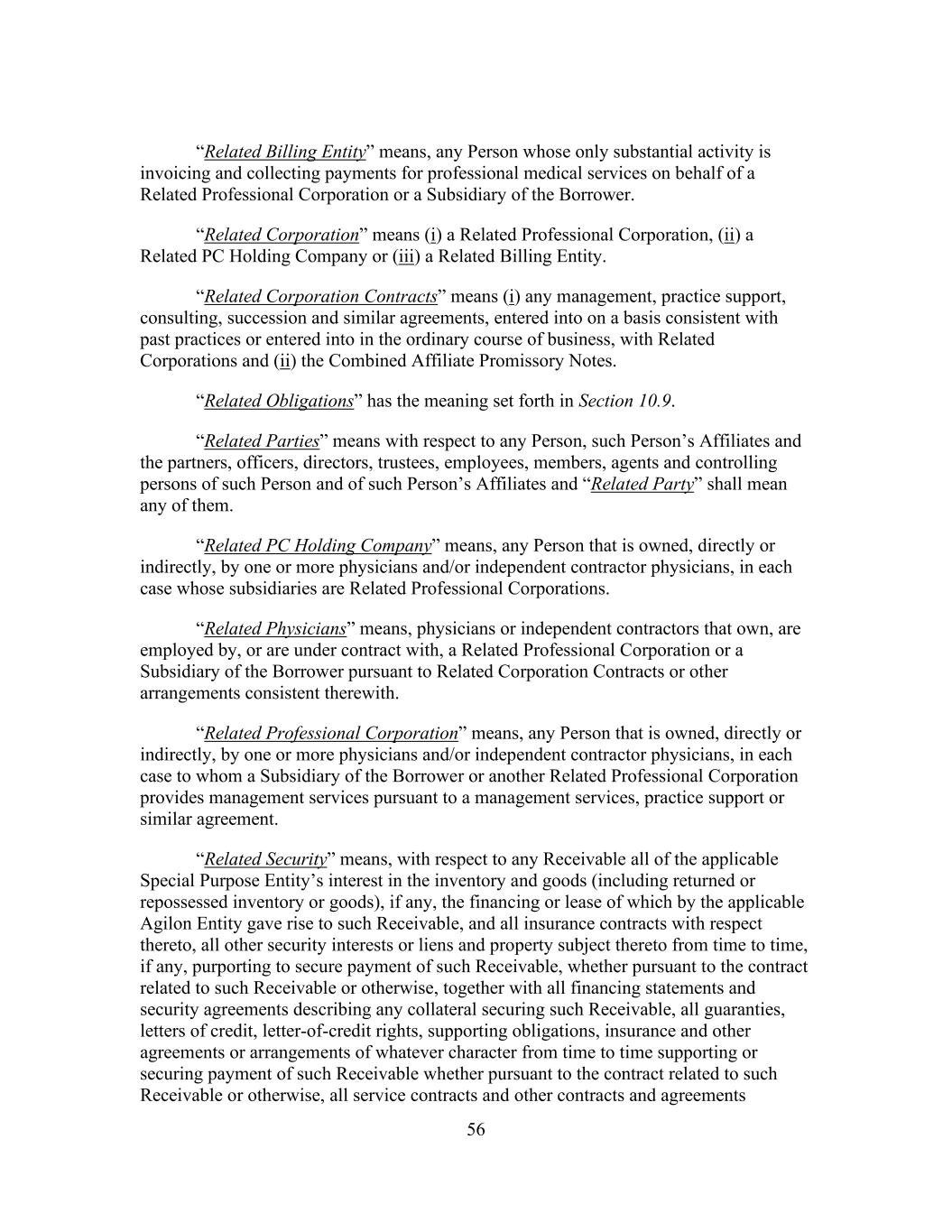 56 “Related Billing Entity” means, any Person whose only substantial activity is invoicing and collecting payments for professional medical services on behalf of a Related Professional Corporation or a Subsidiary of the Borrower. “Related Corporation” means (i) a Related Professional Corporation, (ii) a Related PC Holding Company or (iii) a Related Billing Entity. “Related Corporation Contracts” means (i) any management, practice support, consulting, succession and similar agreements, entered into on a basis consistent with past practices or entered into in the ordinary course of business, with Related Corporations and (ii) the Combined Affiliate Promissory Notes. “Related Obligations” has the meaning set forth in Section 10.9. “Related Parties” means with respect to any Person, such Person’s Affiliates and the partners, officers, directors, trustees, employees, members, agents and controlling persons of such Person and of such Person’s Affiliates and “Related Party” shall mean any of them. “Related PC Holding Company” means, any Person that is owned, directly or indirectly, by one or more physicians and/or independent contractor physicians, in each case whose subsidiaries are Related Professional Corporations. “Related Physicians” means, physicians or independent contractors that own, are employed by, or are under contract with, a Related Professional Corporation or a Subsidiary of the Borrower pursuant to Related Corporation Contracts or other arrangements consistent therewith. “Related Professional Corporation” means, any Person that is owned, directly or indirectly, by one or more physicians and/or independent contractor physicians, in each case to whom a Subsidiary of the Borrower or another Related Professional Corporation provides management services pursuant to a management services, practice support or similar agreement. “Related Security” means, with respect to any Receivable all of the applicable Special Purpose Entity’s interest in the inventory and goods (including returned or repossessed inventory or goods), if any, the financing or lease of which by the applicable Agilon Entity gave rise to such Receivable, and all insurance contracts with respect thereto, all other security interests or liens and property subject thereto from time to time, if any, purporting to secure payment of such Receivable, whether pursuant to the contract related to such Receivable or otherwise, together with all financing statements and security agreements describing any collateral securing such Receivable, all guaranties, letters of credit, letter-of-credit rights, supporting obligations, insurance and other agreements or arrangements of whatever character from time to time supporting or securing payment of such Receivable whether pursuant to the contract related to such Receivable or otherwise, all service contracts and other contracts and agreements