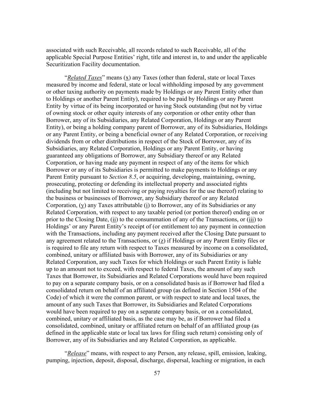 57 associated with such Receivable, all records related to such Receivable, all of the applicable Special Purpose Entities’ right, title and interest in, to and under the applicable Securitization Facility documentation. “Related Taxes” means (x) any Taxes (other than federal, state or local Taxes measured by income and federal, state or local withholding imposed by any government or other taxing authority on payments made by Holdings or any Parent Entity other than to Holdings or another Parent Entity), required to be paid by Holdings or any Parent Entity by virtue of its being incorporated or having Stock outstanding (but not by virtue of owning stock or other equity interests of any corporation or other entity other than Borrower, any of its Subsidiaries, any Related Corporation, Holdings or any Parent Entity), or being a holding company parent of Borrower, any of its Subsidiaries, Holdings or any Parent Entity, or being a beneficial owner of any Related Corporation, or receiving dividends from or other distributions in respect of the Stock of Borrower, any of its Subsidiaries, any Related Corporation, Holdings or any Parent Entity, or having guaranteed any obligations of Borrower, any Subsidiary thereof or any Related Corporation, or having made any payment in respect of any of the items for which Borrower or any of its Subsidiaries is permitted to make payments to Holdings or any Parent Entity pursuant to Section 8.5, or acquiring, developing, maintaining, owning, prosecuting, protecting or defending its intellectual property and associated rights (including but not limited to receiving or paying royalties for the use thereof) relating to the business or businesses of Borrower, any Subsidiary thereof or any Related Corporation, (y) any Taxes attributable (i) to Borrower, any of its Subsidiaries or any Related Corporation, with respect to any taxable period (or portion thereof) ending on or prior to the Closing Date, (ii) to the consummation of any of the Transactions, or (iii) to Holdings’ or any Parent Entity’s receipt of (or entitlement to) any payment in connection with the Transactions, including any payment received after the Closing Date pursuant to any agreement related to the Transactions, or (z) if Holdings or any Parent Entity files or is required to file any return with respect to Taxes measured by income on a consolidated, combined, unitary or affiliated basis with Borrower, any of its Subsidiaries or any Related Corporation, any such Taxes for which Holdings or such Parent Entity is liable up to an amount not to exceed, with respect to federal Taxes, the amount of any such Taxes that Borrower, its Subsidiaries and Related Corporations would have been required to pay on a separate company basis, or on a consolidated basis as if Borrower had filed a consolidated return on behalf of an affiliated group (as defined in Section 1504 of the Code) of which it were the common parent, or with respect to state and local taxes, the amount of any such Taxes that Borrower, its Subsidiaries and Related Corporations would have been required to pay on a separate company basis, or on a consolidated, combined, unitary or affiliated basis, as the case may be, as if Borrower had filed a consolidated, combined, unitary or affiliated return on behalf of an affiliated group (as defined in the applicable state or local tax laws for filing such return) consisting only of Borrower, any of its Subsidiaries and any Related Corporation, as applicable. “Release” means, with respect to any Person, any release, spill, emission, leaking, pumping, injection, deposit, disposal, discharge, dispersal, leaching or migration, in each