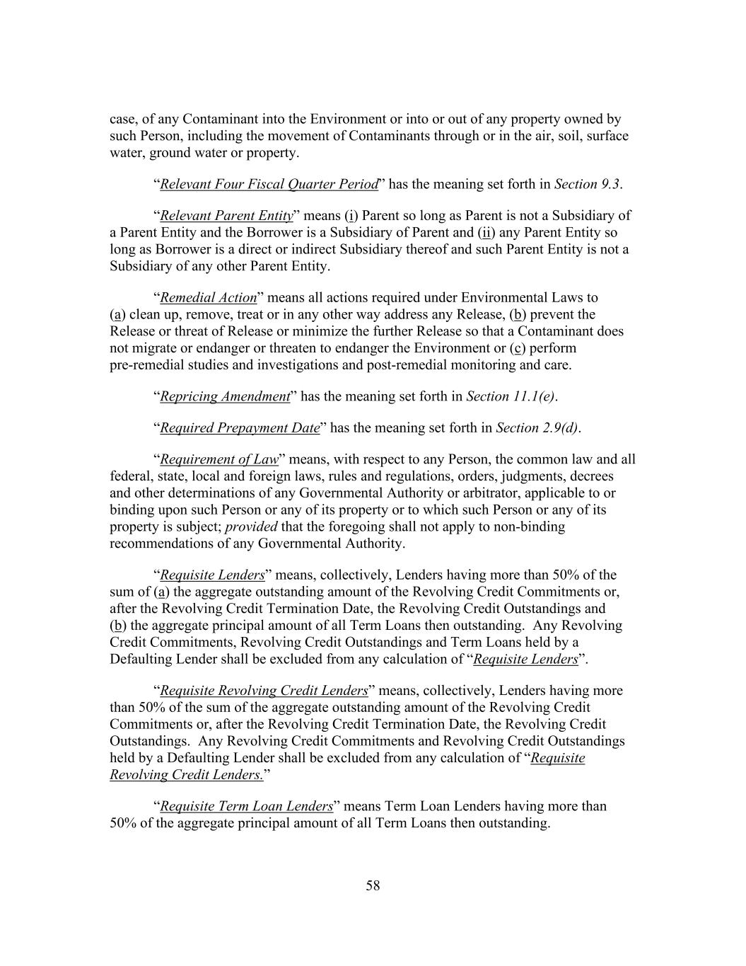 58 case, of any Contaminant into the Environment or into or out of any property owned by such Person, including the movement of Contaminants through or in the air, soil, surface water, ground water or property. “Relevant Four Fiscal Quarter Period” has the meaning set forth in Section 9.3. “Relevant Parent Entity” means (i) Parent so long as Parent is not a Subsidiary of a Parent Entity and the Borrower is a Subsidiary of Parent and (ii) any Parent Entity so long as Borrower is a direct or indirect Subsidiary thereof and such Parent Entity is not a Subsidiary of any other Parent Entity. “Remedial Action” means all actions required under Environmental Laws to (a) clean up, remove, treat or in any other way address any Release, (b) prevent the Release or threat of Release or minimize the further Release so that a Contaminant does not migrate or endanger or threaten to endanger the Environment or (c) perform pre-remedial studies and investigations and post-remedial monitoring and care. “Repricing Amendment” has the meaning set forth in Section 11.1(e). “Required Prepayment Date” has the meaning set forth in Section 2.9(d). “Requirement of Law” means, with respect to any Person, the common law and all federal, state, local and foreign laws, rules and regulations, orders, judgments, decrees and other determinations of any Governmental Authority or arbitrator, applicable to or binding upon such Person or any of its property or to which such Person or any of its property is subject; provided that the foregoing shall not apply to non-binding recommendations of any Governmental Authority. “Requisite Lenders” means, collectively, Lenders having more than 50% of the sum of (a) the aggregate outstanding amount of the Revolving Credit Commitments or, after the Revolving Credit Termination Date, the Revolving Credit Outstandings and (b) the aggregate principal amount of all Term Loans then outstanding. Any Revolving Credit Commitments, Revolving Credit Outstandings and Term Loans held by a Defaulting Lender shall be excluded from any calculation of “Requisite Lenders”. “Requisite Revolving Credit Lenders” means, collectively, Lenders having more than 50% of the sum of the aggregate outstanding amount of the Revolving Credit Commitments or, after the Revolving Credit Termination Date, the Revolving Credit Outstandings. Any Revolving Credit Commitments and Revolving Credit Outstandings held by a Defaulting Lender shall be excluded from any calculation of “Requisite Revolving Credit Lenders.” “Requisite Term Loan Lenders” means Term Loan Lenders having more than 50% of the aggregate principal amount of all Term Loans then outstanding.