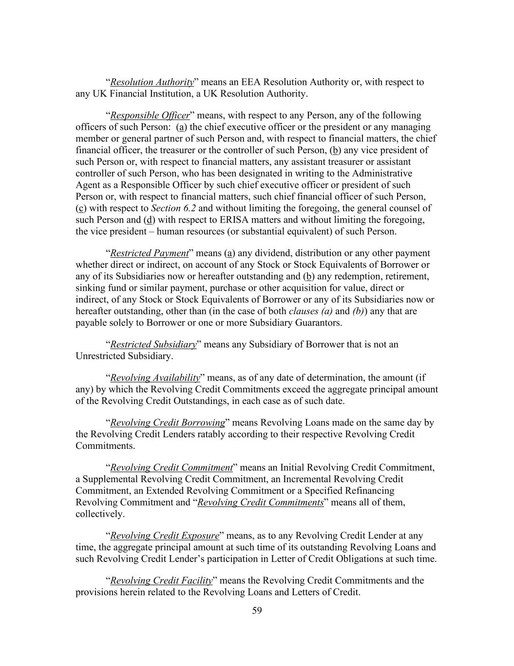 59 “Resolution Authority” means an EEA Resolution Authority or, with respect to any UK Financial Institution, a UK Resolution Authority. “Responsible Officer” means, with respect to any Person, any of the following officers of such Person: (a) the chief executive officer or the president or any managing member or general partner of such Person and, with respect to financial matters, the chief financial officer, the treasurer or the controller of such Person, (b) any vice president of such Person or, with respect to financial matters, any assistant treasurer or assistant controller of such Person, who has been designated in writing to the Administrative Agent as a Responsible Officer by such chief executive officer or president of such Person or, with respect to financial matters, such chief financial officer of such Person, (c) with respect to Section 6.2 and without limiting the foregoing, the general counsel of such Person and (d) with respect to ERISA matters and without limiting the foregoing, the vice president – human resources (or substantial equivalent) of such Person. “Restricted Payment” means (a) any dividend, distribution or any other payment whether direct or indirect, on account of any Stock or Stock Equivalents of Borrower or any of its Subsidiaries now or hereafter outstanding and (b) any redemption, retirement, sinking fund or similar payment, purchase or other acquisition for value, direct or indirect, of any Stock or Stock Equivalents of Borrower or any of its Subsidiaries now or hereafter outstanding, other than (in the case of both clauses (a) and (b)) any that are payable solely to Borrower or one or more Subsidiary Guarantors. “Restricted Subsidiary” means any Subsidiary of Borrower that is not an Unrestricted Subsidiary. “Revolving Availability” means, as of any date of determination, the amount (if any) by which the Revolving Credit Commitments exceed the aggregate principal amount of the Revolving Credit Outstandings, in each case as of such date. “Revolving Credit Borrowing” means Revolving Loans made on the same day by the Revolving Credit Lenders ratably according to their respective Revolving Credit Commitments. “Revolving Credit Commitment” means an Initial Revolving Credit Commitment, a Supplemental Revolving Credit Commitment, an Incremental Revolving Credit Commitment, an Extended Revolving Commitment or a Specified Refinancing Revolving Commitment and “Revolving Credit Commitments” means all of them, collectively. “Revolving Credit Exposure” means, as to any Revolving Credit Lender at any time, the aggregate principal amount at such time of its outstanding Revolving Loans and such Revolving Credit Lender’s participation in Letter of Credit Obligations at such time. “Revolving Credit Facility” means the Revolving Credit Commitments and the provisions herein related to the Revolving Loans and Letters of Credit.