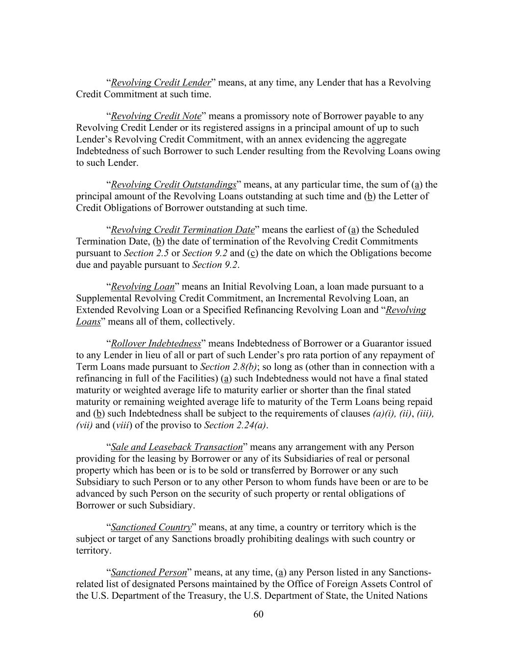 60 “Revolving Credit Lender” means, at any time, any Lender that has a Revolving Credit Commitment at such time. “Revolving Credit Note” means a promissory note of Borrower payable to any Revolving Credit Lender or its registered assigns in a principal amount of up to such Lender’s Revolving Credit Commitment, with an annex evidencing the aggregate Indebtedness of such Borrower to such Lender resulting from the Revolving Loans owing to such Lender. “Revolving Credit Outstandings” means, at any particular time, the sum of (a) the principal amount of the Revolving Loans outstanding at such time and (b) the Letter of Credit Obligations of Borrower outstanding at such time. “Revolving Credit Termination Date” means the earliest of (a) the Scheduled Termination Date, (b) the date of termination of the Revolving Credit Commitments pursuant to Section 2.5 or Section 9.2 and (c) the date on which the Obligations become due and payable pursuant to Section 9.2. “Revolving Loan” means an Initial Revolving Loan, a loan made pursuant to a Supplemental Revolving Credit Commitment, an Incremental Revolving Loan, an Extended Revolving Loan or a Specified Refinancing Revolving Loan and “Revolving Loans” means all of them, collectively. “Rollover Indebtedness” means Indebtedness of Borrower or a Guarantor issued to any Lender in lieu of all or part of such Lender’s pro rata portion of any repayment of Term Loans made pursuant to Section 2.8(b); so long as (other than in connection with a refinancing in full of the Facilities) (a) such Indebtedness would not have a final stated maturity or weighted average life to maturity earlier or shorter than the final stated maturity or remaining weighted average life to maturity of the Term Loans being repaid and (b) such Indebtedness shall be subject to the requirements of clauses (a)(i), (ii), (iii), (vii) and (viii) of the proviso to Section 2.24(a). “Sale and Leaseback Transaction” means any arrangement with any Person providing for the leasing by Borrower or any of its Subsidiaries of real or personal property which has been or is to be sold or transferred by Borrower or any such Subsidiary to such Person or to any other Person to whom funds have been or are to be advanced by such Person on the security of such property or rental obligations of Borrower or such Subsidiary. “Sanctioned Country” means, at any time, a country or territory which is the subject or target of any Sanctions broadly prohibiting dealings with such country or territory. “Sanctioned Person” means, at any time, (a) any Person listed in any Sanctions- related list of designated Persons maintained by the Office of Foreign Assets Control of the U.S. Department of the Treasury, the U.S. Department of State, the United Nations