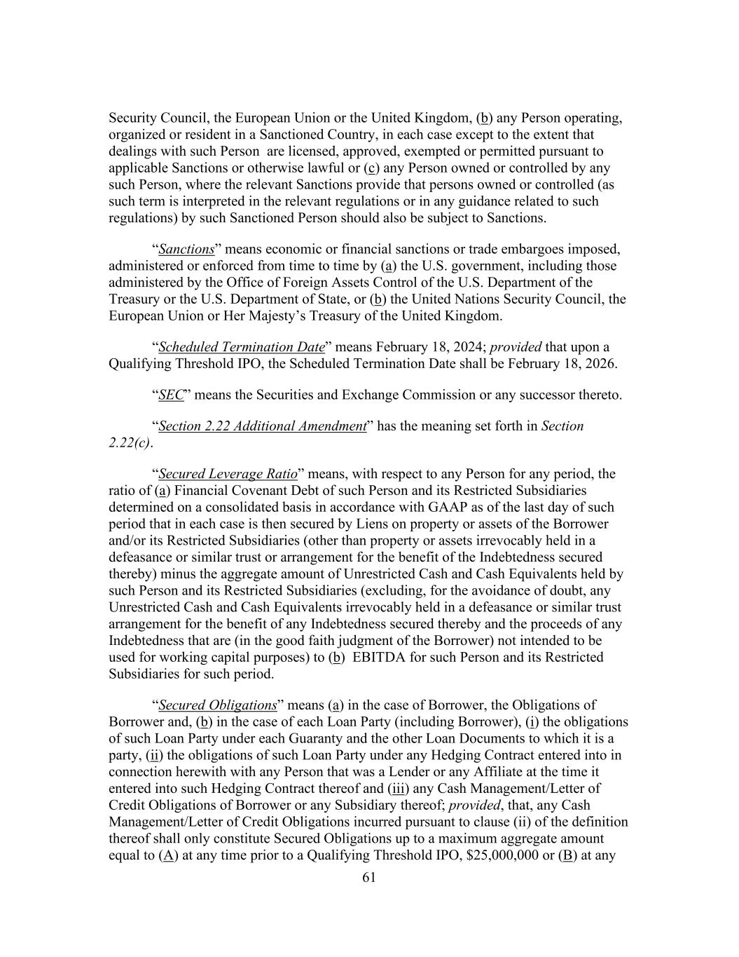 61 Security Council, the European Union or the United Kingdom, (b) any Person operating, organized or resident in a Sanctioned Country, in each case except to the extent that dealings with such Person are licensed, approved, exempted or permitted pursuant to applicable Sanctions or otherwise lawful or (c) any Person owned or controlled by any such Person, where the relevant Sanctions provide that persons owned or controlled (as such term is interpreted in the relevant regulations or in any guidance related to such regulations) by such Sanctioned Person should also be subject to Sanctions. “Sanctions” means economic or financial sanctions or trade embargoes imposed, administered or enforced from time to time by (a) the U.S. government, including those administered by the Office of Foreign Assets Control of the U.S. Department of the Treasury or the U.S. Department of State, or (b) the United Nations Security Council, the European Union or Her Majesty’s Treasury of the United Kingdom. “Scheduled Termination Date” means February 18, 2024; provided that upon a Qualifying Threshold IPO, the Scheduled Termination Date shall be February 18, 2026. “SEC” means the Securities and Exchange Commission or any successor thereto. “Section 2.22 Additional Amendment” has the meaning set forth in Section 2.22(c). “Secured Leverage Ratio” means, with respect to any Person for any period, the ratio of (a) Financial Covenant Debt of such Person and its Restricted Subsidiaries determined on a consolidated basis in accordance with GAAP as of the last day of such period that in each case is then secured by Liens on property or assets of the Borrower and/or its Restricted Subsidiaries (other than property or assets irrevocably held in a defeasance or similar trust or arrangement for the benefit of the Indebtedness secured thereby) minus the aggregate amount of Unrestricted Cash and Cash Equivalents held by such Person and its Restricted Subsidiaries (excluding, for the avoidance of doubt, any Unrestricted Cash and Cash Equivalents irrevocably held in a defeasance or similar trust arrangement for the benefit of any Indebtedness secured thereby and the proceeds of any Indebtedness that are (in the good faith judgment of the Borrower) not intended to be used for working capital purposes) to (b) EBITDA for such Person and its Restricted Subsidiaries for such period. “Secured Obligations” means (a) in the case of Borrower, the Obligations of Borrower and, (b) in the case of each Loan Party (including Borrower), (i) the obligations of such Loan Party under each Guaranty and the other Loan Documents to which it is a party, (ii) the obligations of such Loan Party under any Hedging Contract entered into in connection herewith with any Person that was a Lender or any Affiliate at the time it entered into such Hedging Contract thereof and (iii) any Cash Management/Letter of Credit Obligations of Borrower or any Subsidiary thereof; provided, that, any Cash Management/Letter of Credit Obligations incurred pursuant to clause (ii) of the definition thereof shall only constitute Secured Obligations up to a maximum aggregate amount equal to (A) at any time prior to a Qualifying Threshold IPO, $25,000,000 or (B) at any