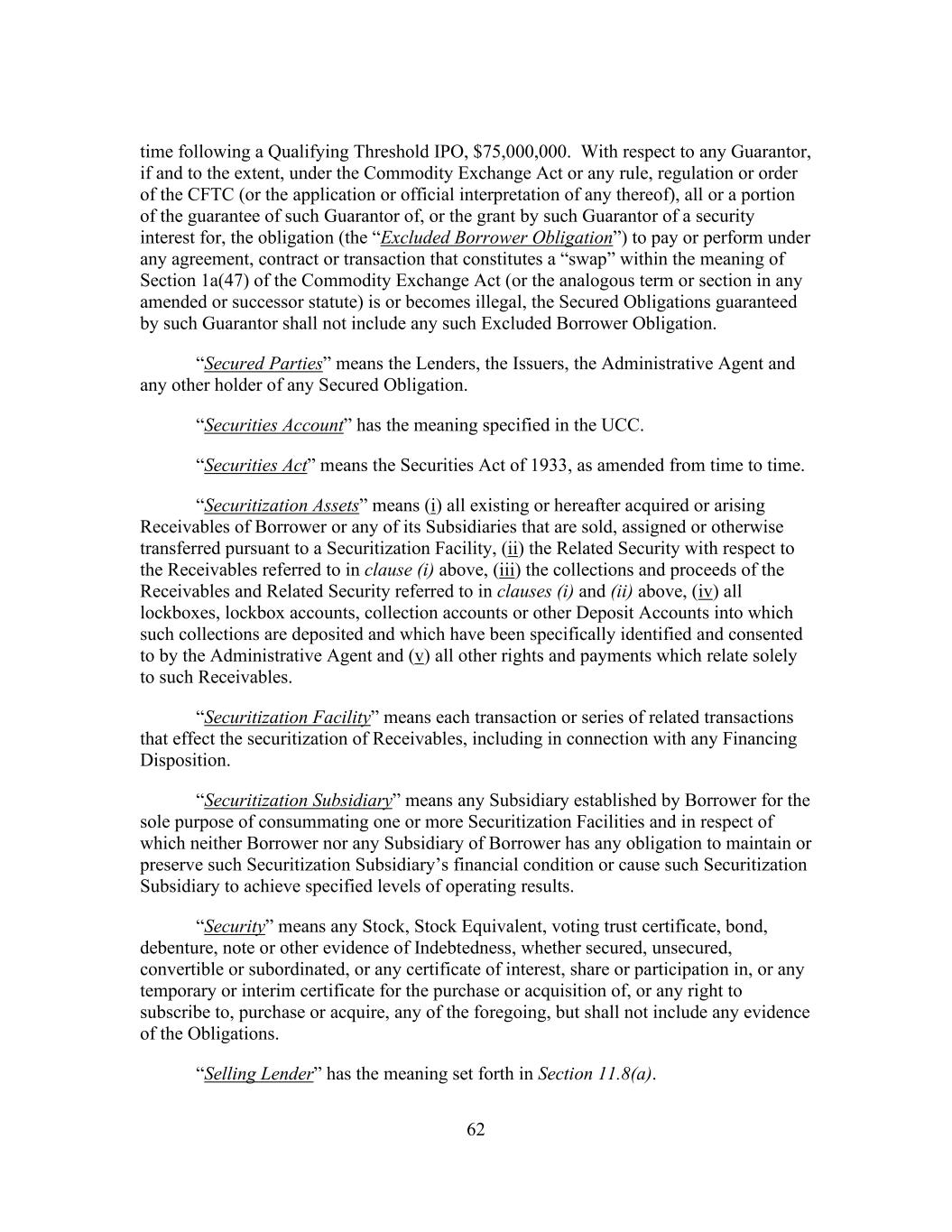 62 time following a Qualifying Threshold IPO, $75,000,000. With respect to any Guarantor, if and to the extent, under the Commodity Exchange Act or any rule, regulation or order of the CFTC (or the application or official interpretation of any thereof), all or a portion of the guarantee of such Guarantor of, or the grant by such Guarantor of a security interest for, the obligation (the “Excluded Borrower Obligation”) to pay or perform under any agreement, contract or transaction that constitutes a “swap” within the meaning of Section 1a(47) of the Commodity Exchange Act (or the analogous term or section in any amended or successor statute) is or becomes illegal, the Secured Obligations guaranteed by such Guarantor shall not include any such Excluded Borrower Obligation. “Secured Parties” means the Lenders, the Issuers, the Administrative Agent and any other holder of any Secured Obligation. “Securities Account” has the meaning specified in the UCC. “Securities Act” means the Securities Act of 1933, as amended from time to time. “Securitization Assets” means (i) all existing or hereafter acquired or arising Receivables of Borrower or any of its Subsidiaries that are sold, assigned or otherwise transferred pursuant to a Securitization Facility, (ii) the Related Security with respect to the Receivables referred to in clause (i) above, (iii) the collections and proceeds of the Receivables and Related Security referred to in clauses (i) and (ii) above, (iv) all lockboxes, lockbox accounts, collection accounts or other Deposit Accounts into which such collections are deposited and which have been specifically identified and consented to by the Administrative Agent and (v) all other rights and payments which relate solely to such Receivables. “Securitization Facility” means each transaction or series of related transactions that effect the securitization of Receivables, including in connection with any Financing Disposition. “Securitization Subsidiary” means any Subsidiary established by Borrower for the sole purpose of consummating one or more Securitization Facilities and in respect of which neither Borrower nor any Subsidiary of Borrower has any obligation to maintain or preserve such Securitization Subsidiary’s financial condition or cause such Securitization Subsidiary to achieve specified levels of operating results. “Security” means any Stock, Stock Equivalent, voting trust certificate, bond, debenture, note or other evidence of Indebtedness, whether secured, unsecured, convertible or subordinated, or any certificate of interest, share or participation in, or any temporary or interim certificate for the purchase or acquisition of, or any right to subscribe to, purchase or acquire, any of the foregoing, but shall not include any evidence of the Obligations. “Selling Lender” has the meaning set forth in Section 11.8(a).