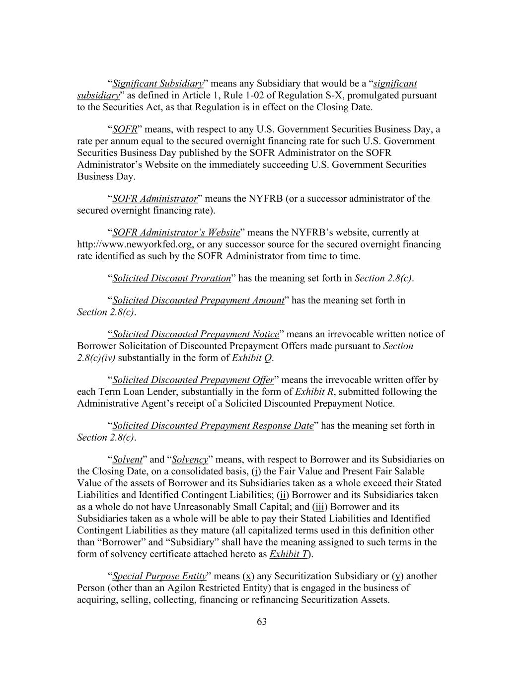 63 “Significant Subsidiary” means any Subsidiary that would be a “significant subsidiary” as defined in Article 1, Rule 1-02 of Regulation S-X, promulgated pursuant to the Securities Act, as that Regulation is in effect on the Closing Date. “SOFR” means, with respect to any U.S. Government Securities Business Day, a rate per annum equal to the secured overnight financing rate for such U.S. Government Securities Business Day published by the SOFR Administrator on the SOFR Administrator’s Website on the immediately succeeding U.S. Government Securities Business Day. “SOFR Administrator” means the NYFRB (or a successor administrator of the secured overnight financing rate). “SOFR Administrator’s Website” means the NYFRB’s website, currently at http://www.newyorkfed.org, or any successor source for the secured overnight financing rate identified as such by the SOFR Administrator from time to time. “Solicited Discount Proration” has the meaning set forth in Section 2.8(c). “Solicited Discounted Prepayment Amount” has the meaning set forth in Section 2.8(c). “Solicited Discounted Prepayment Notice” means an irrevocable written notice of Borrower Solicitation of Discounted Prepayment Offers made pursuant to Section 2.8(c)(iv) substantially in the form of Exhibit Q. “Solicited Discounted Prepayment Offer” means the irrevocable written offer by each Term Loan Lender, substantially in the form of Exhibit R, submitted following the Administrative Agent’s receipt of a Solicited Discounted Prepayment Notice. “Solicited Discounted Prepayment Response Date” has the meaning set forth in Section 2.8(c). “Solvent” and “Solvency” means, with respect to Borrower and its Subsidiaries on the Closing Date, on a consolidated basis, (i) the Fair Value and Present Fair Salable Value of the assets of Borrower and its Subsidiaries taken as a whole exceed their Stated Liabilities and Identified Contingent Liabilities; (ii) Borrower and its Subsidiaries taken as a whole do not have Unreasonably Small Capital; and (iii) Borrower and its Subsidiaries taken as a whole will be able to pay their Stated Liabilities and Identified Contingent Liabilities as they mature (all capitalized terms used in this definition other than “Borrower” and “Subsidiary” shall have the meaning assigned to such terms in the form of solvency certificate attached hereto as Exhibit T). “Special Purpose Entity” means (x) any Securitization Subsidiary or (y) another Person (other than an Agilon Restricted Entity) that is engaged in the business of acquiring, selling, collecting, financing or refinancing Securitization Assets.