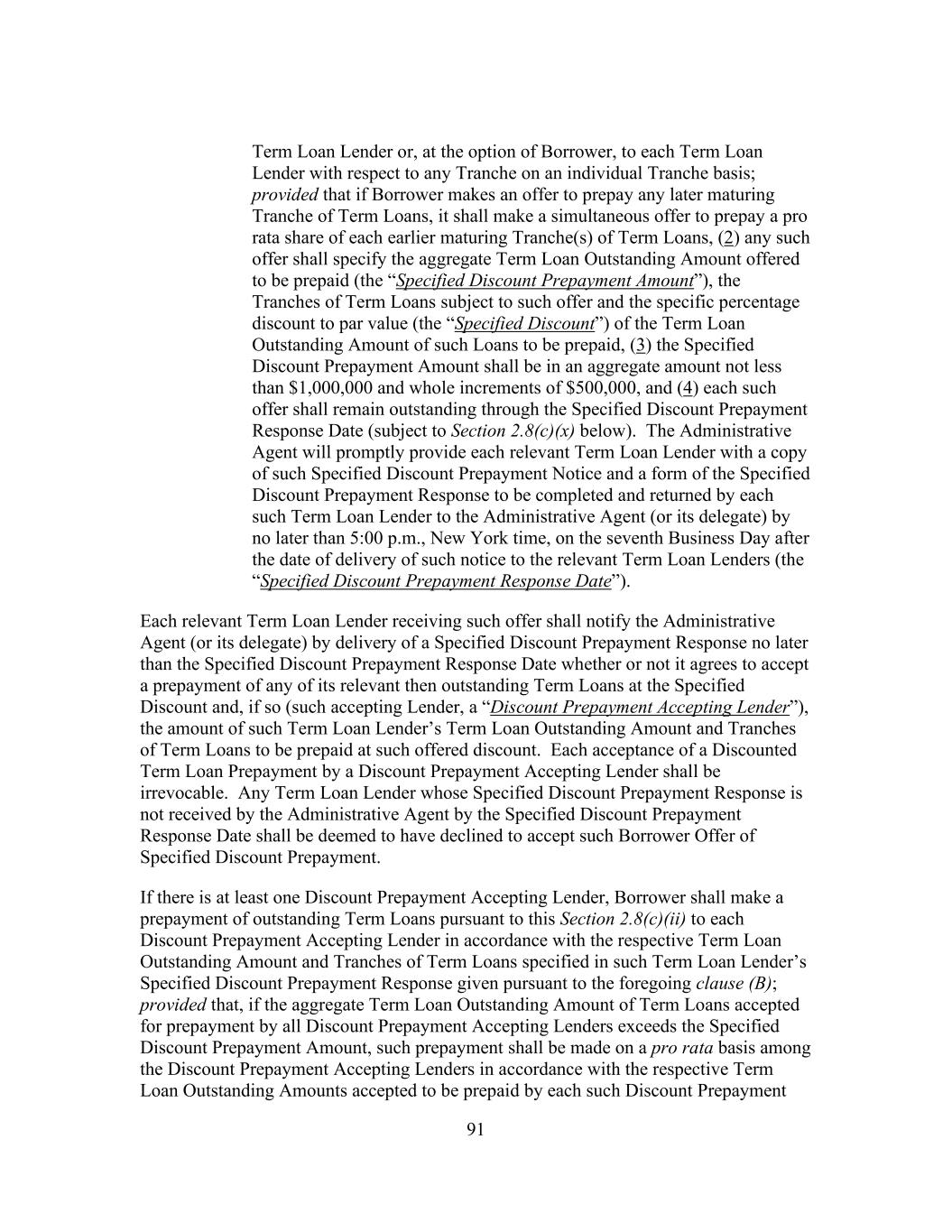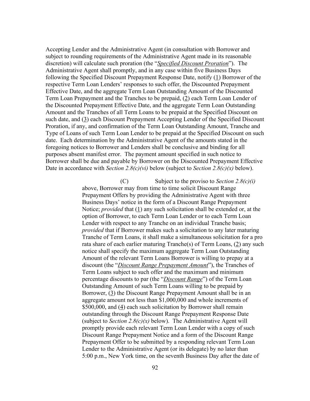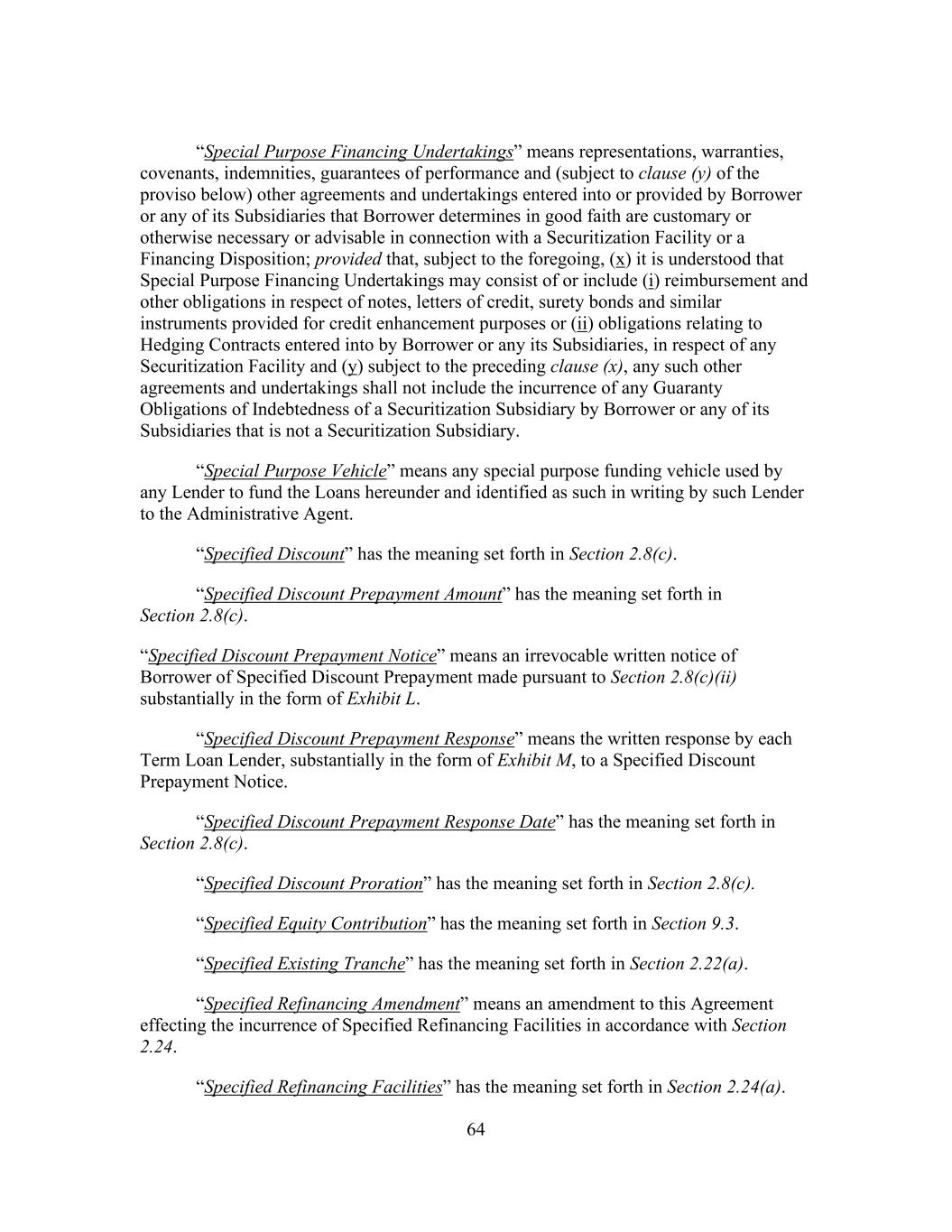 64 “Special Purpose Financing Undertakings” means representations, warranties, covenants, indemnities, guarantees of performance and (subject to clause (y) of the proviso below) other agreements and undertakings entered into or provided by Borrower or any of its Subsidiaries that Borrower determines in good faith are customary or otherwise necessary or advisable in connection with a Securitization Facility or a Financing Disposition; provided that, subject to the foregoing, (x) it is understood that Special Purpose Financing Undertakings may consist of or include (i) reimbursement and other obligations in respect of notes, letters of credit, surety bonds and similar instruments provided for credit enhancement purposes or (ii) obligations relating to Hedging Contracts entered into by Borrower or any its Subsidiaries, in respect of any Securitization Facility and (y) subject to the preceding clause (x), any such other agreements and undertakings shall not include the incurrence of any Guaranty Obligations of Indebtedness of a Securitization Subsidiary by Borrower or any of its Subsidiaries that is not a Securitization Subsidiary. “Special Purpose Vehicle” means any special purpose funding vehicle used by any Lender to fund the Loans hereunder and identified as such in writing by such Lender to the Administrative Agent. “Specified Discount” has the meaning set forth in Section 2.8(c). “Specified Discount Prepayment Amount” has the meaning set forth in Section 2.8(c). “Specified Discount Prepayment Notice” means an irrevocable written notice of Borrower of Specified Discount Prepayment made pursuant to Section 2.8(c)(ii) substantially in the form of Exhibit L. “Specified Discount Prepayment Response” means the written response by each Term Loan Lender, substantially in the form of Exhibit M, to a Specified Discount Prepayment Notice. “Specified Discount Prepayment Response Date” has the meaning set forth in Section 2.8(c). “Specified Discount Proration” has the meaning set forth in Section 2.8(c). “Specified Equity Contribution” has the meaning set forth in Section 9.3. “Specified Existing Tranche” has the meaning set forth in Section 2.22(a). “Specified Refinancing Amendment” means an amendment to this Agreement effecting the incurrence of Specified Refinancing Facilities in accordance with Section 2.24. “Specified Refinancing Facilities” has the meaning set forth in Section 2.24(a).