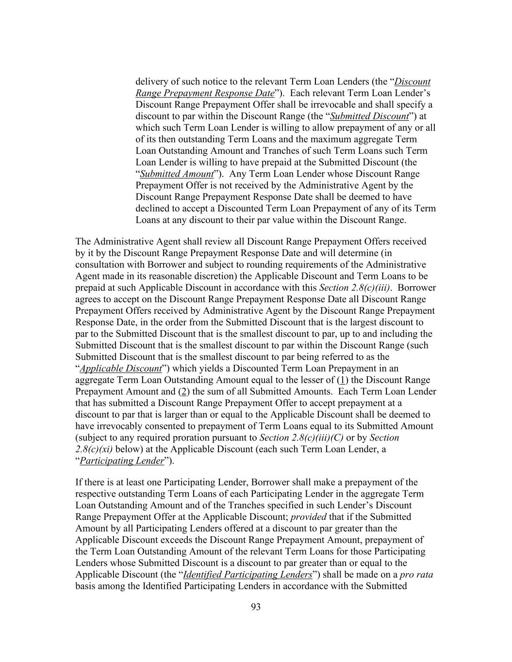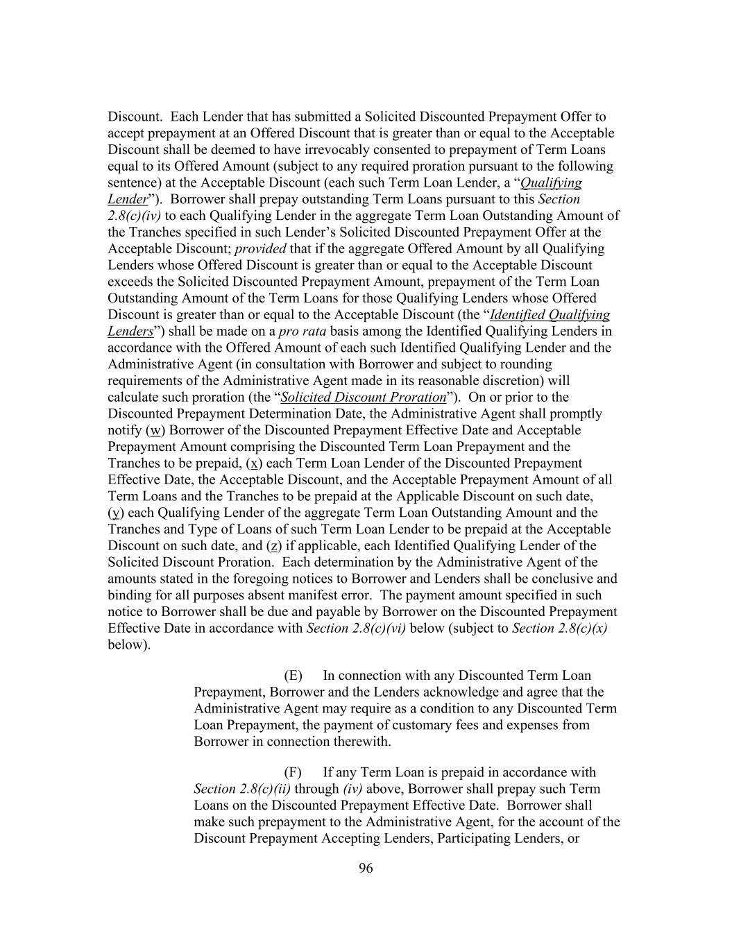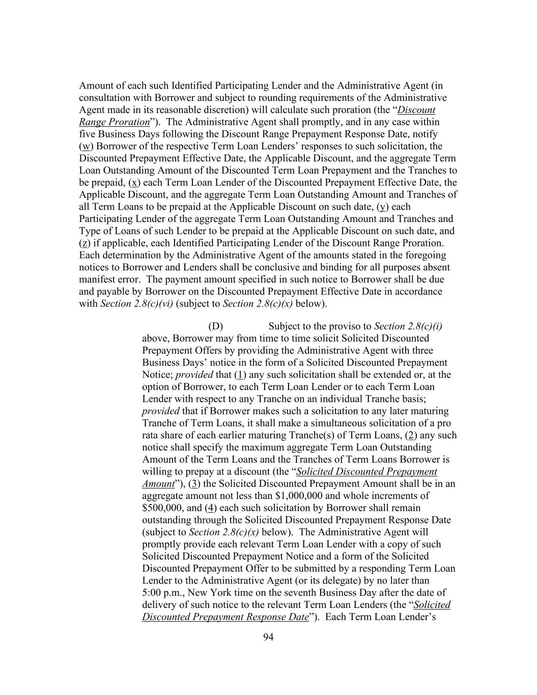 64 “Special Purpose Financing Undertakings” means representations, warranties, covenants, indemnities, guarantees of performance and (subject to clause (y) of the proviso below) other agreements and undertakings entered into or provided by Borrower or any of its Subsidiaries that Borrower determines in good faith are customary or otherwise necessary or advisable in connection with a Securitization Facility or a Financing Disposition; provided that, subject to the foregoing, (x) it is understood that Special Purpose Financing Undertakings may consist of or include (i) reimbursement and other obligations in respect of notes, letters of credit, surety bonds and similar instruments provided for credit enhancement purposes or (ii) obligations relating to Hedging Contracts entered into by Borrower or any its Subsidiaries, in respect of any Securitization Facility and (y) subject to the preceding clause (x), any such other agreements and undertakings shall not include the incurrence of any Guaranty Obligations of Indebtedness of a Securitization Subsidiary by Borrower or any of its Subsidiaries that is not a Securitization Subsidiary. “Special Purpose Vehicle” means any special purpose funding vehicle used by any Lender to fund the Loans hereunder and identified as such in writing by such Lender to the Administrative Agent. “Specified Discount” has the meaning set forth in Section 2.8(c). “Specified Discount Prepayment Amount” has the meaning set forth in Section 2.8(c). “Specified Discount Prepayment Notice” means an irrevocable written notice of Borrower of Specified Discount Prepayment made pursuant to Section 2.8(c)(ii) substantially in the form of Exhibit L. “Specified Discount Prepayment Response” means the written response by each Term Loan Lender, substantially in the form of Exhibit M, to a Specified Discount Prepayment Notice. “Specified Discount Prepayment Response Date” has the meaning set forth in Section 2.8(c). “Specified Discount Proration” has the meaning set forth in Section 2.8(c). “Specified Equity Contribution” has the meaning set forth in Section 9.3. “Specified Existing Tranche” has the meaning set forth in Section 2.22(a). “Specified Refinancing Amendment” means an amendment to this Agreement effecting the incurrence of Specified Refinancing Facilities in accordance with Section 2.24. “Specified Refinancing Facilities” has the meaning set forth in Section 2.24(a).