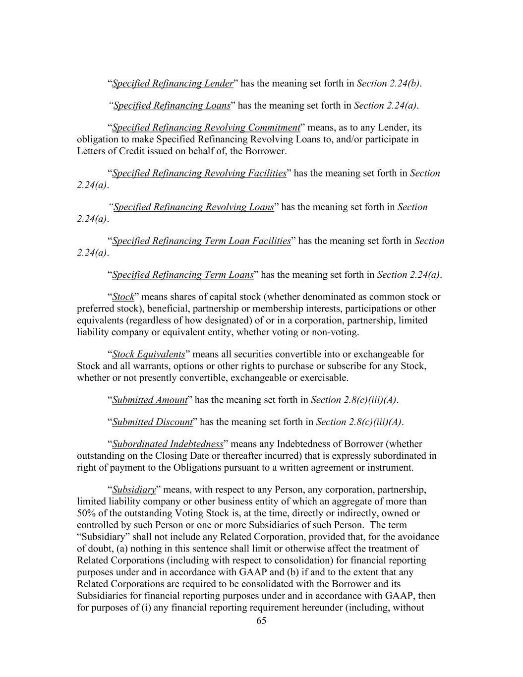 65 “Specified Refinancing Lender” has the meaning set forth in Section 2.24(b). “Specified Refinancing Loans” has the meaning set forth in Section 2.24(a). “Specified Refinancing Revolving Commitment” means, as to any Lender, its obligation to make Specified Refinancing Revolving Loans to, and/or participate in Letters of Credit issued on behalf of, the Borrower. “Specified Refinancing Revolving Facilities” has the meaning set forth in Section 2.24(a). “Specified Refinancing Revolving Loans” has the meaning set forth in Section 2.24(a). “Specified Refinancing Term Loan Facilities” has the meaning set forth in Section 2.24(a). “Specified Refinancing Term Loans” has the meaning set forth in Section 2.24(a). “Stock” means shares of capital stock (whether denominated as common stock or preferred stock), beneficial, partnership or membership interests, participations or other equivalents (regardless of how designated) of or in a corporation, partnership, limited liability company or equivalent entity, whether voting or non-voting. “Stock Equivalents” means all securities convertible into or exchangeable for Stock and all warrants, options or other rights to purchase or subscribe for any Stock, whether or not presently convertible, exchangeable or exercisable. “Submitted Amount” has the meaning set forth in Section 2.8(c)(iii)(A). “Submitted Discount” has the meaning set forth in Section 2.8(c)(iii)(A). “Subordinated Indebtedness” means any Indebtedness of Borrower (whether outstanding on the Closing Date or thereafter incurred) that is expressly subordinated in right of payment to the Obligations pursuant to a written agreement or instrument. “Subsidiary” means, with respect to any Person, any corporation, partnership, limited liability company or other business entity of which an aggregate of more than 50% of the outstanding Voting Stock is, at the time, directly or indirectly, owned or controlled by such Person or one or more Subsidiaries of such Person. The term “Subsidiary” shall not include any Related Corporation, provided that, for the avoidance of doubt, (a) nothing in this sentence shall limit or otherwise affect the treatment of Related Corporations (including with respect to consolidation) for financial reporting purposes under and in accordance with GAAP and (b) if and to the extent that any Related Corporations are required to be consolidated with the Borrower and its Subsidiaries for financial reporting purposes under and in accordance with GAAP, then for purposes of (i) any financial reporting requirement hereunder (including, without