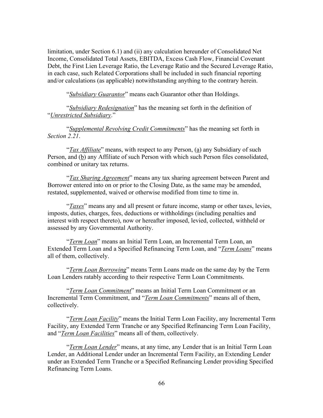 66 limitation, under Section 6.1) and (ii) any calculation hereunder of Consolidated Net Income, Consolidated Total Assets, EBITDA, Excess Cash Flow, Financial Covenant Debt, the First Lien Leverage Ratio, the Leverage Ratio and the Secured Leverage Ratio, in each case, such Related Corporations shall be included in such financial reporting and/or calculations (as applicable) notwithstanding anything to the contrary herein. “Subsidiary Guarantor” means each Guarantor other than Holdings. “Subsidiary Redesignation” has the meaning set forth in the definition of “Unrestricted Subsidiary.” “Supplemental Revolving Credit Commitments” has the meaning set forth in Section 2.21. “Tax Affiliate” means, with respect to any Person, (a) any Subsidiary of such Person, and (b) any Affiliate of such Person with which such Person files consolidated, combined or unitary tax returns. “Tax Sharing Agreement” means any tax sharing agreement between Parent and Borrower entered into on or prior to the Closing Date, as the same may be amended, restated, supplemented, waived or otherwise modified from time to time in. “Taxes” means any and all present or future income, stamp or other taxes, levies, imposts, duties, charges, fees, deductions or withholdings (including penalties and interest with respect thereto), now or hereafter imposed, levied, collected, withheld or assessed by any Governmental Authority. “Term Loan” means an Initial Term Loan, an Incremental Term Loan, an Extended Term Loan and a Specified Refinancing Term Loan, and “Term Loans” means all of them, collectively. “Term Loan Borrowing” means Term Loans made on the same day by the Term Loan Lenders ratably according to their respective Term Loan Commitments. “Term Loan Commitment” means an Initial Term Loan Commitment or an Incremental Term Commitment, and “Term Loan Commitments” means all of them, collectively. “Term Loan Facility” means the Initial Term Loan Facility, any Incremental Term Facility, any Extended Term Tranche or any Specified Refinancing Term Loan Facility, and “Term Loan Facilities” means all of them, collectively. “Term Loan Lender” means, at any time, any Lender that is an Initial Term Loan Lender, an Additional Lender under an Incremental Term Facility, an Extending Lender under an Extended Term Tranche or a Specified Refinancing Lender providing Specified Refinancing Term Loans.