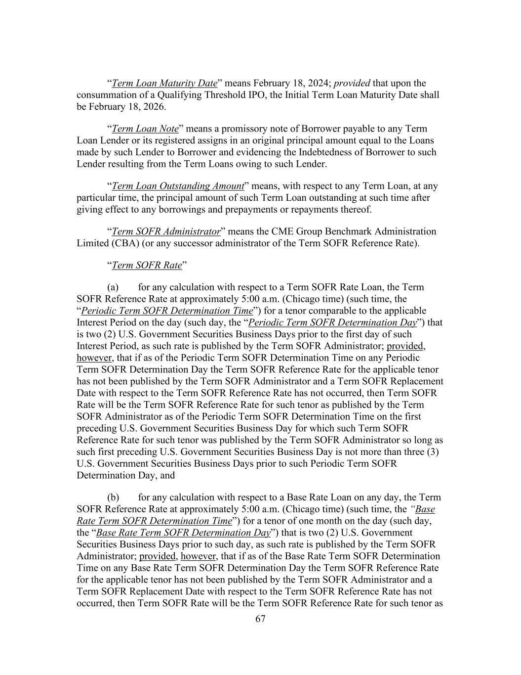 67 “Term Loan Maturity Date” means February 18, 2024; provided that upon the consummation of a Qualifying Threshold IPO, the Initial Term Loan Maturity Date shall be February 18, 2026. “Term Loan Note” means a promissory note of Borrower payable to any Term Loan Lender or its registered assigns in an original principal amount equal to the Loans made by such Lender to Borrower and evidencing the Indebtedness of Borrower to such Lender resulting from the Term Loans owing to such Lender. “Term Loan Outstanding Amount” means, with respect to any Term Loan, at any particular time, the principal amount of such Term Loan outstanding at such time after giving effect to any borrowings and prepayments or repayments thereof. “Term SOFR Administrator” means the CME Group Benchmark Administration Limited (CBA) (or any successor administrator of the Term SOFR Reference Rate). “Term SOFR Rate” (a) for any calculation with respect to a Term SOFR Rate Loan, the Term SOFR Reference Rate at approximately 5:00 a.m. (Chicago time) (such time, the “Periodic Term SOFR Determination Time”) for a tenor comparable to the applicable Interest Period on the day (such day, the “Periodic Term SOFR Determination Day”) that is two (2) U.S. Government Securities Business Days prior to the first day of such Interest Period, as such rate is published by the Term SOFR Administrator; provided, however, that if as of the Periodic Term SOFR Determination Time on any Periodic Term SOFR Determination Day the Term SOFR Reference Rate for the applicable tenor has not been published by the Term SOFR Administrator and a Term SOFR Replacement Date with respect to the Term SOFR Reference Rate has not occurred, then Term SOFR Rate will be the Term SOFR Reference Rate for such tenor as published by the Term SOFR Administrator as of the Periodic Term SOFR Determination Time on the first preceding U.S. Government Securities Business Day for which such Term SOFR Reference Rate for such tenor was published by the Term SOFR Administrator so long as such first preceding U.S. Government Securities Business Day is not more than three (3) U.S. Government Securities Business Days prior to such Periodic Term SOFR Determination Day, and (b) for any calculation with respect to a Base Rate Loan on any day, the Term SOFR Reference Rate at approximately 5:00 a.m. (Chicago time) (such time, the “Base Rate Term SOFR Determination Time”) for a tenor of one month on the day (such day, the “Base Rate Term SOFR Determination Day”) that is two (2) U.S. Government Securities Business Days prior to such day, as such rate is published by the Term SOFR Administrator; provided, however, that if as of the Base Rate Term SOFR Determination Time on any Base Rate Term SOFR Determination Day the Term SOFR Reference Rate for the applicable tenor has not been published by the Term SOFR Administrator and a Term SOFR Replacement Date with respect to the Term SOFR Reference Rate has not occurred, then Term SOFR Rate will be the Term SOFR Reference Rate for such tenor as