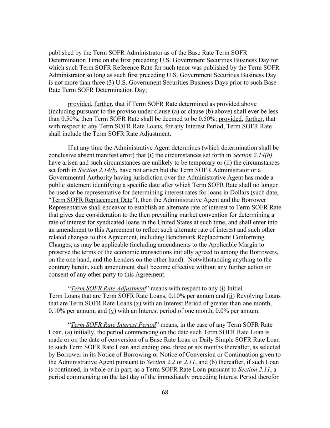 68 published by the Term SOFR Administrator as of the Base Rate Term SOFR Determination Time on the first preceding U.S. Government Securities Business Day for which such Term SOFR Reference Rate for such tenor was published by the Term SOFR Administrator so long as such first preceding U.S. Government Securities Business Day is not more than three (3) U.S. Government Securities Business Days prior to such Base Rate Term SOFR Determination Day; provided, further, that if Term SOFR Rate determined as provided above (including pursuant to the proviso under clause (a) or clause (b) above) shall ever be less than 0.50%, then Term SOFR Rate shall be deemed to be 0.50%; provided, further, that with respect to any Term SOFR Rate Loans, for any Interest Period, Term SOFR Rate shall include the Term SOFR Rate Adjustment. If at any time the Administrative Agent determines (which determination shall be conclusive absent manifest error) that (i) the circumstances set forth in Section 2.14(b) have arisen and such circumstances are unlikely to be temporary or (ii) the circumstances set forth in Section 2.14(b) have not arisen but the Term SOFR Administrator or a Governmental Authority having jurisdiction over the Administrative Agent has made a public statement identifying a specific date after which Term SOFR Rate shall no longer be used or be representative for determining interest rates for loans in Dollars (such date, “Term SOFR Replacement Date”), then the Administrative Agent and the Borrower Representative shall endeavor to establish an alternate rate of interest to Term SOFR Rate that gives due consideration to the then prevailing market convention for determining a rate of interest for syndicated loans in the United States at such time, and shall enter into an amendment to this Agreement to reflect such alternate rate of interest and such other related changes to this Agreement, including Benchmark Replacement Conforming Changes, as may be applicable (including amendments to the Applicable Margin to preserve the terms of the economic transactions initially agreed to among the Borrowers, on the one hand, and the Lenders on the other hand). Notwithstanding anything to the contrary herein, such amendment shall become effective without any further action or consent of any other party to this Agreement. “Term SOFR Rate Adjustment” means with respect to any (i) Initial Term Loans that are Term SOFR Rate Loans, 0.10% per annum and (ii) Revolving Loans that are Term SOFR Rate Loans (x) with an Interest Period of greater than one month, 0.10% per annum, and (y) with an Interest period of one month, 0.0% per annum. “Term SOFR Rate Interest Period” means, in the case of any Term SOFR Rate Loan, (a) initially, the period commencing on the date such Term SOFR Rate Loan is made or on the date of conversion of a Base Rate Loan or Daily Simple SOFR Rate Loan to such Term SOFR Rate Loan and ending one, three or six months thereafter, as selected by Borrower in its Notice of Borrowing or Notice of Conversion or Continuation given to the Administrative Agent pursuant to Section 2.2 or 2.11, and (b) thereafter, if such Loan is continued, in whole or in part, as a Term SOFR Rate Loan pursuant to Section 2.11, a period commencing on the last day of the immediately preceding Interest Period therefor