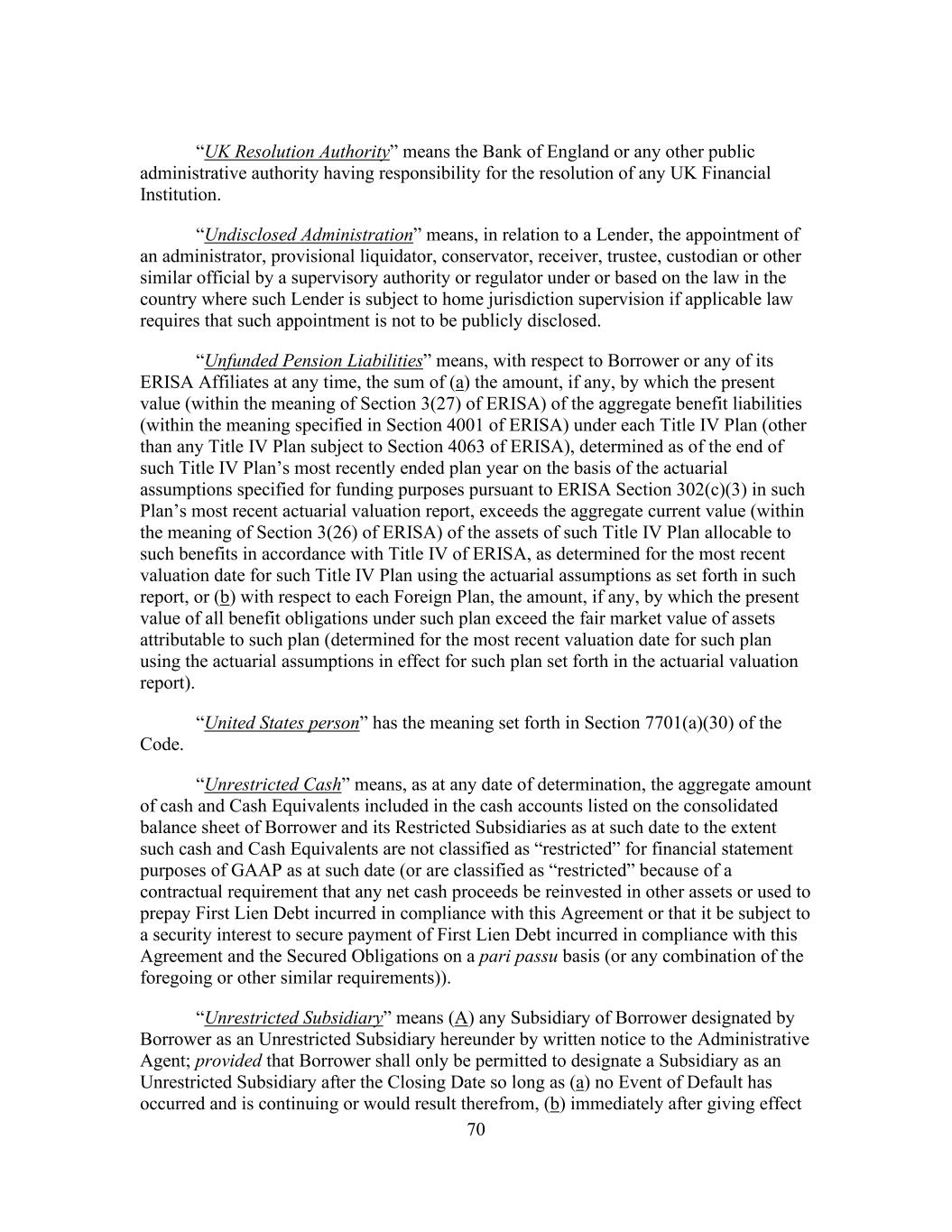 70 “UK Resolution Authority” means the Bank of England or any other public administrative authority having responsibility for the resolution of any UK Financial Institution. “Undisclosed Administration” means, in relation to a Lender, the appointment of an administrator, provisional liquidator, conservator, receiver, trustee, custodian or other similar official by a supervisory authority or regulator under or based on the law in the country where such Lender is subject to home jurisdiction supervision if applicable law requires that such appointment is not to be publicly disclosed. “Unfunded Pension Liabilities” means, with respect to Borrower or any of its ERISA Affiliates at any time, the sum of (a) the amount, if any, by which the present value (within the meaning of Section 3(27) of ERISA) of the aggregate benefit liabilities (within the meaning specified in Section 4001 of ERISA) under each Title IV Plan (other than any Title IV Plan subject to Section 4063 of ERISA), determined as of the end of such Title IV Plan’s most recently ended plan year on the basis of the actuarial assumptions specified for funding purposes pursuant to ERISA Section 302(c)(3) in such Plan’s most recent actuarial valuation report, exceeds the aggregate current value (within the meaning of Section 3(26) of ERISA) of the assets of such Title IV Plan allocable to such benefits in accordance with Title IV of ERISA, as determined for the most recent valuation date for such Title IV Plan using the actuarial assumptions as set forth in such report, or (b) with respect to each Foreign Plan, the amount, if any, by which the present value of all benefit obligations under such plan exceed the fair market value of assets attributable to such plan (determined for the most recent valuation date for such plan using the actuarial assumptions in effect for such plan set forth in the actuarial valuation report). “United States person” has the meaning set forth in Section 7701(a)(30) of the Code. “Unrestricted Cash” means, as at any date of determination, the aggregate amount of cash and Cash Equivalents included in the cash accounts listed on the consolidated balance sheet of Borrower and its Restricted Subsidiaries as at such date to the extent such cash and Cash Equivalents are not classified as “restricted” for financial statement purposes of GAAP as at such date (or are classified as “restricted” because of a contractual requirement that any net cash proceeds be reinvested in other assets or used to prepay First Lien Debt incurred in compliance with this Agreement or that it be subject to a security interest to secure payment of First Lien Debt incurred in compliance with this Agreement and the Secured Obligations on a pari passu basis (or any combination of the foregoing or other similar requirements)). “Unrestricted Subsidiary” means (A) any Subsidiary of Borrower designated by Borrower as an Unrestricted Subsidiary hereunder by written notice to the Administrative Agent; provided that Borrower shall only be permitted to designate a Subsidiary as an Unrestricted Subsidiary after the Closing Date so long as (a) no Event of Default has occurred and is continuing or would result therefrom, (b) immediately after giving effect