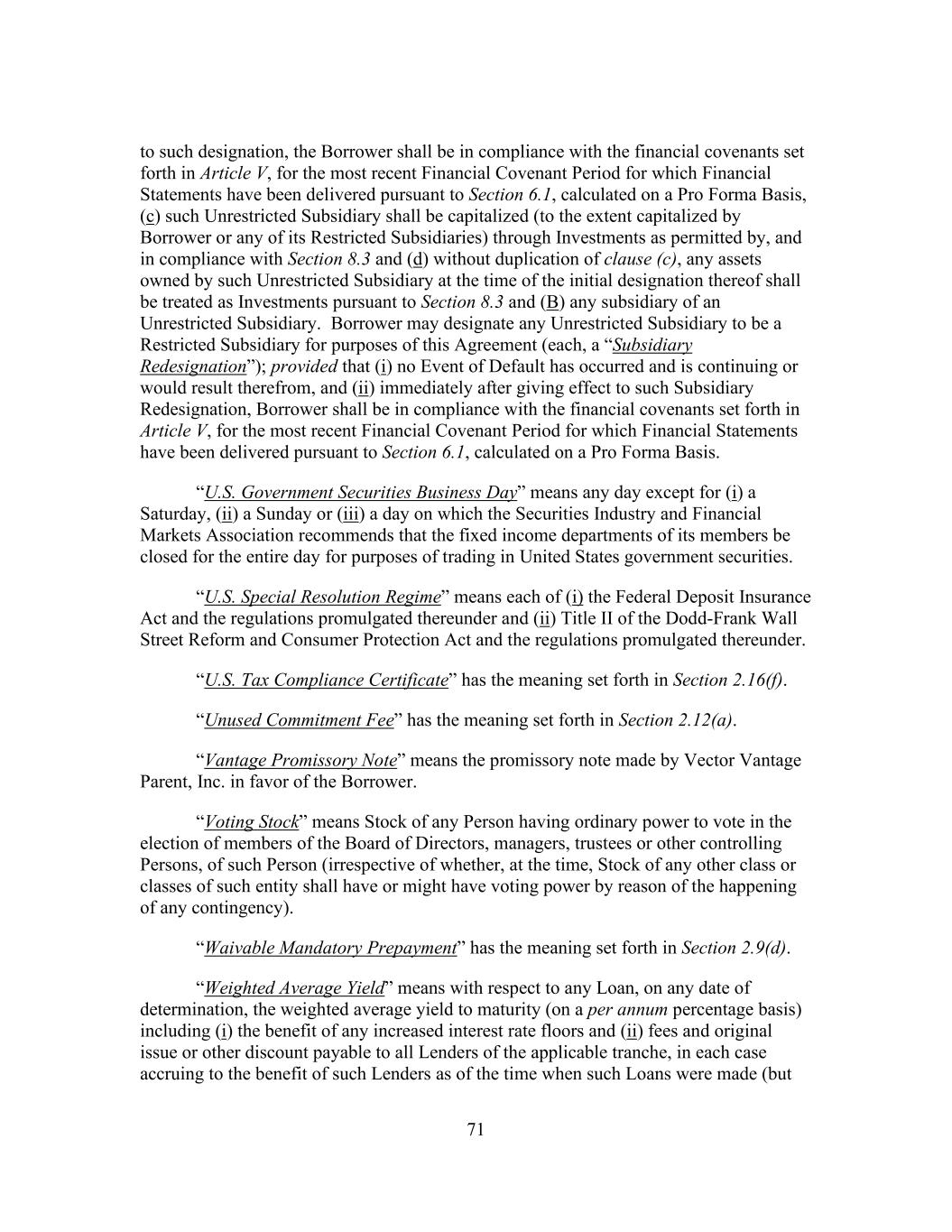 71 to such designation, the Borrower shall be in compliance with the financial covenants set forth in Article V, for the most recent Financial Covenant Period for which Financial Statements have been delivered pursuant to Section 6.1, calculated on a Pro Forma Basis, (c) such Unrestricted Subsidiary shall be capitalized (to the extent capitalized by Borrower or any of its Restricted Subsidiaries) through Investments as permitted by, and in compliance with Section 8.3 and (d) without duplication of clause (c), any assets owned by such Unrestricted Subsidiary at the time of the initial designation thereof shall be treated as Investments pursuant to Section 8.3 and (B) any subsidiary of an Unrestricted Subsidiary. Borrower may designate any Unrestricted Subsidiary to be a Restricted Subsidiary for purposes of this Agreement (each, a “Subsidiary Redesignation”); provided that (i) no Event of Default has occurred and is continuing or would result therefrom, and (ii) immediately after giving effect to such Subsidiary Redesignation, Borrower shall be in compliance with the financial covenants set forth in Article V, for the most recent Financial Covenant Period for which Financial Statements have been delivered pursuant to Section 6.1, calculated on a Pro Forma Basis. “U.S. Government Securities Business Day” means any day except for (i) a Saturday, (ii) a Sunday or (iii) a day on which the Securities Industry and Financial Markets Association recommends that the fixed income departments of its members be closed for the entire day for purposes of trading in United States government securities. “U.S. Special Resolution Regime” means each of (i) the Federal Deposit Insurance Act and the regulations promulgated thereunder and (ii) Title II of the Dodd-Frank Wall Street Reform and Consumer Protection Act and the regulations promulgated thereunder. “U.S. Tax Compliance Certificate” has the meaning set forth in Section 2.16(f). “Unused Commitment Fee” has the meaning set forth in Section 2.12(a). “Vantage Promissory Note” means the promissory note made by Vector Vantage Parent, Inc. in favor of the Borrower. “Voting Stock” means Stock of any Person having ordinary power to vote in the election of members of the Board of Directors, managers, trustees or other controlling Persons, of such Person (irrespective of whether, at the time, Stock of any other class or classes of such entity shall have or might have voting power by reason of the happening of any contingency). “Waivable Mandatory Prepayment” has the meaning set forth in Section 2.9(d). “Weighted Average Yield” means with respect to any Loan, on any date of determination, the weighted average yield to maturity (on a per annum percentage basis) including (i) the benefit of any increased interest rate floors and (ii) fees and original issue or other discount payable to all Lenders of the applicable tranche, in each case accruing to the benefit of such Lenders as of the time when such Loans were made (but