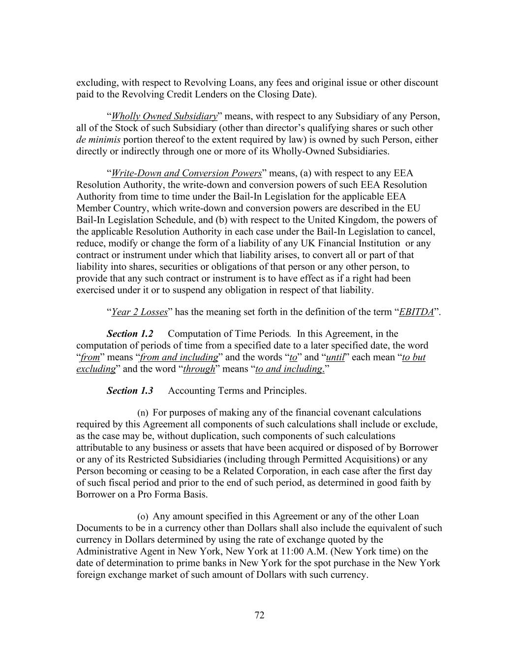 72 excluding, with respect to Revolving Loans, any fees and original issue or other discount paid to the Revolving Credit Lenders on the Closing Date). “Wholly Owned Subsidiary” means, with respect to any Subsidiary of any Person, all of the Stock of such Subsidiary (other than director’s qualifying shares or such other de minimis portion thereof to the extent required by law) is owned by such Person, either directly or indirectly through one or more of its Wholly-Owned Subsidiaries. “Write-Down and Conversion Powers” means, (a) with respect to any EEA Resolution Authority, the write-down and conversion powers of such EEA Resolution Authority from time to time under the Bail-In Legislation for the applicable EEA Member Country, which write-down and conversion powers are described in the EU Bail-In Legislation Schedule, and (b) with respect to the United Kingdom, the powers of the applicable Resolution Authority in each case under the Bail-In Legislation to cancel, reduce, modify or change the form of a liability of any UK Financial Institution or any contract or instrument under which that liability arises, to convert all or part of that liability into shares, securities or obligations of that person or any other person, to provide that any such contract or instrument is to have effect as if a right had been exercised under it or to suspend any obligation in respect of that liability. “Year 2 Losses” has the meaning set forth in the definition of the term “EBITDA”. Section 1.2 Computation of Time Periods. In this Agreement, in the computation of periods of time from a specified date to a later specified date, the word “from” means “from and including” and the words “to” and “until” each mean “to but excluding” and the word “through” means “to and including.” Section 1.3 Accounting Terms and Principles. (n) For purposes of making any of the financial covenant calculations required by this Agreement all components of such calculations shall include or exclude, as the case may be, without duplication, such components of such calculations attributable to any business or assets that have been acquired or disposed of by Borrower or any of its Restricted Subsidiaries (including through Permitted Acquisitions) or any Person becoming or ceasing to be a Related Corporation, in each case after the first day of such fiscal period and prior to the end of such period, as determined in good faith by Borrower on a Pro Forma Basis. (o) Any amount specified in this Agreement or any of the other Loan Documents to be in a currency other than Dollars shall also include the equivalent of such currency in Dollars determined by using the rate of exchange quoted by the Administrative Agent in New York, New York at 11:00 A.M. (New York time) on the date of determination to prime banks in New York for the spot purchase in the New York foreign exchange market of such amount of Dollars with such currency.