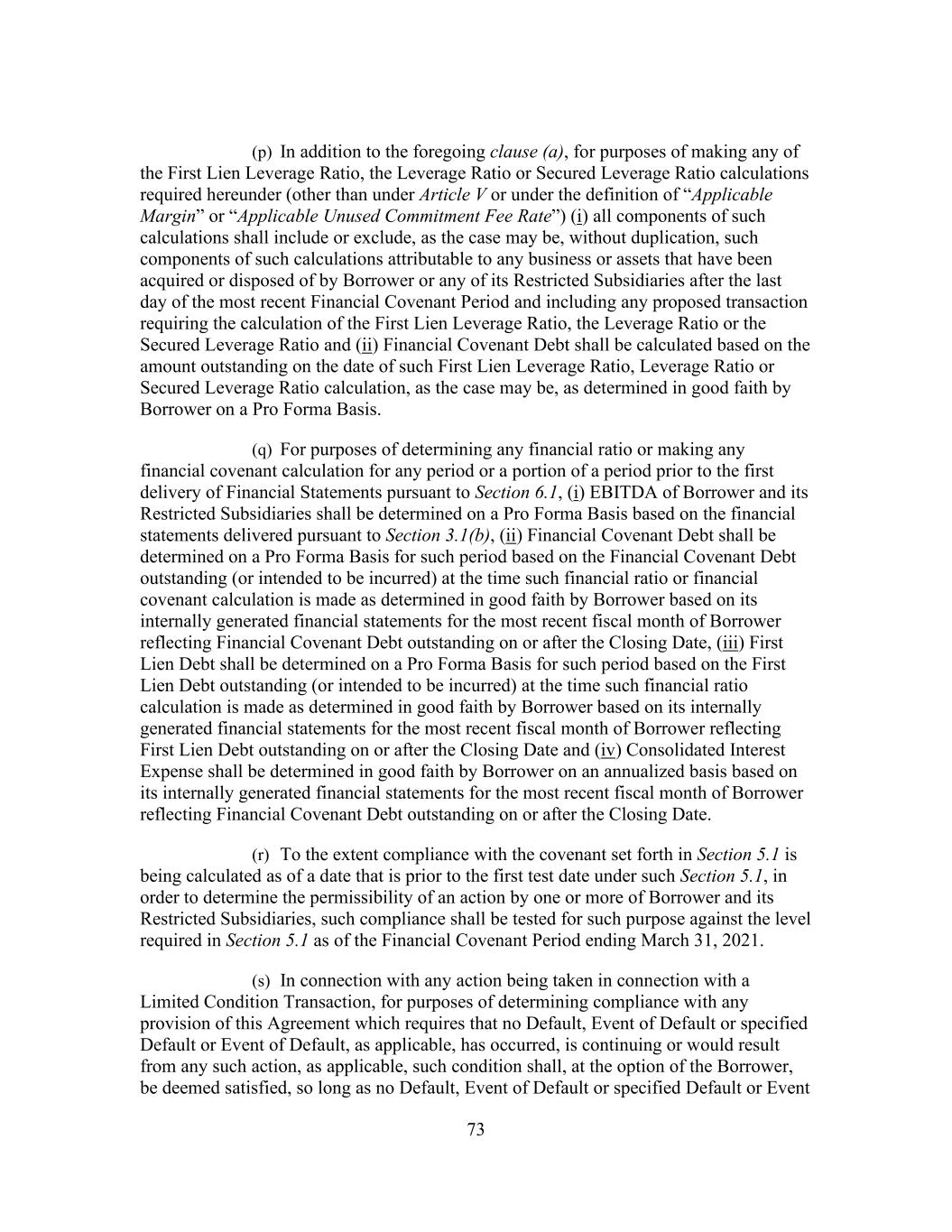 73 (p) In addition to the foregoing clause (a), for purposes of making any of the First Lien Leverage Ratio, the Leverage Ratio or Secured Leverage Ratio calculations required hereunder (other than under Article V or under the definition of “Applicable Margin” or “Applicable Unused Commitment Fee Rate”) (i) all components of such calculations shall include or exclude, as the case may be, without duplication, such components of such calculations attributable to any business or assets that have been acquired or disposed of by Borrower or any of its Restricted Subsidiaries after the last day of the most recent Financial Covenant Period and including any proposed transaction requiring the calculation of the First Lien Leverage Ratio, the Leverage Ratio or the Secured Leverage Ratio and (ii) Financial Covenant Debt shall be calculated based on the amount outstanding on the date of such First Lien Leverage Ratio, Leverage Ratio or Secured Leverage Ratio calculation, as the case may be, as determined in good faith by Borrower on a Pro Forma Basis. (q) For purposes of determining any financial ratio or making any financial covenant calculation for any period or a portion of a period prior to the first delivery of Financial Statements pursuant to Section 6.1, (i) EBITDA of Borrower and its Restricted Subsidiaries shall be determined on a Pro Forma Basis based on the financial statements delivered pursuant to Section 3.1(b), (ii) Financial Covenant Debt shall be determined on a Pro Forma Basis for such period based on the Financial Covenant Debt outstanding (or intended to be incurred) at the time such financial ratio or financial covenant calculation is made as determined in good faith by Borrower based on its internally generated financial statements for the most recent fiscal month of Borrower reflecting Financial Covenant Debt outstanding on or after the Closing Date, (iii) First Lien Debt shall be determined on a Pro Forma Basis for such period based on the First Lien Debt outstanding (or intended to be incurred) at the time such financial ratio calculation is made as determined in good faith by Borrower based on its internally generated financial statements for the most recent fiscal month of Borrower reflecting First Lien Debt outstanding on or after the Closing Date and (iv) Consolidated Interest Expense shall be determined in good faith by Borrower on an annualized basis based on its internally generated financial statements for the most recent fiscal month of Borrower reflecting Financial Covenant Debt outstanding on or after the Closing Date. (r) To the extent compliance with the covenant set forth in Section 5.1 is being calculated as of a date that is prior to the first test date under such Section 5.1, in order to determine the permissibility of an action by one or more of Borrower and its Restricted Subsidiaries, such compliance shall be tested for such purpose against the level required in Section 5.1 as of the Financial Covenant Period ending March 31, 2021. (s) In connection with any action being taken in connection with a Limited Condition Transaction, for purposes of determining compliance with any provision of this Agreement which requires that no Default, Event of Default or specified Default or Event of Default, as applicable, has occurred, is continuing or would result from any such action, as applicable, such condition shall, at the option of the Borrower, be deemed satisfied, so long as no Default, Event of Default or specified Default or Event