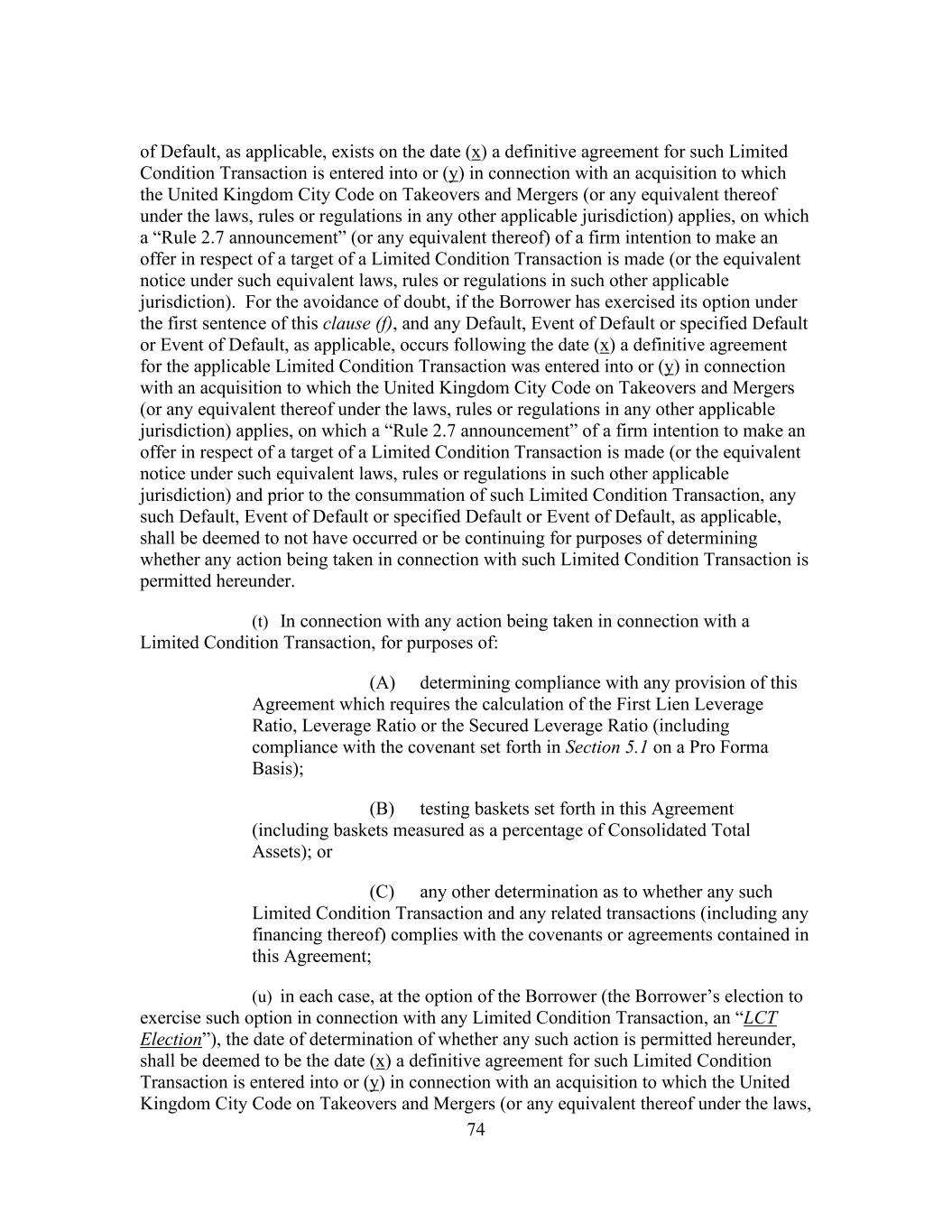 74 of Default, as applicable, exists on the date (x) a definitive agreement for such Limited Condition Transaction is entered into or (y) in connection with an acquisition to which the United Kingdom City Code on Takeovers and Mergers (or any equivalent thereof under the laws, rules or regulations in any other applicable jurisdiction) applies, on which a “Rule 2.7 announcement” (or any equivalent thereof) of a firm intention to make an offer in respect of a target of a Limited Condition Transaction is made (or the equivalent notice under such equivalent laws, rules or regulations in such other applicable jurisdiction). For the avoidance of doubt, if the Borrower has exercised its option under the first sentence of this clause (f), and any Default, Event of Default or specified Default or Event of Default, as applicable, occurs following the date (x) a definitive agreement for the applicable Limited Condition Transaction was entered into or (y) in connection with an acquisition to which the United Kingdom City Code on Takeovers and Mergers (or any equivalent thereof under the laws, rules or regulations in any other applicable jurisdiction) applies, on which a “Rule 2.7 announcement” of a firm intention to make an offer in respect of a target of a Limited Condition Transaction is made (or the equivalent notice under such equivalent laws, rules or regulations in such other applicable jurisdiction) and prior to the consummation of such Limited Condition Transaction, any such Default, Event of Default or specified Default or Event of Default, as applicable, shall be deemed to not have occurred or be continuing for purposes of determining whether any action being taken in connection with such Limited Condition Transaction is permitted hereunder. (t) In connection with any action being taken in connection with a Limited Condition Transaction, for purposes of: (A) determining compliance with any provision of this Agreement which requires the calculation of the First Lien Leverage Ratio, Leverage Ratio or the Secured Leverage Ratio (including compliance with the covenant set forth in Section 5.1 on a Pro Forma Basis); (B) testing baskets set forth in this Agreement (including baskets measured as a percentage of Consolidated Total Assets); or (C) any other determination as to whether any such Limited Condition Transaction and any related transactions (including any financing thereof) complies with the covenants or agreements contained in this Agreement; (u) in each case, at the option of the Borrower (the Borrower’s election to exercise such option in connection with any Limited Condition Transaction, an “LCT Election”), the date of determination of whether any such action is permitted hereunder, shall be deemed to be the date (x) a definitive agreement for such Limited Condition Transaction is entered into or (y) in connection with an acquisition to which the United Kingdom City Code on Takeovers and Mergers (or any equivalent thereof under the laws,