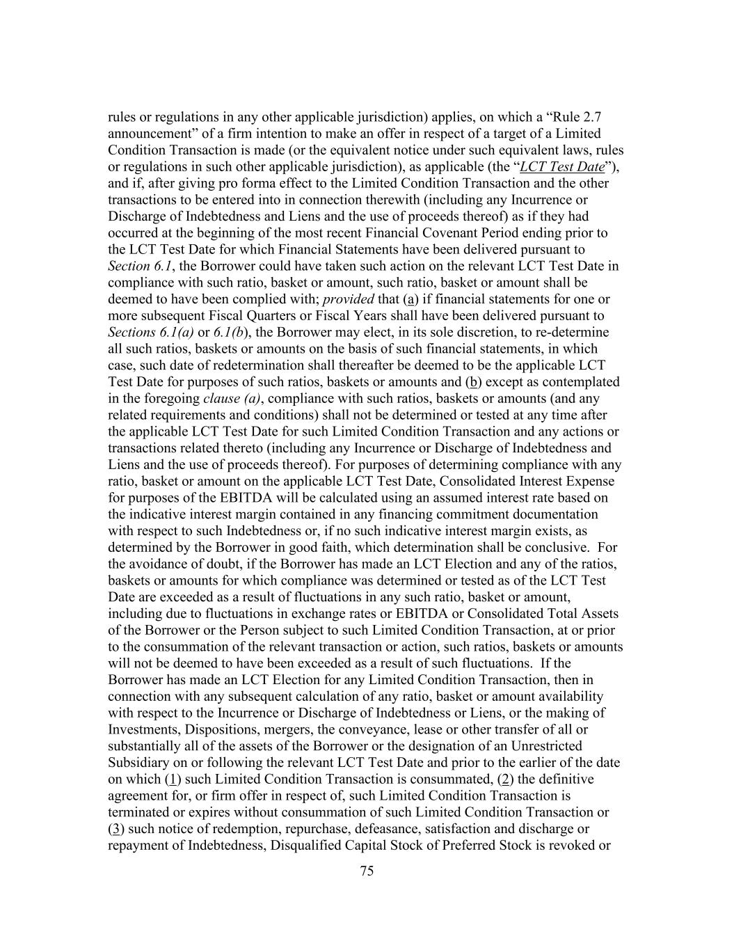 75 rules or regulations in any other applicable jurisdiction) applies, on which a “Rule 2.7 announcement” of a firm intention to make an offer in respect of a target of a Limited Condition Transaction is made (or the equivalent notice under such equivalent laws, rules or regulations in such other applicable jurisdiction), as applicable (the “LCT Test Date”), and if, after giving pro forma effect to the Limited Condition Transaction and the other transactions to be entered into in connection therewith (including any Incurrence or Discharge of Indebtedness and Liens and the use of proceeds thereof) as if they had occurred at the beginning of the most recent Financial Covenant Period ending prior to the LCT Test Date for which Financial Statements have been delivered pursuant to Section 6.1, the Borrower could have taken such action on the relevant LCT Test Date in compliance with such ratio, basket or amount, such ratio, basket or amount shall be deemed to have been complied with; provided that (a) if financial statements for one or more subsequent Fiscal Quarters or Fiscal Years shall have been delivered pursuant to Sections 6.1(a) or 6.1(b), the Borrower may elect, in its sole discretion, to re-determine all such ratios, baskets or amounts on the basis of such financial statements, in which case, such date of redetermination shall thereafter be deemed to be the applicable LCT Test Date for purposes of such ratios, baskets or amounts and (b) except as contemplated in the foregoing clause (a), compliance with such ratios, baskets or amounts (and any related requirements and conditions) shall not be determined or tested at any time after the applicable LCT Test Date for such Limited Condition Transaction and any actions or transactions related thereto (including any Incurrence or Discharge of Indebtedness and Liens and the use of proceeds thereof). For purposes of determining compliance with any ratio, basket or amount on the applicable LCT Test Date, Consolidated Interest Expense for purposes of the EBITDA will be calculated using an assumed interest rate based on the indicative interest margin contained in any financing commitment documentation with respect to such Indebtedness or, if no such indicative interest margin exists, as determined by the Borrower in good faith, which determination shall be conclusive. For the avoidance of doubt, if the Borrower has made an LCT Election and any of the ratios, baskets or amounts for which compliance was determined or tested as of the LCT Test Date are exceeded as a result of fluctuations in any such ratio, basket or amount, including due to fluctuations in exchange rates or EBITDA or Consolidated Total Assets of the Borrower or the Person subject to such Limited Condition Transaction, at or prior to the consummation of the relevant transaction or action, such ratios, baskets or amounts will not be deemed to have been exceeded as a result of such fluctuations. If the Borrower has made an LCT Election for any Limited Condition Transaction, then in connection with any subsequent calculation of any ratio, basket or amount availability with respect to the Incurrence or Discharge of Indebtedness or Liens, or the making of Investments, Dispositions, mergers, the conveyance, lease or other transfer of all or substantially all of the assets of the Borrower or the designation of an Unrestricted Subsidiary on or following the relevant LCT Test Date and prior to the earlier of the date on which (1) such Limited Condition Transaction is consummated, (2) the definitive agreement for, or firm offer in respect of, such Limited Condition Transaction is terminated or expires without consummation of such Limited Condition Transaction or (3) such notice of redemption, repurchase, defeasance, satisfaction and discharge or repayment of Indebtedness, Disqualified Capital Stock of Preferred Stock is revoked or