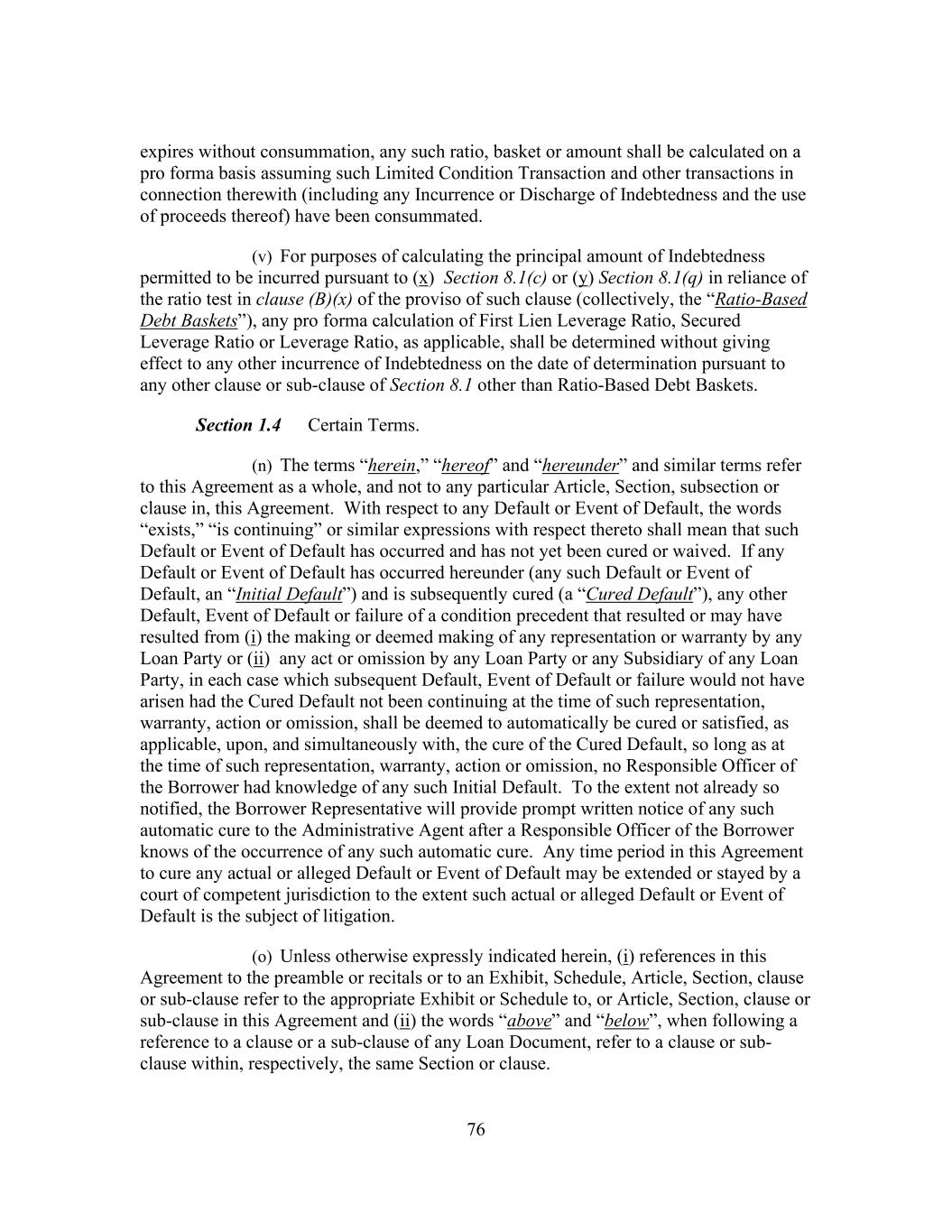 76 expires without consummation, any such ratio, basket or amount shall be calculated on a pro forma basis assuming such Limited Condition Transaction and other transactions in connection therewith (including any Incurrence or Discharge of Indebtedness and the use of proceeds thereof) have been consummated. (v) For purposes of calculating the principal amount of Indebtedness permitted to be incurred pursuant to (x) Section 8.1(c) or (y) Section 8.1(q) in reliance of the ratio test in clause (B)(x) of the proviso of such clause (collectively, the “Ratio-Based Debt Baskets”), any pro forma calculation of First Lien Leverage Ratio, Secured Leverage Ratio or Leverage Ratio, as applicable, shall be determined without giving effect to any other incurrence of Indebtedness on the date of determination pursuant to any other clause or sub-clause of Section 8.1 other than Ratio-Based Debt Baskets. Section 1.4 Certain Terms. (n) The terms “herein,” “hereof” and “hereunder” and similar terms refer to this Agreement as a whole, and not to any particular Article, Section, subsection or clause in, this Agreement. With respect to any Default or Event of Default, the words “exists,” “is continuing” or similar expressions with respect thereto shall mean that such Default or Event of Default has occurred and has not yet been cured or waived. If any Default or Event of Default has occurred hereunder (any such Default or Event of Default, an “Initial Default”) and is subsequently cured (a “Cured Default”), any other Default, Event of Default or failure of a condition precedent that resulted or may have resulted from (i) the making or deemed making of any representation or warranty by any Loan Party or (ii) any act or omission by any Loan Party or any Subsidiary of any Loan Party, in each case which subsequent Default, Event of Default or failure would not have arisen had the Cured Default not been continuing at the time of such representation, warranty, action or omission, shall be deemed to automatically be cured or satisfied, as applicable, upon, and simultaneously with, the cure of the Cured Default, so long as at the time of such representation, warranty, action or omission, no Responsible Officer of the Borrower had knowledge of any such Initial Default. To the extent not already so notified, the Borrower Representative will provide prompt written notice of any such automatic cure to the Administrative Agent after a Responsible Officer of the Borrower knows of the occurrence of any such automatic cure. Any time period in this Agreement to cure any actual or alleged Default or Event of Default may be extended or stayed by a court of competent jurisdiction to the extent such actual or alleged Default or Event of Default is the subject of litigation. (o) Unless otherwise expressly indicated herein, (i) references in this Agreement to the preamble or recitals or to an Exhibit, Schedule, Article, Section, clause or sub-clause refer to the appropriate Exhibit or Schedule to, or Article, Section, clause or sub-clause in this Agreement and (ii) the words “above” and “below”, when following a reference to a clause or a sub-clause of any Loan Document, refer to a clause or sub- clause within, respectively, the same Section or clause.