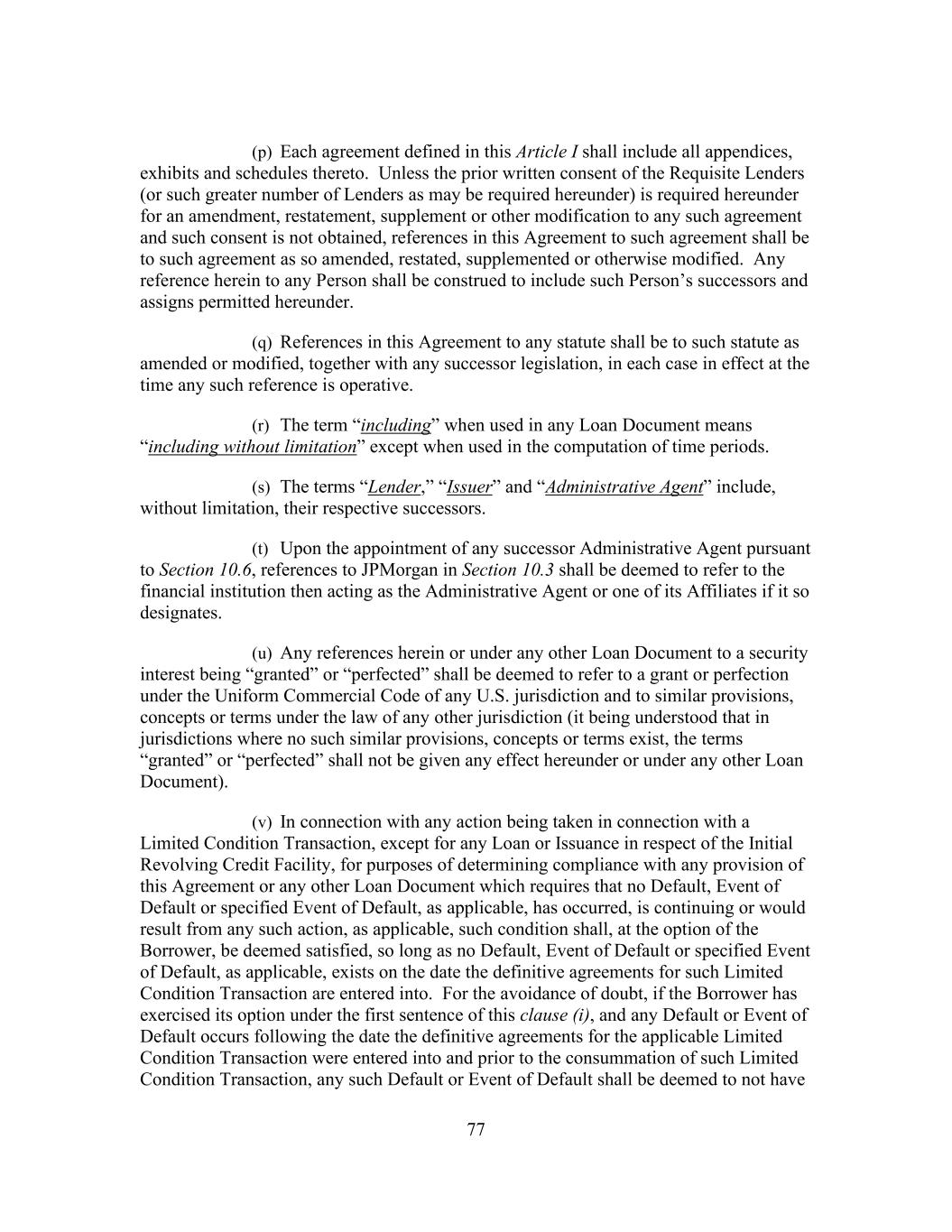 77 (p) Each agreement defined in this Article I shall include all appendices, exhibits and schedules thereto. Unless the prior written consent of the Requisite Lenders (or such greater number of Lenders as may be required hereunder) is required hereunder for an amendment, restatement, supplement or other modification to any such agreement and such consent is not obtained, references in this Agreement to such agreement shall be to such agreement as so amended, restated, supplemented or otherwise modified. Any reference herein to any Person shall be construed to include such Person’s successors and assigns permitted hereunder. (q) References in this Agreement to any statute shall be to such statute as amended or modified, together with any successor legislation, in each case in effect at the time any such reference is operative. (r) The term “including” when used in any Loan Document means “including without limitation” except when used in the computation of time periods. (s) The terms “Lender,” “Issuer” and “Administrative Agent” include, without limitation, their respective successors. (t) Upon the appointment of any successor Administrative Agent pursuant to Section 10.6, references to JPMorgan in Section 10.3 shall be deemed to refer to the financial institution then acting as the Administrative Agent or one of its Affiliates if it so designates. (u) Any references herein or under any other Loan Document to a security interest being “granted” or “perfected” shall be deemed to refer to a grant or perfection under the Uniform Commercial Code of any U.S. jurisdiction and to similar provisions, concepts or terms under the law of any other jurisdiction (it being understood that in jurisdictions where no such similar provisions, concepts or terms exist, the terms “granted” or “perfected” shall not be given any effect hereunder or under any other Loan Document). (v) In connection with any action being taken in connection with a Limited Condition Transaction, except for any Loan or Issuance in respect of the Initial Revolving Credit Facility, for purposes of determining compliance with any provision of this Agreement or any other Loan Document which requires that no Default, Event of Default or specified Event of Default, as applicable, has occurred, is continuing or would result from any such action, as applicable, such condition shall, at the option of the Borrower, be deemed satisfied, so long as no Default, Event of Default or specified Event of Default, as applicable, exists on the date the definitive agreements for such Limited Condition Transaction are entered into. For the avoidance of doubt, if the Borrower has exercised its option under the first sentence of this clause (i), and any Default or Event of Default occurs following the date the definitive agreements for the applicable Limited Condition Transaction were entered into and prior to the consummation of such Limited Condition Transaction, any such Default or Event of Default shall be deemed to not have