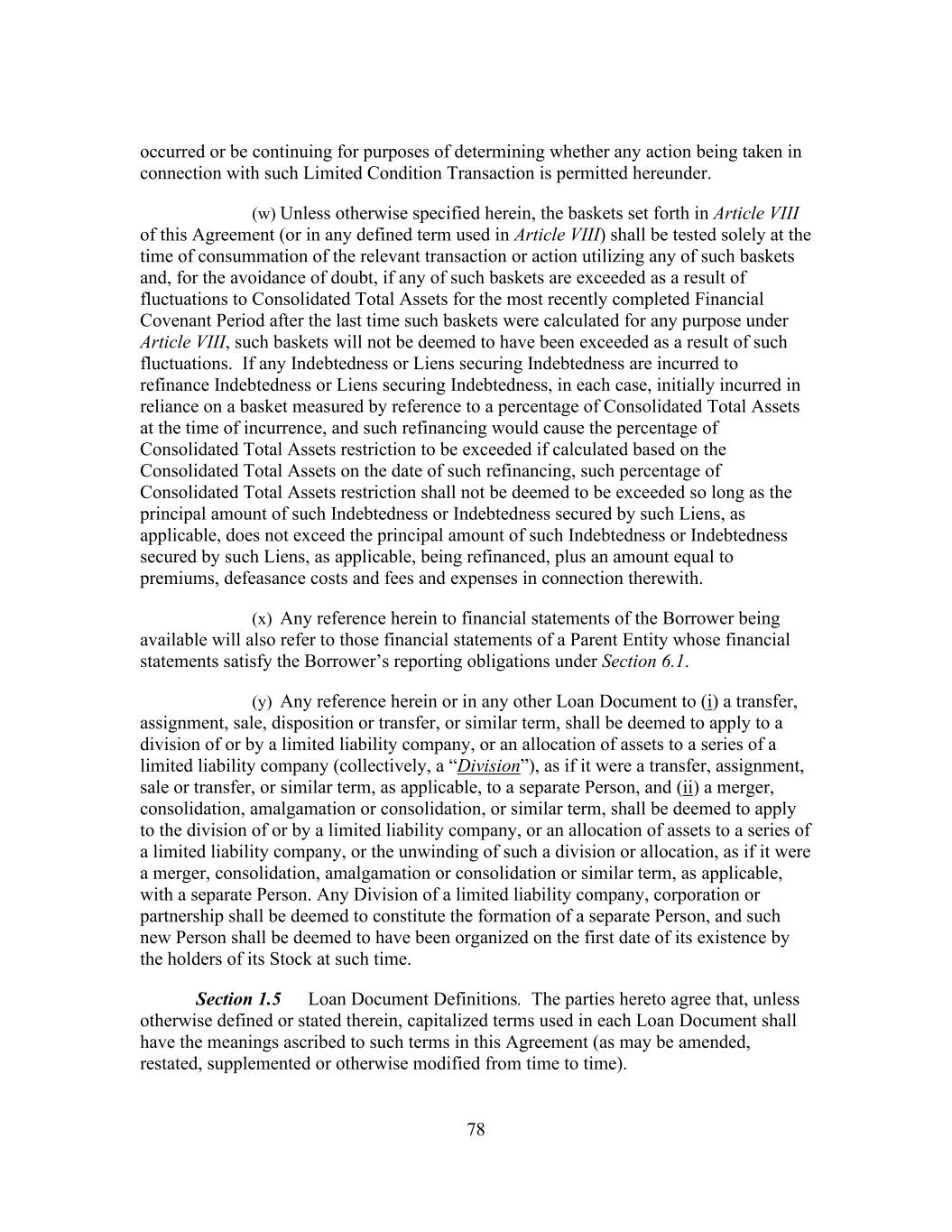 78 occurred or be continuing for purposes of determining whether any action being taken in connection with such Limited Condition Transaction is permitted hereunder. (w) Unless otherwise specified herein, the baskets set forth in Article VIII of this Agreement (or in any defined term used in Article VIII) shall be tested solely at the time of consummation of the relevant transaction or action utilizing any of such baskets and, for the avoidance of doubt, if any of such baskets are exceeded as a result of fluctuations to Consolidated Total Assets for the most recently completed Financial Covenant Period after the last time such baskets were calculated for any purpose under Article VIII, such baskets will not be deemed to have been exceeded as a result of such fluctuations. If any Indebtedness or Liens securing Indebtedness are incurred to refinance Indebtedness or Liens securing Indebtedness, in each case, initially incurred in reliance on a basket measured by reference to a percentage of Consolidated Total Assets at the time of incurrence, and such refinancing would cause the percentage of Consolidated Total Assets restriction to be exceeded if calculated based on the Consolidated Total Assets on the date of such refinancing, such percentage of Consolidated Total Assets restriction shall not be deemed to be exceeded so long as the principal amount of such Indebtedness or Indebtedness secured by such Liens, as applicable, does not exceed the principal amount of such Indebtedness or Indebtedness secured by such Liens, as applicable, being refinanced, plus an amount equal to premiums, defeasance costs and fees and expenses in connection therewith. (x) Any reference herein to financial statements of the Borrower being available will also refer to those financial statements of a Parent Entity whose financial statements satisfy the Borrower’s reporting obligations under Section 6.1. (y) Any reference herein or in any other Loan Document to (i) a transfer, assignment, sale, disposition or transfer, or similar term, shall be deemed to apply to a division of or by a limited liability company, or an allocation of assets to a series of a limited liability company (collectively, a “Division”), as if it were a transfer, assignment, sale or transfer, or similar term, as applicable, to a separate Person, and (ii) a merger, consolidation, amalgamation or consolidation, or similar term, shall be deemed to apply to the division of or by a limited liability company, or an allocation of assets to a series of a limited liability company, or the unwinding of such a division or allocation, as if it were a merger, consolidation, amalgamation or consolidation or similar term, as applicable, with a separate Person. Any Division of a limited liability company, corporation or partnership shall be deemed to constitute the formation of a separate Person, and such new Person shall be deemed to have been organized on the first date of its existence by the holders of its Stock at such time. Section 1.5 Loan Document Definitions. The parties hereto agree that, unless otherwise defined or stated therein, capitalized terms used in each Loan Document shall have the meanings ascribed to such terms in this Agreement (as may be amended, restated, supplemented or otherwise modified from time to time).