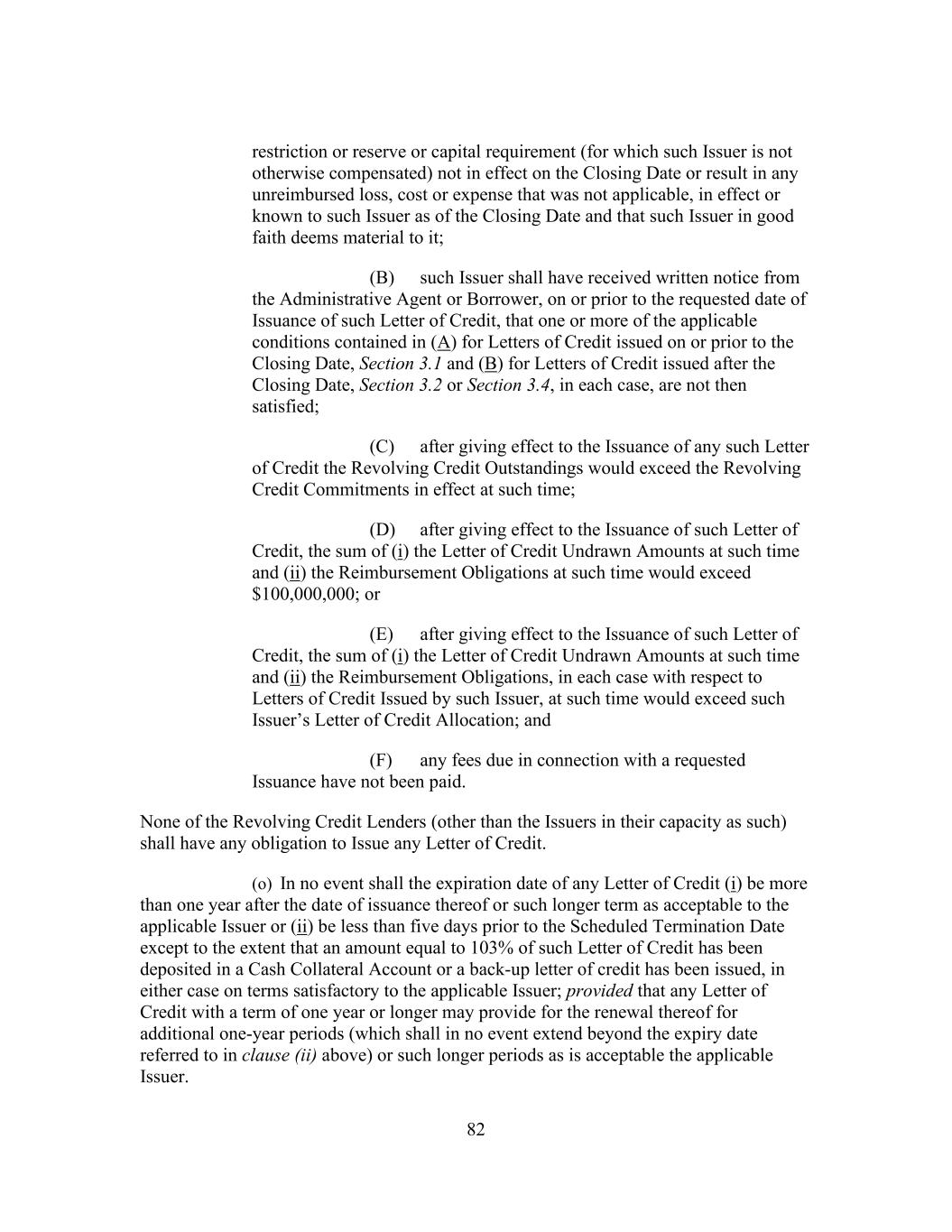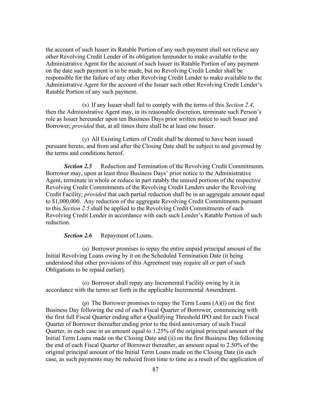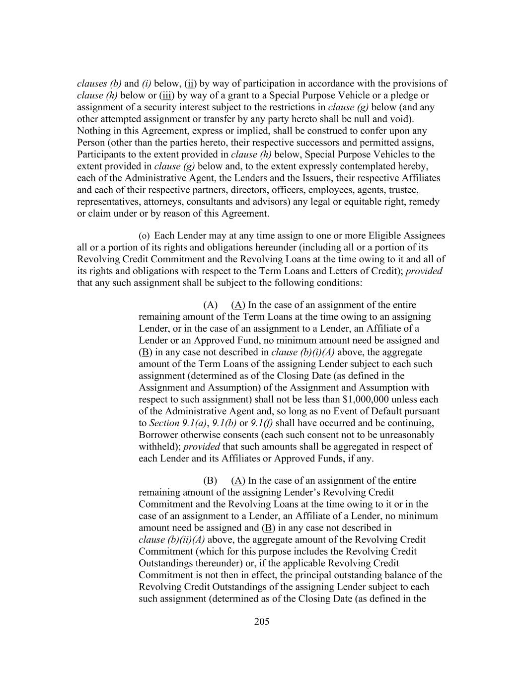 205 clauses (b) and (i) below, (ii) by way of participation in accordance with the provisions of clause (h) below or (iii) by way of a grant to a Special Purpose Vehicle or a pledge or assignment of a security interest subject to the restrictions in clause (g) below (and any other attempted assignment or transfer by any party hereto shall be null and void). Nothing in this Agreement, express or implied, shall be construed to confer upon any Person (other than the parties hereto, their respective successors and permitted assigns, Participants to the extent provided in clause (h) below, Special Purpose Vehicles to the extent provided in clause (g) below and, to the extent expressly contemplated hereby, each of the Administrative Agent, the Lenders and the Issuers, their respective Affiliates and each of their respective partners, directors, officers, employees, agents, trustee, representatives, attorneys, consultants and advisors) any legal or equitable right, remedy or claim under or by reason of this Agreement. (o) Each Lender may at any time assign to one or more Eligible Assignees all or a portion of its rights and obligations hereunder (including all or a portion of its Revolving Credit Commitment and the Revolving Loans at the time owing to it and all of its rights and obligations with respect to the Term Loans and Letters of Credit); provided that any such assignment shall be subject to the following conditions: (A) (A) In the case of an assignment of the entire remaining amount of the Term Loans at the time owing to an assigning Lender, or in the case of an assignment to a Lender, an Affiliate of a Lender or an Approved Fund, no minimum amount need be assigned and (B) in any case not described in clause (b)(i)(A) above, the aggregate amount of the Term Loans of the assigning Lender subject to each such assignment (determined as of the Closing Date (as defined in the Assignment and Assumption) of the Assignment and Assumption with respect to such assignment) shall not be less than $1,000,000 unless each of the Administrative Agent and, so long as no Event of Default pursuant to Section 9.1(a), 9.1(b) or 9.1(f) shall have occurred and be continuing, Borrower otherwise consents (each such consent not to be unreasonably withheld); provided that such amounts shall be aggregated in respect of each Lender and its Affiliates or Approved Funds, if any. (B) (A) In the case of an assignment of the entire remaining amount of the assigning Lender’s Revolving Credit Commitment and the Revolving Loans at the time owing to it or in the case of an assignment to a Lender, an Affiliate of a Lender, no minimum amount need be assigned and (B) in any case not described in clause (b)(ii)(A) above, the aggregate amount of the Revolving Credit Commitment (which for this purpose includes the Revolving Credit Outstandings thereunder) or, if the applicable Revolving Credit Commitment is not then in effect, the principal outstanding balance of the Revolving Credit Outstandings of the assigning Lender subject to each such assignment (determined as of the Closing Date (as defined in the