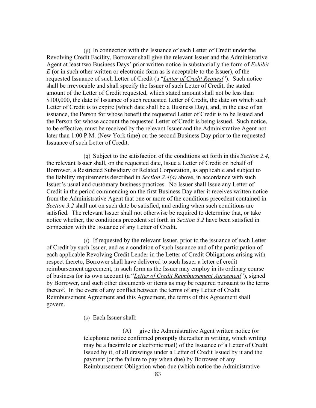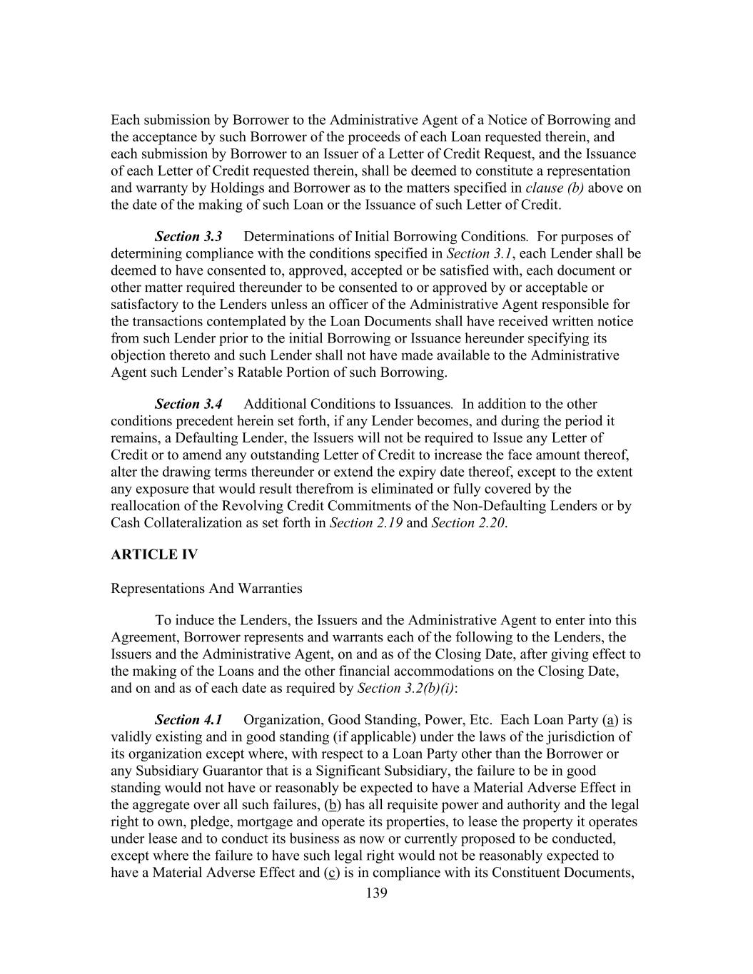 139 Each submission by Borrower to the Administrative Agent of a Notice of Borrowing and the acceptance by such Borrower of the proceeds of each Loan requested therein, and each submission by Borrower to an Issuer of a Letter of Credit Request, and the Issuance of each Letter of Credit requested therein, shall be deemed to constitute a representation and warranty by Holdings and Borrower as to the matters specified in clause (b) above on the date of the making of such Loan or the Issuance of such Letter of Credit. Section 3.3 Determinations of Initial Borrowing Conditions. For purposes of determining compliance with the conditions specified in Section 3.1, each Lender shall be deemed to have consented to, approved, accepted or be satisfied with, each document or other matter required thereunder to be consented to or approved by or acceptable or satisfactory to the Lenders unless an officer of the Administrative Agent responsible for the transactions contemplated by the Loan Documents shall have received written notice from such Lender prior to the initial Borrowing or Issuance hereunder specifying its objection thereto and such Lender shall not have made available to the Administrative Agent such Lender’s Ratable Portion of such Borrowing. Section 3.4 Additional Conditions to Issuances. In addition to the other conditions precedent herein set forth, if any Lender becomes, and during the period it remains, a Defaulting Lender, the Issuers will not be required to Issue any Letter of Credit or to amend any outstanding Letter of Credit to increase the face amount thereof, alter the drawing terms thereunder or extend the expiry date thereof, except to the extent any exposure that would result therefrom is eliminated or fully covered by the reallocation of the Revolving Credit Commitments of the Non-Defaulting Lenders or by Cash Collateralization as set forth in Section 2.19 and Section 2.20. ARTICLE IV Representations And Warranties To induce the Lenders, the Issuers and the Administrative Agent to enter into this Agreement, Borrower represents and warrants each of the following to the Lenders, the Issuers and the Administrative Agent, on and as of the Closing Date, after giving effect to the making of the Loans and the other financial accommodations on the Closing Date, and on and as of each date as required by Section 3.2(b)(i): Section 4.1 Organization, Good Standing, Power, Etc. Each Loan Party (a) is validly existing and in good standing (if applicable) under the laws of the jurisdiction of its organization except where, with respect to a Loan Party other than the Borrower or any Subsidiary Guarantor that is a Significant Subsidiary, the failure to be in good standing would not have or reasonably be expected to have a Material Adverse Effect in the aggregate over all such failures, (b) has all requisite power and authority and the legal right to own, pledge, mortgage and operate its properties, to lease the property it operates under lease and to conduct its business as now or currently proposed to be conducted, except where the failure to have such legal right would not be reasonably expected to have a Material Adverse Effect and (c) is in compliance with its Constituent Documents,