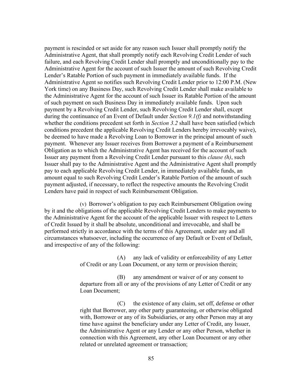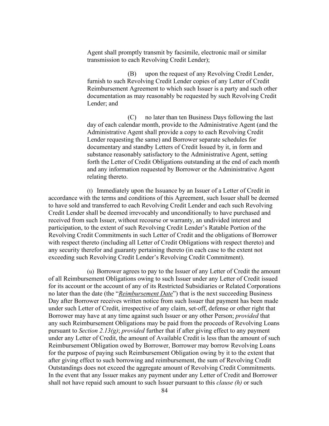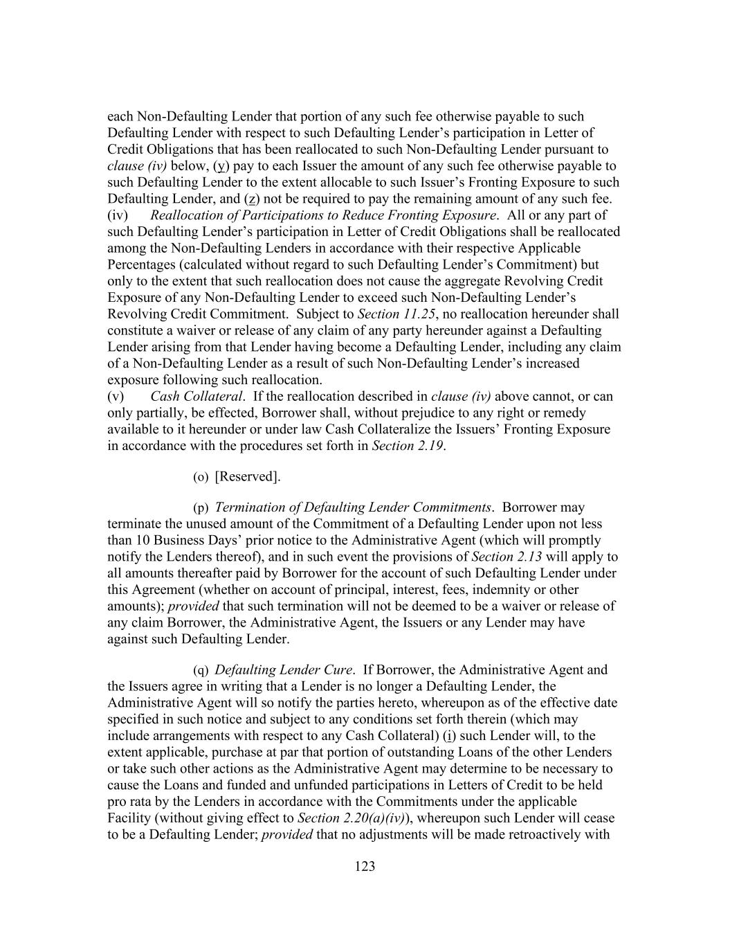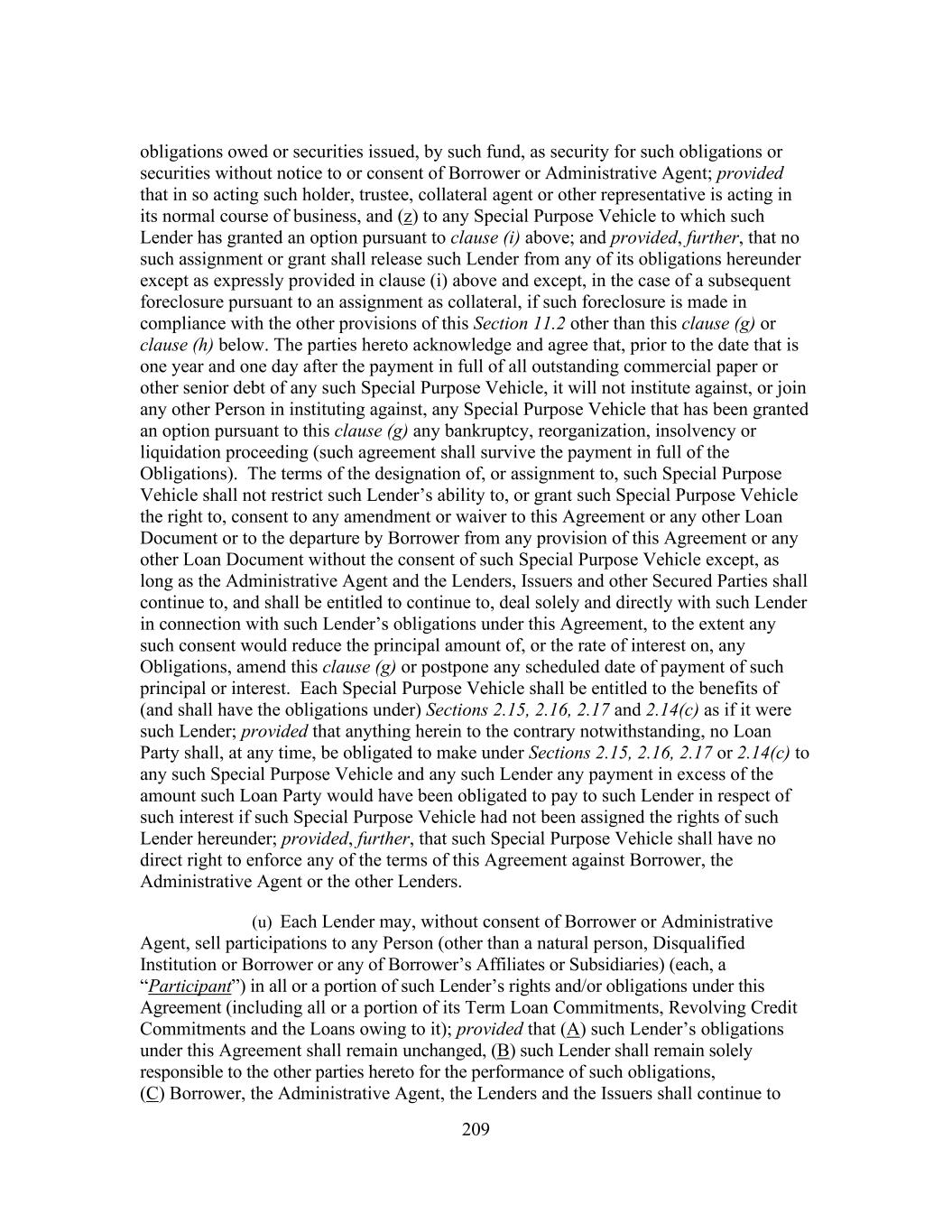 209 obligations owed or securities issued, by such fund, as security for such obligations or securities without notice to or consent of Borrower or Administrative Agent; provided that in so acting such holder, trustee, collateral agent or other representative is acting in its normal course of business, and (z) to any Special Purpose Vehicle to which such Lender has granted an option pursuant to clause (i) above; and provided, further, that no such assignment or grant shall release such Lender from any of its obligations hereunder except as expressly provided in clause (i) above and except, in the case of a subsequent foreclosure pursuant to an assignment as collateral, if such foreclosure is made in compliance with the other provisions of this Section 11.2 other than this clause (g) or clause (h) below. The parties hereto acknowledge and agree that, prior to the date that is one year and one day after the payment in full of all outstanding commercial paper or other senior debt of any such Special Purpose Vehicle, it will not institute against, or join any other Person in instituting against, any Special Purpose Vehicle that has been granted an option pursuant to this clause (g) any bankruptcy, reorganization, insolvency or liquidation proceeding (such agreement shall survive the payment in full of the Obligations). The terms of the designation of, or assignment to, such Special Purpose Vehicle shall not restrict such Lender’s ability to, or grant such Special Purpose Vehicle the right to, consent to any amendment or waiver to this Agreement or any other Loan Document or to the departure by Borrower from any provision of this Agreement or any other Loan Document without the consent of such Special Purpose Vehicle except, as long as the Administrative Agent and the Lenders, Issuers and other Secured Parties shall continue to, and shall be entitled to continue to, deal solely and directly with such Lender in connection with such Lender’s obligations under this Agreement, to the extent any such consent would reduce the principal amount of, or the rate of interest on, any Obligations, amend this clause (g) or postpone any scheduled date of payment of such principal or interest. Each Special Purpose Vehicle shall be entitled to the benefits of (and shall have the obligations under) Sections 2.15, 2.16, 2.17 and 2.14(c) as if it were such Lender; provided that anything herein to the contrary notwithstanding, no Loan Party shall, at any time, be obligated to make under Sections 2.15, 2.16, 2.17 or 2.14(c) to any such Special Purpose Vehicle and any such Lender any payment in excess of the amount such Loan Party would have been obligated to pay to such Lender in respect of such interest if such Special Purpose Vehicle had not been assigned the rights of such Lender hereunder; provided, further, that such Special Purpose Vehicle shall have no direct right to enforce any of the terms of this Agreement against Borrower, the Administrative Agent or the other Lenders. (u) Each Lender may, without consent of Borrower or Administrative Agent, sell participations to any Person (other than a natural person, Disqualified Institution or Borrower or any of Borrower’s Affiliates or Subsidiaries) (each, a “Participant”) in all or a portion of such Lender’s rights and/or obligations under this Agreement (including all or a portion of its Term Loan Commitments, Revolving Credit Commitments and the Loans owing to it); provided that (A) such Lender’s obligations under this Agreement shall remain unchanged, (B) such Lender shall remain solely responsible to the other parties hereto for the performance of such obligations, (C) Borrower, the Administrative Agent, the Lenders and the Issuers shall continue to