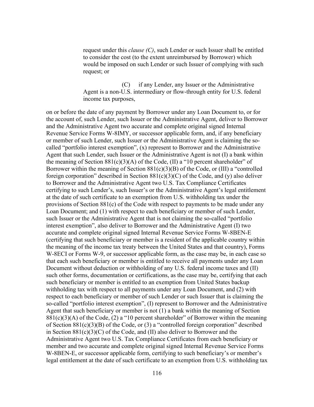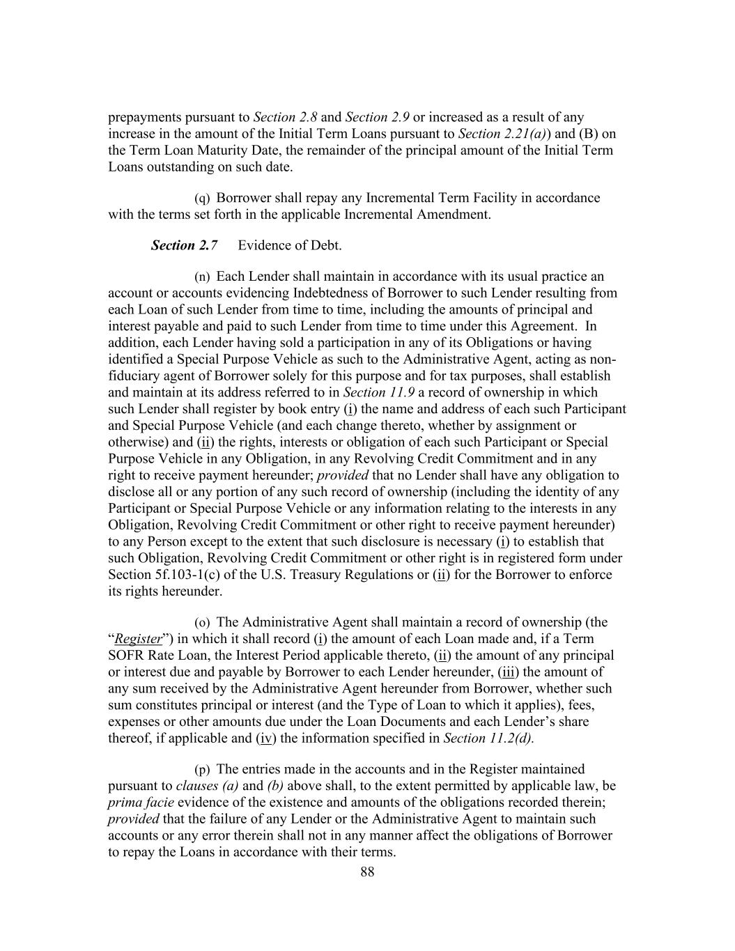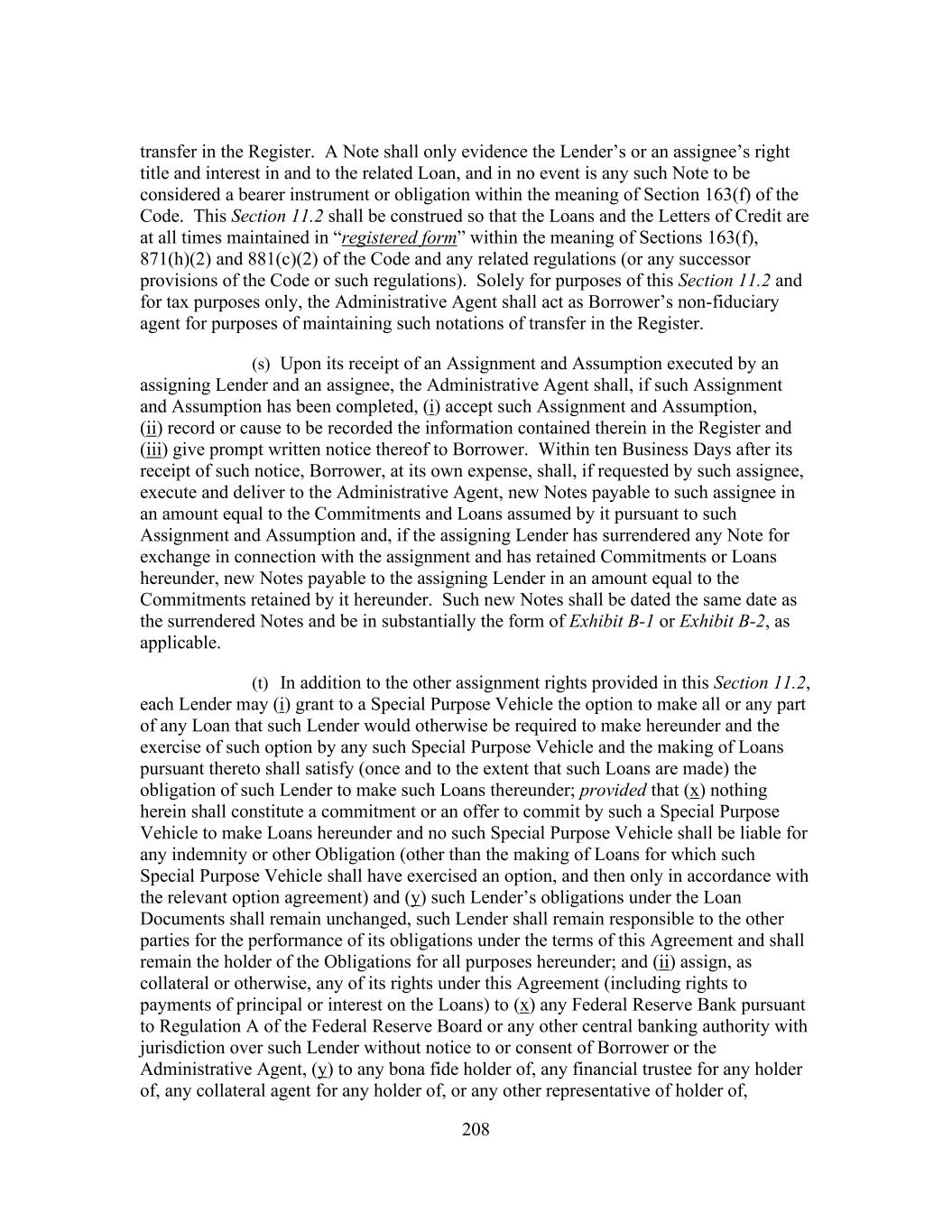 208 transfer in the Register. A Note shall only evidence the Lender’s or an assignee’s right title and interest in and to the related Loan, and in no event is any such Note to be considered a bearer instrument or obligation within the meaning of Section 163(f) of the Code. This Section 11.2 shall be construed so that the Loans and the Letters of Credit are at all times maintained in “registered form” within the meaning of Sections 163(f), 871(h)(2) and 881(c)(2) of the Code and any related regulations (or any successor provisions of the Code or such regulations). Solely for purposes of this Section 11.2 and for tax purposes only, the Administrative Agent shall act as Borrower’s non-fiduciary agent for purposes of maintaining such notations of transfer in the Register. (s) Upon its receipt of an Assignment and Assumption executed by an assigning Lender and an assignee, the Administrative Agent shall, if such Assignment and Assumption has been completed, (i) accept such Assignment and Assumption, (ii) record or cause to be recorded the information contained therein in the Register and (iii) give prompt written notice thereof to Borrower. Within ten Business Days after its receipt of such notice, Borrower, at its own expense, shall, if requested by such assignee, execute and deliver to the Administrative Agent, new Notes payable to such assignee in an amount equal to the Commitments and Loans assumed by it pursuant to such Assignment and Assumption and, if the assigning Lender has surrendered any Note for exchange in connection with the assignment and has retained Commitments or Loans hereunder, new Notes payable to the assigning Lender in an amount equal to the Commitments retained by it hereunder. Such new Notes shall be dated the same date as the surrendered Notes and be in substantially the form of Exhibit B-1 or Exhibit B-2, as applicable. (t) In addition to the other assignment rights provided in this Section 11.2, each Lender may (i) grant to a Special Purpose Vehicle the option to make all or any part of any Loan that such Lender would otherwise be required to make hereunder and the exercise of such option by any such Special Purpose Vehicle and the making of Loans pursuant thereto shall satisfy (once and to the extent that such Loans are made) the obligation of such Lender to make such Loans thereunder; provided that (x) nothing herein shall constitute a commitment or an offer to commit by such a Special Purpose Vehicle to make Loans hereunder and no such Special Purpose Vehicle shall be liable for any indemnity or other Obligation (other than the making of Loans for which such Special Purpose Vehicle shall have exercised an option, and then only in accordance with the relevant option agreement) and (y) such Lender’s obligations under the Loan Documents shall remain unchanged, such Lender shall remain responsible to the other parties for the performance of its obligations under the terms of this Agreement and shall remain the holder of the Obligations for all purposes hereunder; and (ii) assign, as collateral or otherwise, any of its rights under this Agreement (including rights to payments of principal or interest on the Loans) to (x) any Federal Reserve Bank pursuant to Regulation A of the Federal Reserve Board or any other central banking authority with jurisdiction over such Lender without notice to or consent of Borrower or the Administrative Agent, (y) to any bona fide holder of, any financial trustee for any holder of, any collateral agent for any holder of, or any other representative of holder of,