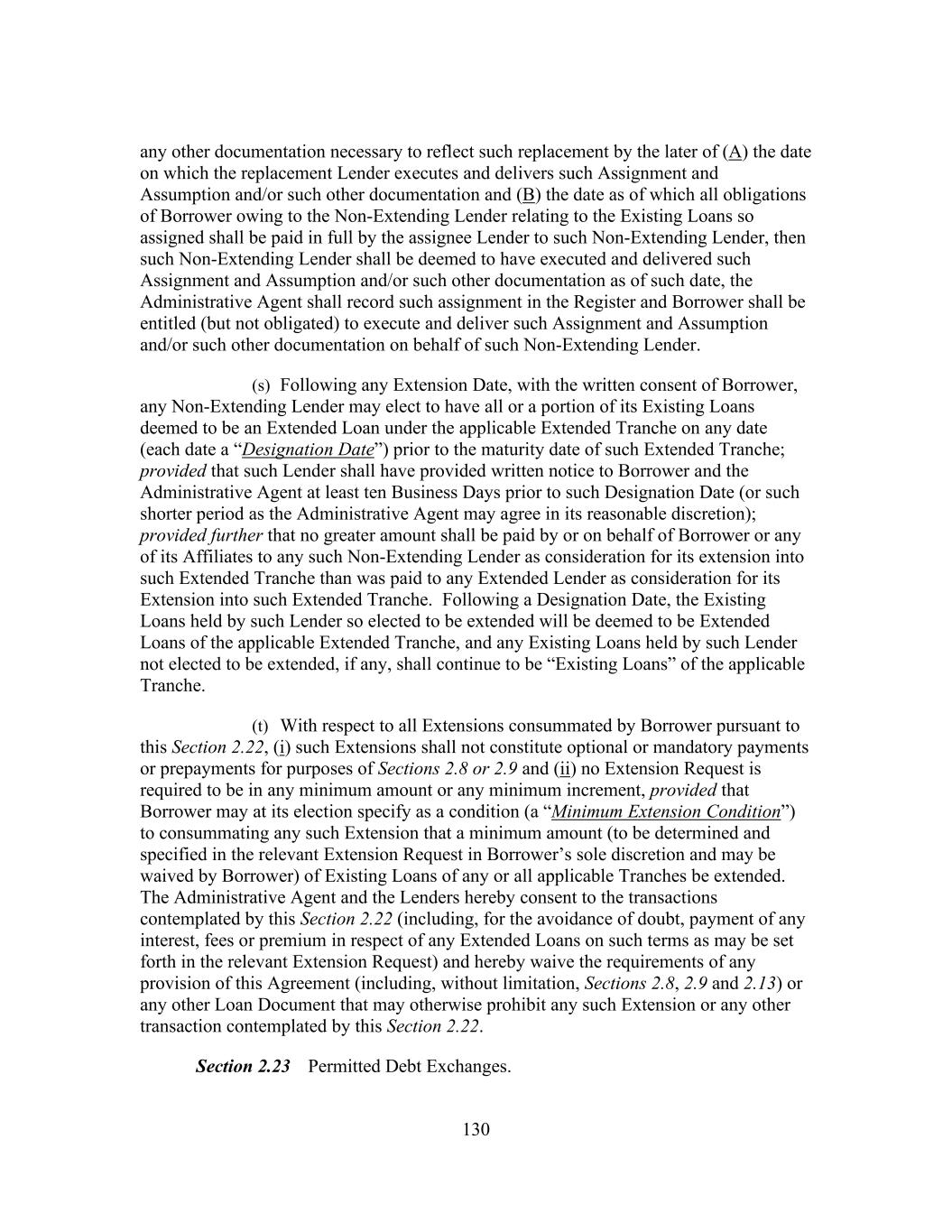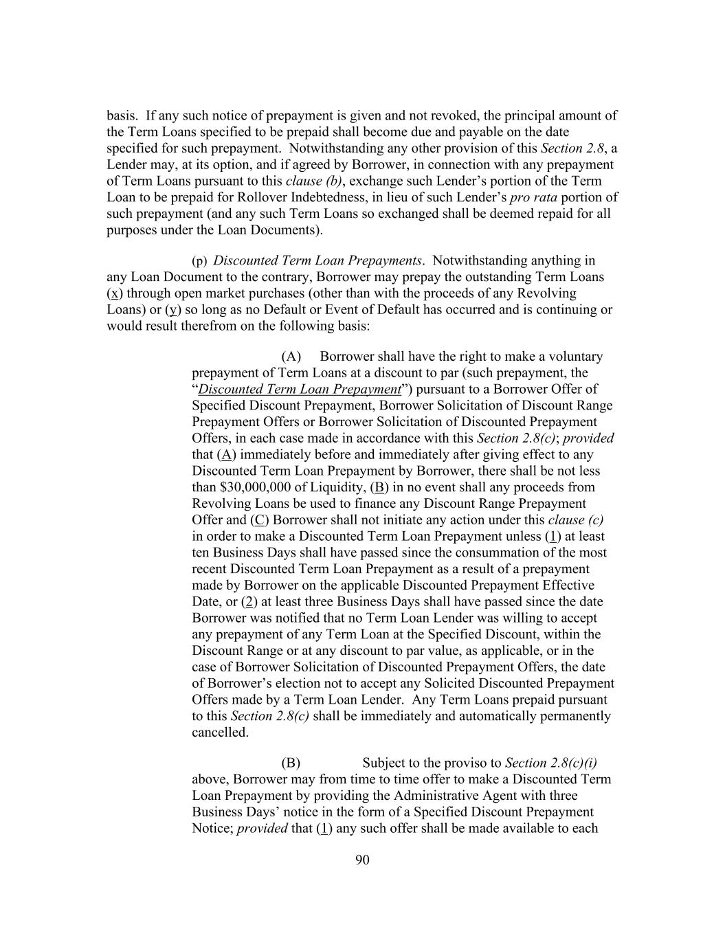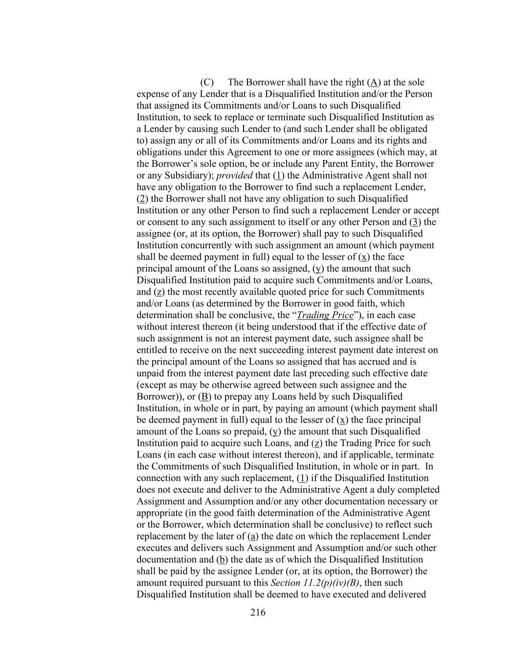 216 (C) The Borrower shall have the right (A) at the sole expense of any Lender that is a Disqualified Institution and/or the Person that assigned its Commitments and/or Loans to such Disqualified Institution, to seek to replace or terminate such Disqualified Institution as a Lender by causing such Lender to (and such Lender shall be obligated to) assign any or all of its Commitments and/or Loans and its rights and obligations under this Agreement to one or more assignees (which may, at the Borrower’s sole option, be or include any Parent Entity, the Borrower or any Subsidiary); provided that (1) the Administrative Agent shall not have any obligation to the Borrower to find such a replacement Lender, (2) the Borrower shall not have any obligation to such Disqualified Institution or any other Person to find such a replacement Lender or accept or consent to any such assignment to itself or any other Person and (3) the assignee (or, at its option, the Borrower) shall pay to such Disqualified Institution concurrently with such assignment an amount (which payment shall be deemed payment in full) equal to the lesser of (x) the face principal amount of the Loans so assigned, (y) the amount that such Disqualified Institution paid to acquire such Commitments and/or Loans, and (z) the most recently available quoted price for such Commitments and/or Loans (as determined by the Borrower in good faith, which determination shall be conclusive, the “Trading Price”), in each case without interest thereon (it being understood that if the effective date of such assignment is not an interest payment date, such assignee shall be entitled to receive on the next succeeding interest payment date interest on the principal amount of the Loans so assigned that has accrued and is unpaid from the interest payment date last preceding such effective date (except as may be otherwise agreed between such assignee and the Borrower)), or (B) to prepay any Loans held by such Disqualified Institution, in whole or in part, by paying an amount (which payment shall be deemed payment in full) equal to the lesser of (x) the face principal amount of the Loans so prepaid, (y) the amount that such Disqualified Institution paid to acquire such Loans, and (z) the Trading Price for such Loans (in each case without interest thereon), and if applicable, terminate the Commitments of such Disqualified Institution, in whole or in part. In connection with any such replacement, (1) if the Disqualified Institution does not execute and deliver to the Administrative Agent a duly completed Assignment and Assumption and/or any other documentation necessary or appropriate (in the good faith determination of the Administrative Agent or the Borrower, which determination shall be conclusive) to reflect such replacement by the later of (a) the date on which the replacement Lender executes and delivers such Assignment and Assumption and/or such other documentation and (b) the date as of which the Disqualified Institution shall be paid by the assignee Lender (or, at its option, the Borrower) the amount required pursuant to this Section 11.2(p)(iv)(B), then such Disqualified Institution shall be deemed to have executed and delivered