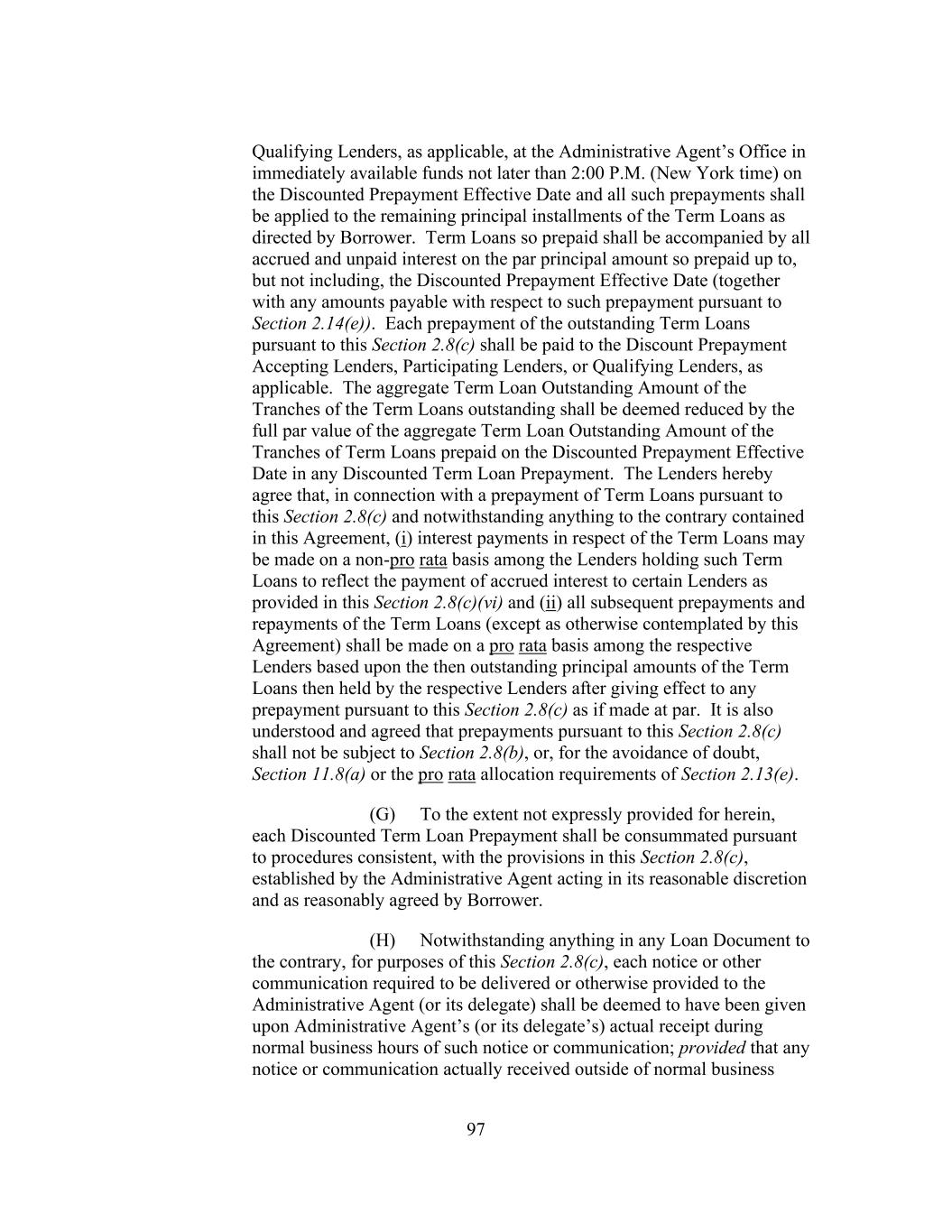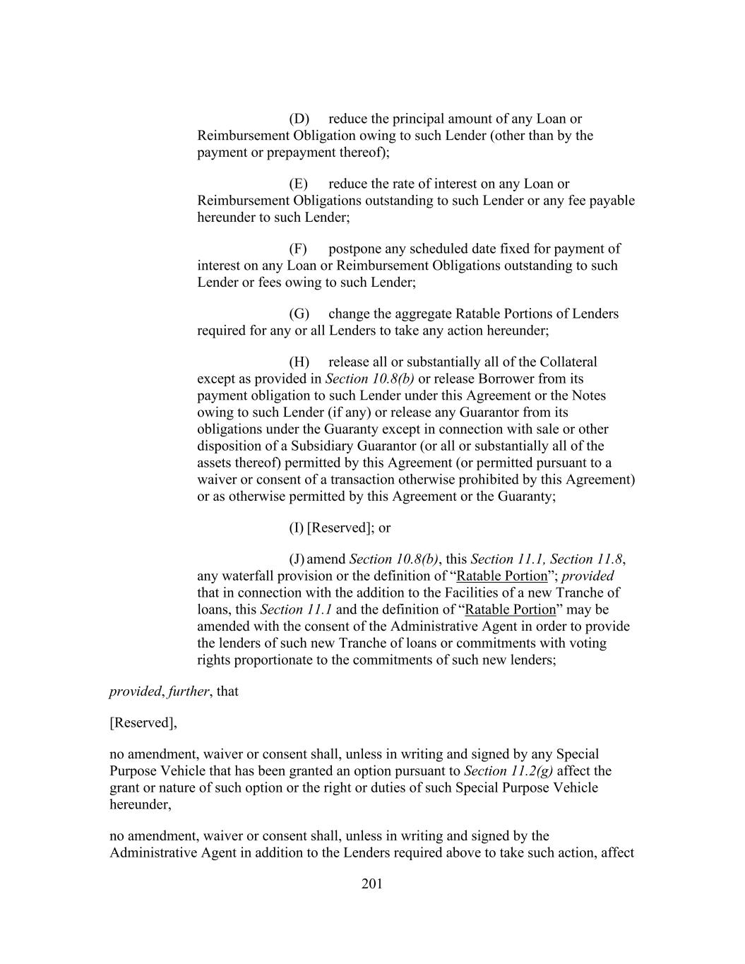 201 (D) reduce the principal amount of any Loan or Reimbursement Obligation owing to such Lender (other than by the payment or prepayment thereof); (E) reduce the rate of interest on any Loan or Reimbursement Obligations outstanding to such Lender or any fee payable hereunder to such Lender; (F) postpone any scheduled date fixed for payment of interest on any Loan or Reimbursement Obligations outstanding to such Lender or fees owing to such Lender; (G) change the aggregate Ratable Portions of Lenders required for any or all Lenders to take any action hereunder; (H) release all or substantially all of the Collateral except as provided in Section 10.8(b) or release Borrower from its payment obligation to such Lender under this Agreement or the Notes owing to such Lender (if any) or release any Guarantor from its obligations under the Guaranty except in connection with sale or other disposition of a Subsidiary Guarantor (or all or substantially all of the assets thereof) permitted by this Agreement (or permitted pursuant to a waiver or consent of a transaction otherwise prohibited by this Agreement) or as otherwise permitted by this Agreement or the Guaranty; (I) [Reserved]; or (J) amend Section 10.8(b), this Section 11.1, Section 11.8, any waterfall provision or the definition of “Ratable Portion”; provided that in connection with the addition to the Facilities of a new Tranche of loans, this Section 11.1 and the definition of “Ratable Portion” may be amended with the consent of the Administrative Agent in order to provide the lenders of such new Tranche of loans or commitments with voting rights proportionate to the commitments of such new lenders; provided, further, that [Reserved], no amendment, waiver or consent shall, unless in writing and signed by any Special Purpose Vehicle that has been granted an option pursuant to Section 11.2(g) affect the grant or nature of such option or the right or duties of such Special Purpose Vehicle hereunder, no amendment, waiver or consent shall, unless in writing and signed by the Administrative Agent in addition to the Lenders required above to take such action, affect