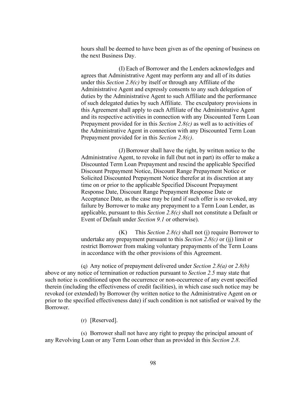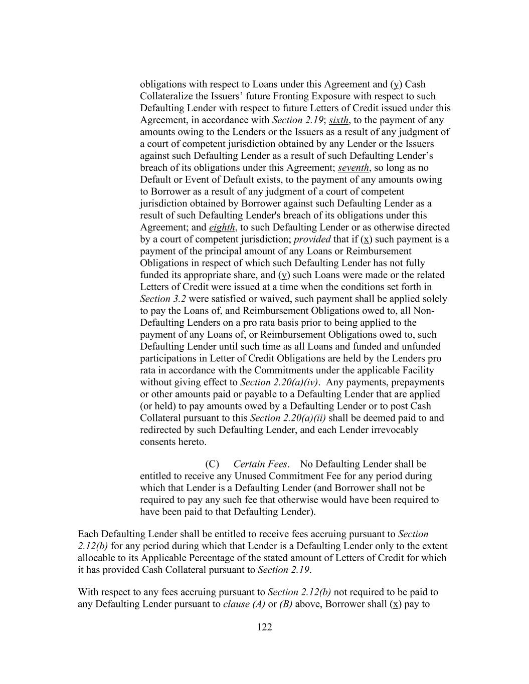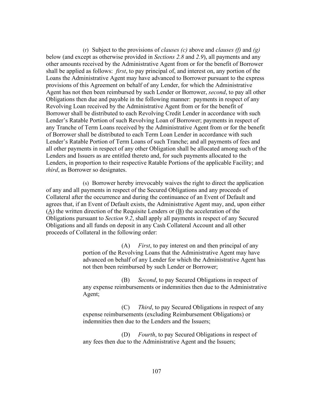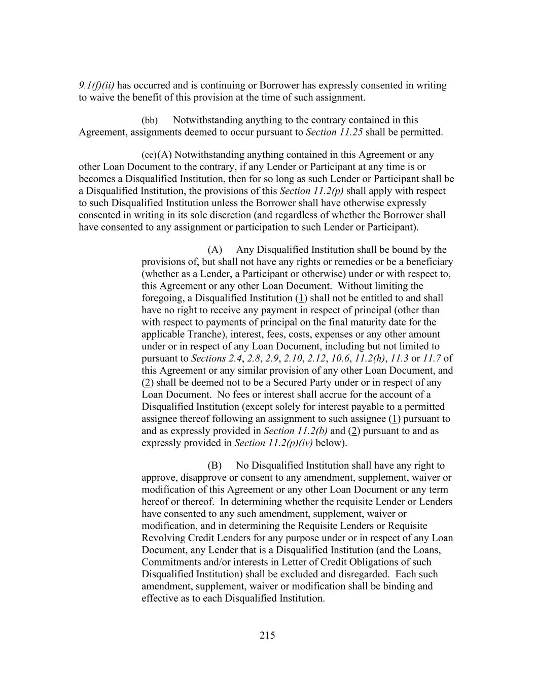 215 9.1(f)(ii) has occurred and is continuing or Borrower has expressly consented in writing to waive the benefit of this provision at the time of such assignment. (bb) Notwithstanding anything to the contrary contained in this Agreement, assignments deemed to occur pursuant to Section 11.25 shall be permitted. (cc) (A) Notwithstanding anything contained in this Agreement or any other Loan Document to the contrary, if any Lender or Participant at any time is or becomes a Disqualified Institution, then for so long as such Lender or Participant shall be a Disqualified Institution, the provisions of this Section 11.2(p) shall apply with respect to such Disqualified Institution unless the Borrower shall have otherwise expressly consented in writing in its sole discretion (and regardless of whether the Borrower shall have consented to any assignment or participation to such Lender or Participant). (A) Any Disqualified Institution shall be bound by the provisions of, but shall not have any rights or remedies or be a beneficiary (whether as a Lender, a Participant or otherwise) under or with respect to, this Agreement or any other Loan Document. Without limiting the foregoing, a Disqualified Institution (1) shall not be entitled to and shall have no right to receive any payment in respect of principal (other than with respect to payments of principal on the final maturity date for the applicable Tranche), interest, fees, costs, expenses or any other amount under or in respect of any Loan Document, including but not limited to pursuant to Sections 2.4, 2.8, 2.9, 2.10, 2.12, 10.6, 11.2(h), 11.3 or 11.7 of this Agreement or any similar provision of any other Loan Document, and (2) shall be deemed not to be a Secured Party under or in respect of any Loan Document. No fees or interest shall accrue for the account of a Disqualified Institution (except solely for interest payable to a permitted assignee thereof following an assignment to such assignee (1) pursuant to and as expressly provided in Section 11.2(b) and (2) pursuant to and as expressly provided in Section 11.2(p)(iv) below). (B) No Disqualified Institution shall have any right to approve, disapprove or consent to any amendment, supplement, waiver or modification of this Agreement or any other Loan Document or any term hereof or thereof. In determining whether the requisite Lender or Lenders have consented to any such amendment, supplement, waiver or modification, and in determining the Requisite Lenders or Requisite Revolving Credit Lenders for any purpose under or in respect of any Loan Document, any Lender that is a Disqualified Institution (and the Loans, Commitments and/or interests in Letter of Credit Obligations of such Disqualified Institution) shall be excluded and disregarded. Each such amendment, supplement, waiver or modification shall be binding and effective as to each Disqualified Institution.