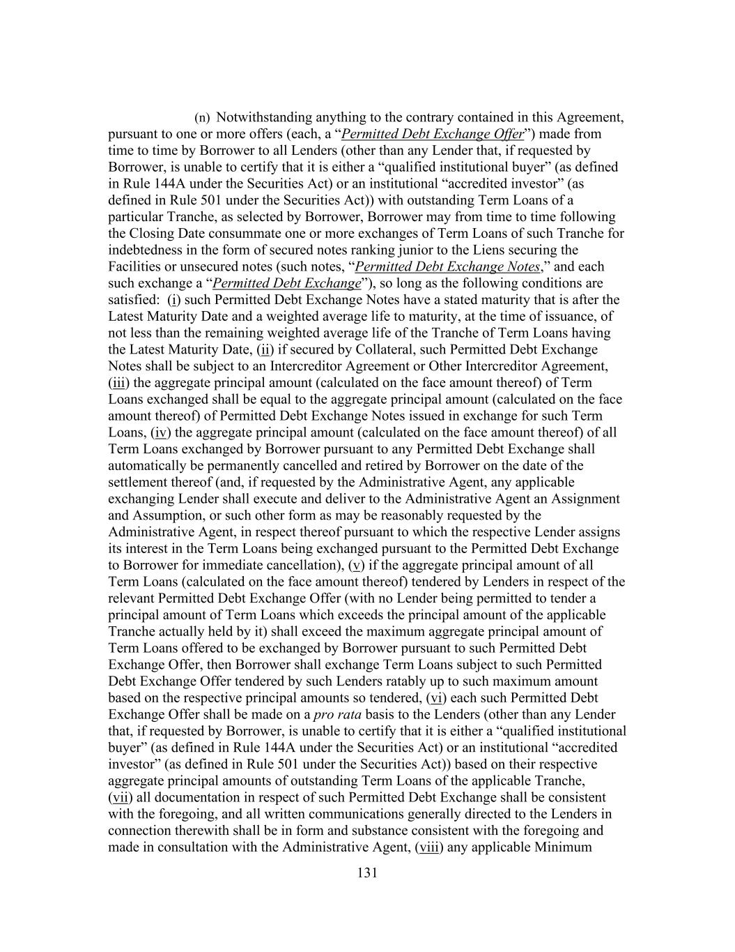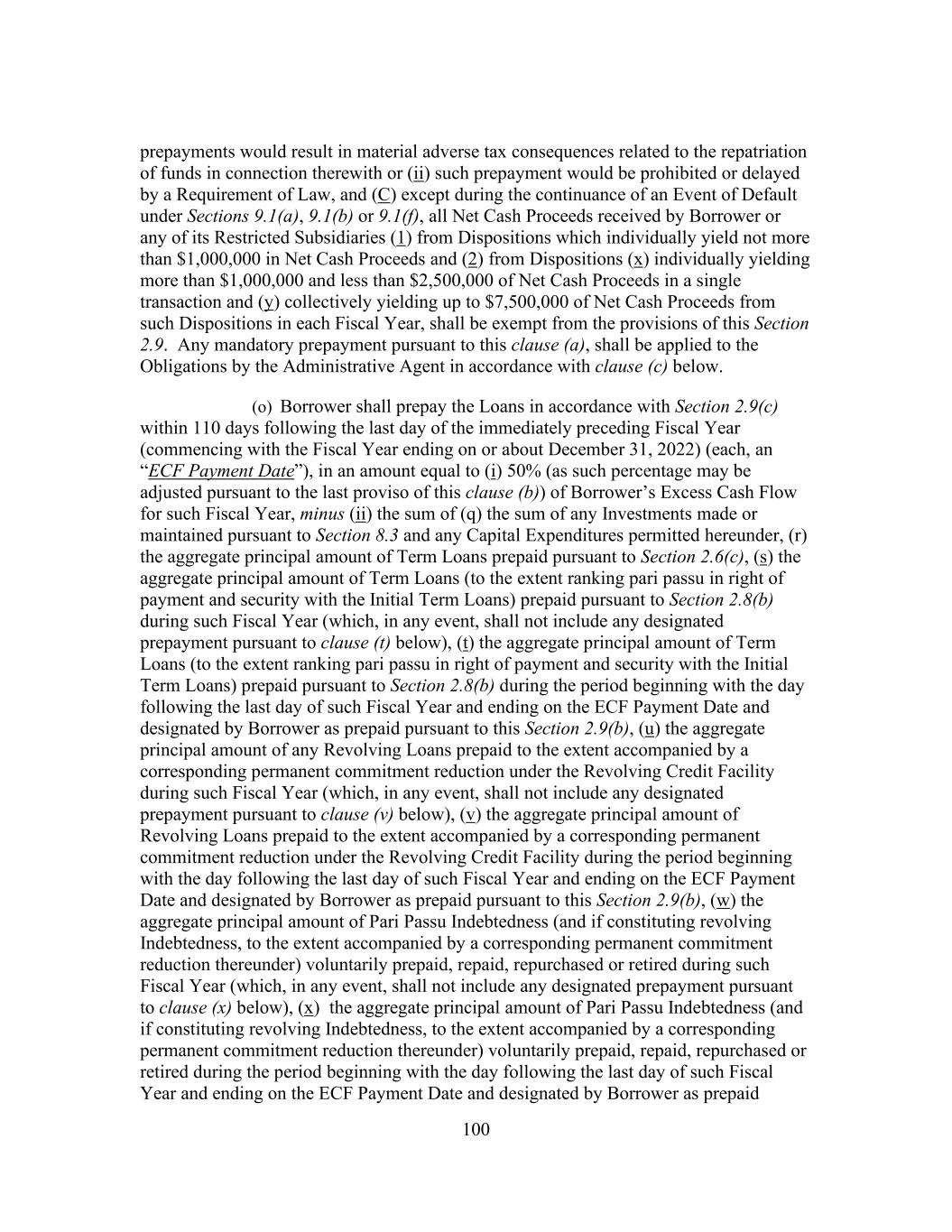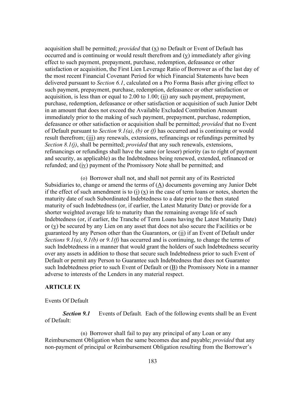 183 acquisition shall be permitted; provided that (x) no Default or Event of Default has occurred and is continuing or would result therefrom and (y) immediately after giving effect to such payment, prepayment, purchase, redemption, defeasance or other satisfaction or acquisition, the First Lien Leverage Ratio of Borrower as of the last day of the most recent Financial Covenant Period for which Financial Statements have been delivered pursuant to Section 6.1, calculated on a Pro Forma Basis after giving effect to such payment, prepayment, purchase, redemption, defeasance or other satisfaction or acquisition, is less than or equal to 2.00 to 1.00; (ii) any such payment, prepayment, purchase, redemption, defeasance or other satisfaction or acquisition of such Junior Debt in an amount that does not exceed the Available Excluded Contribution Amount immediately prior to the making of such payment, prepayment, purchase, redemption, defeasance or other satisfaction or acquisition shall be permitted; provided that no Event of Default pursuant to Section 9.1(a), (b) or (f) has occurred and is continuing or would result therefrom; (iii) any renewals, extensions, refinancings or refundings permitted by Section 8.1(j), shall be permitted; provided that any such renewals, extensions, refinancings or refundings shall have the same (or lesser) priority (as to right of payment and security, as applicable) as the Indebtedness being renewed, extended, refinanced or refunded; and (iv) payment of the Promissory Note shall be permitted; and (o) Borrower shall not, and shall not permit any of its Restricted Subsidiaries to, change or amend the terms of (A) documents governing any Junior Debt if the effect of such amendment is to (i) (x) in the case of term loans or notes, shorten the maturity date of such Subordinated Indebtedness to a date prior to the then stated maturity of such Indebtedness (or, if earlier, the Latest Maturity Date) or provide for a shorter weighted average life to maturity than the remaining average life of such Indebtedness (or, if earlier, the Tranche of Term Loans having the Latest Maturity Date) or (y) be secured by any Lien on any asset that does not also secure the Facilities or be guaranteed by any Person other than the Guarantors, or (ii) if an Event of Default under Sections 9.1(a), 9.1(b) or 9.1(f) has occurred and is continuing, to change the terms of such Indebtedness in a manner that would grant the holders of such Indebtedness security over any assets in addition to those that secure such Indebtedness prior to such Event of Default or permit any Person to Guarantee such Indebtedness that does not Guarantee such Indebtedness prior to such Event of Default or (B) the Promissory Note in a manner adverse to interests of the Lenders in any material respect. ARTICLE IX Events Of Default Section 9.1 Events of Default. Each of the following events shall be an Event of Default: (n) Borrower shall fail to pay any principal of any Loan or any Reimbursement Obligation when the same becomes due and payable; provided that any non-payment of principal or Reimbursement Obligation resulting from the Borrower’s