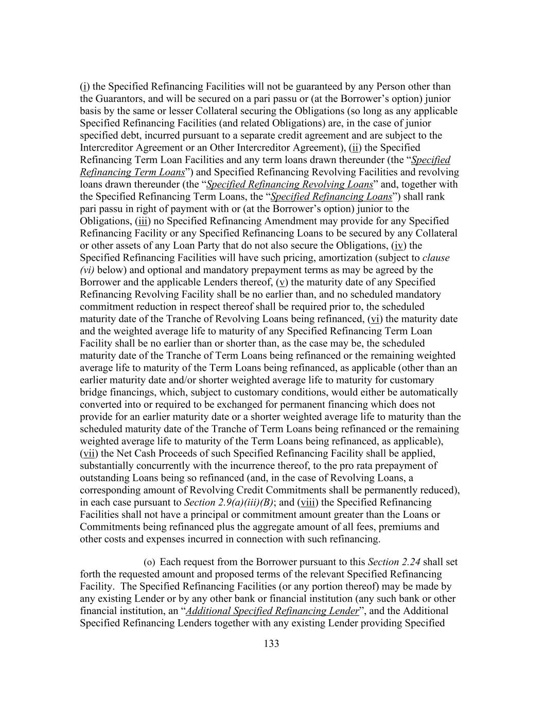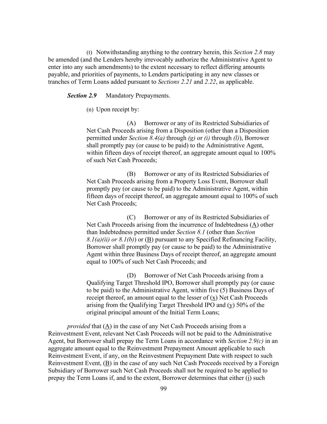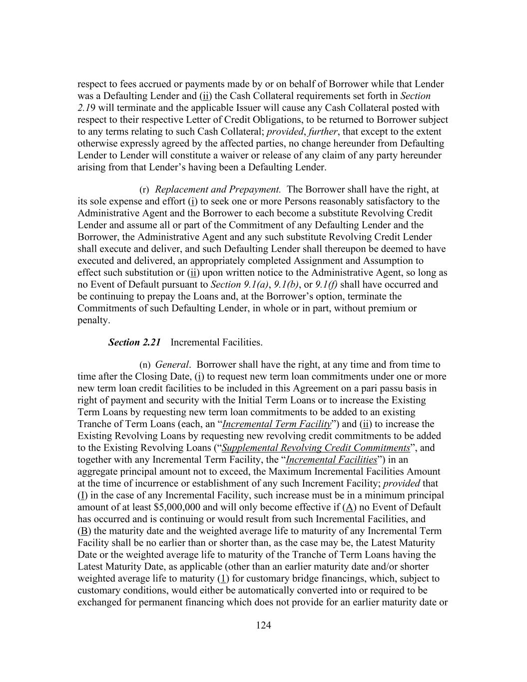 183 acquisition shall be permitted; provided that (x) no Default or Event of Default has occurred and is continuing or would result therefrom and (y) immediately after giving effect to such payment, prepayment, purchase, redemption, defeasance or other satisfaction or acquisition, the First Lien Leverage Ratio of Borrower as of the last day of the most recent Financial Covenant Period for which Financial Statements have been delivered pursuant to Section 6.1, calculated on a Pro Forma Basis after giving effect to such payment, prepayment, purchase, redemption, defeasance or other satisfaction or acquisition, is less than or equal to 2.00 to 1.00; (ii) any such payment, prepayment, purchase, redemption, defeasance or other satisfaction or acquisition of such Junior Debt in an amount that does not exceed the Available Excluded Contribution Amount immediately prior to the making of such payment, prepayment, purchase, redemption, defeasance or other satisfaction or acquisition shall be permitted; provided that no Event of Default pursuant to Section 9.1(a), (b) or (f) has occurred and is continuing or would result therefrom; (iii) any renewals, extensions, refinancings or refundings permitted by Section 8.1(j), shall be permitted; provided that any such renewals, extensions, refinancings or refundings shall have the same (or lesser) priority (as to right of payment and security, as applicable) as the Indebtedness being renewed, extended, refinanced or refunded; and (iv) payment of the Promissory Note shall be permitted; and (o) Borrower shall not, and shall not permit any of its Restricted Subsidiaries to, change or amend the terms of (A) documents governing any Junior Debt if the effect of such amendment is to (i) (x) in the case of term loans or notes, shorten the maturity date of such Subordinated Indebtedness to a date prior to the then stated maturity of such Indebtedness (or, if earlier, the Latest Maturity Date) or provide for a shorter weighted average life to maturity than the remaining average life of such Indebtedness (or, if earlier, the Tranche of Term Loans having the Latest Maturity Date) or (y) be secured by any Lien on any asset that does not also secure the Facilities or be guaranteed by any Person other than the Guarantors, or (ii) if an Event of Default under Sections 9.1(a), 9.1(b) or 9.1(f) has occurred and is continuing, to change the terms of such Indebtedness in a manner that would grant the holders of such Indebtedness security over any assets in addition to those that secure such Indebtedness prior to such Event of Default or permit any Person to Guarantee such Indebtedness that does not Guarantee such Indebtedness prior to such Event of Default or (B) the Promissory Note in a manner adverse to interests of the Lenders in any material respect. ARTICLE IX Events Of Default Section 9.1 Events of Default. Each of the following events shall be an Event of Default: (n) Borrower shall fail to pay any principal of any Loan or any Reimbursement Obligation when the same becomes due and payable; provided that any non-payment of principal or Reimbursement Obligation resulting from the Borrower’s