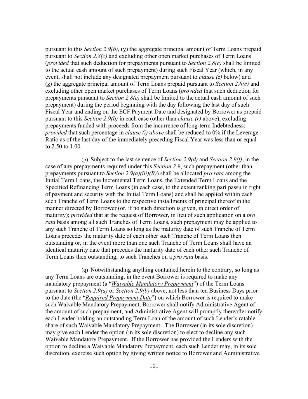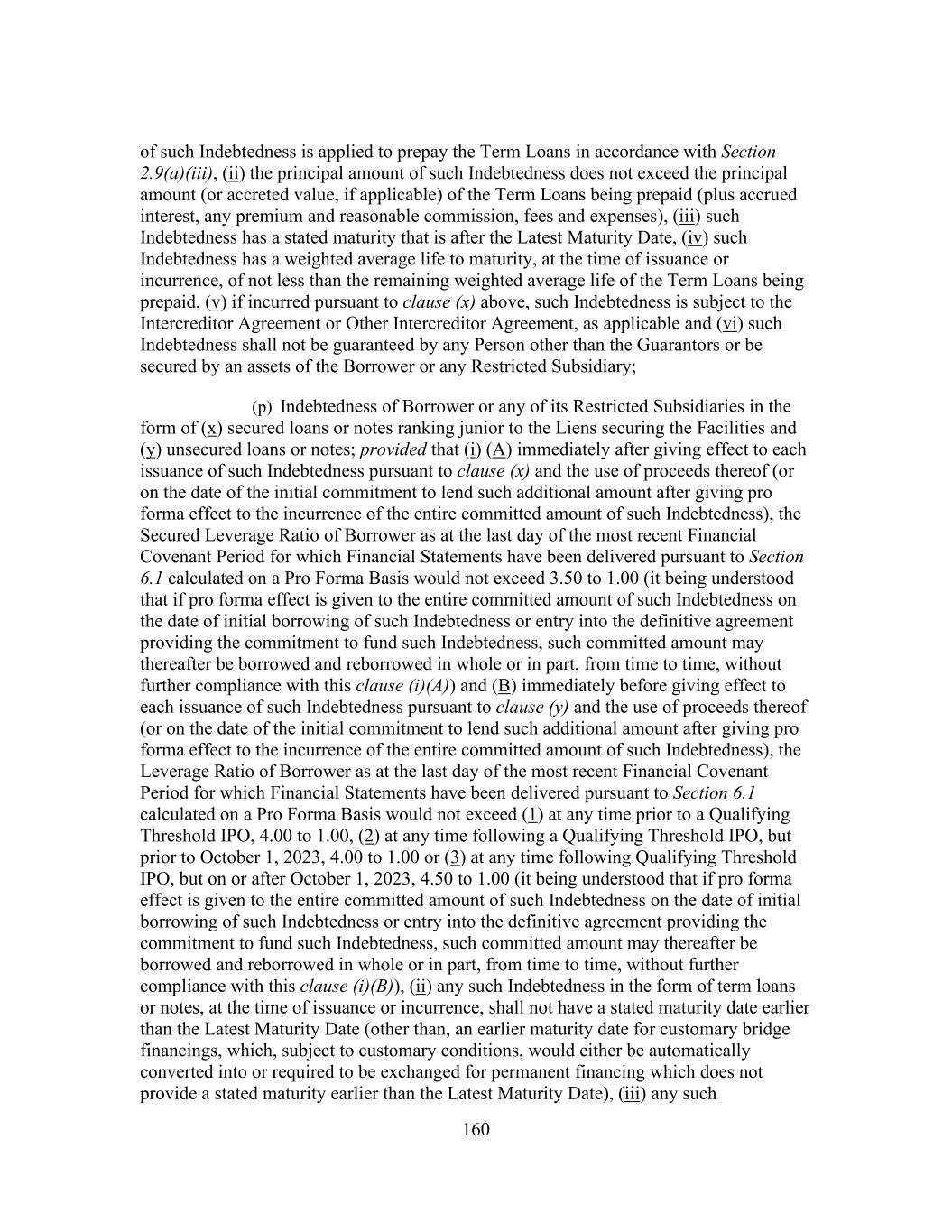 160 of such Indebtedness is applied to prepay the Term Loans in accordance with Section 2.9(a)(iii), (ii) the principal amount of such Indebtedness does not exceed the principal amount (or accreted value, if applicable) of the Term Loans being prepaid (plus accrued interest, any premium and reasonable commission, fees and expenses), (iii) such Indebtedness has a stated maturity that is after the Latest Maturity Date, (iv) such Indebtedness has a weighted average life to maturity, at the time of issuance or incurrence, of not less than the remaining weighted average life of the Term Loans being prepaid, (v) if incurred pursuant to clause (x) above, such Indebtedness is subject to the Intercreditor Agreement or Other Intercreditor Agreement, as applicable and (vi) such Indebtedness shall not be guaranteed by any Person other than the Guarantors or be secured by an assets of the Borrower or any Restricted Subsidiary; (p) Indebtedness of Borrower or any of its Restricted Subsidiaries in the form of (x) secured loans or notes ranking junior to the Liens securing the Facilities and (y) unsecured loans or notes; provided that (i) (A) immediately after giving effect to each issuance of such Indebtedness pursuant to clause (x) and the use of proceeds thereof (or on the date of the initial commitment to lend such additional amount after giving pro forma effect to the incurrence of the entire committed amount of such Indebtedness), the Secured Leverage Ratio of Borrower as at the last day of the most recent Financial Covenant Period for which Financial Statements have been delivered pursuant to Section 6.1 calculated on a Pro Forma Basis would not exceed 3.50 to 1.00 (it being understood that if pro forma effect is given to the entire committed amount of such Indebtedness on the date of initial borrowing of such Indebtedness or entry into the definitive agreement providing the commitment to fund such Indebtedness, such committed amount may thereafter be borrowed and reborrowed in whole or in part, from time to time, without further compliance with this clause (i)(A)) and (B) immediately before giving effect to each issuance of such Indebtedness pursuant to clause (y) and the use of proceeds thereof (or on the date of the initial commitment to lend such additional amount after giving pro forma effect to the incurrence of the entire committed amount of such Indebtedness), the Leverage Ratio of Borrower as at the last day of the most recent Financial Covenant Period for which Financial Statements have been delivered pursuant to Section 6.1 calculated on a Pro Forma Basis would not exceed (1) at any time prior to a Qualifying Threshold IPO, 4.00 to 1.00, (2) at any time following a Qualifying Threshold IPO, but prior to October 1, 2023, 4.00 to 1.00 or (3) at any time following Qualifying Threshold IPO, but on or after October 1, 2023, 4.50 to 1.00 (it being understood that if pro forma effect is given to the entire committed amount of such Indebtedness on the date of initial borrowing of such Indebtedness or entry into the definitive agreement providing the commitment to fund such Indebtedness, such committed amount may thereafter be borrowed and reborrowed in whole or in part, from time to time, without further compliance with this clause (i)(B)), (ii) any such Indebtedness in the form of term loans or notes, at the time of issuance or incurrence, shall not have a stated maturity date earlier than the Latest Maturity Date (other than, an earlier maturity date for customary bridge financings, which, subject to customary conditions, would either be automatically converted into or required to be exchanged for permanent financing which does not provide a stated maturity earlier than the Latest Maturity Date), (iii) any such