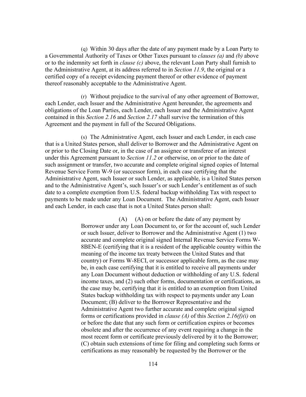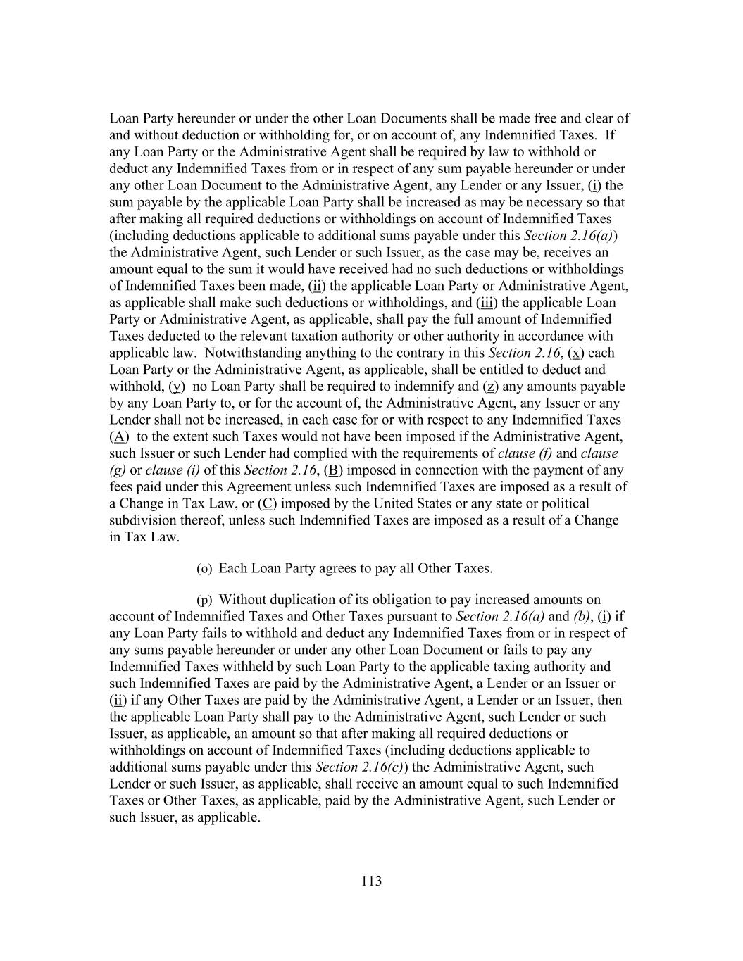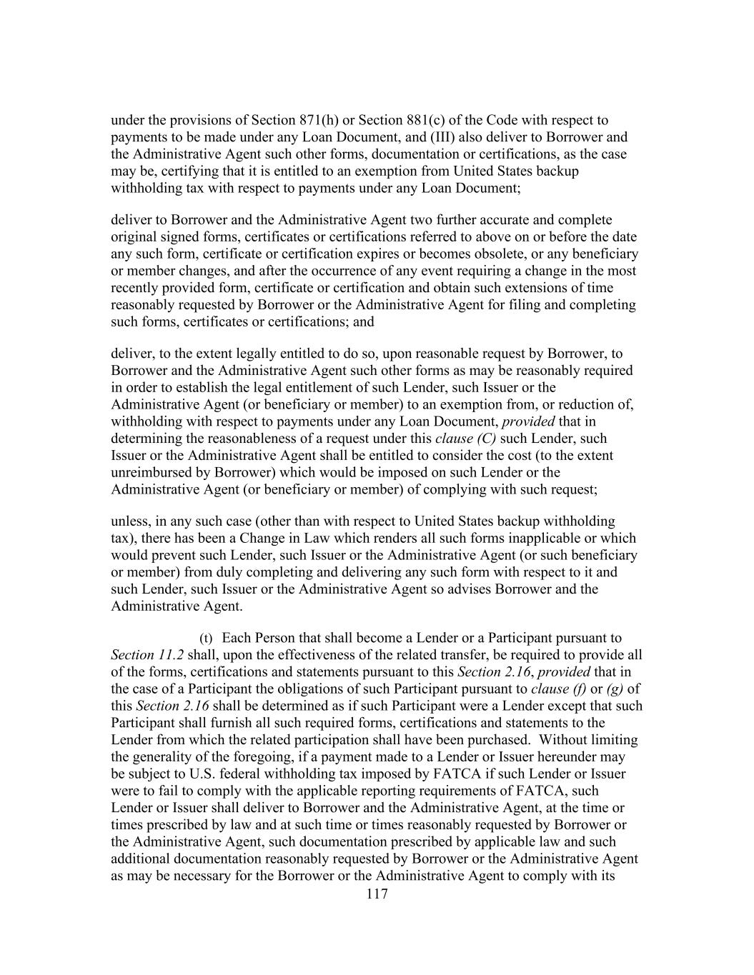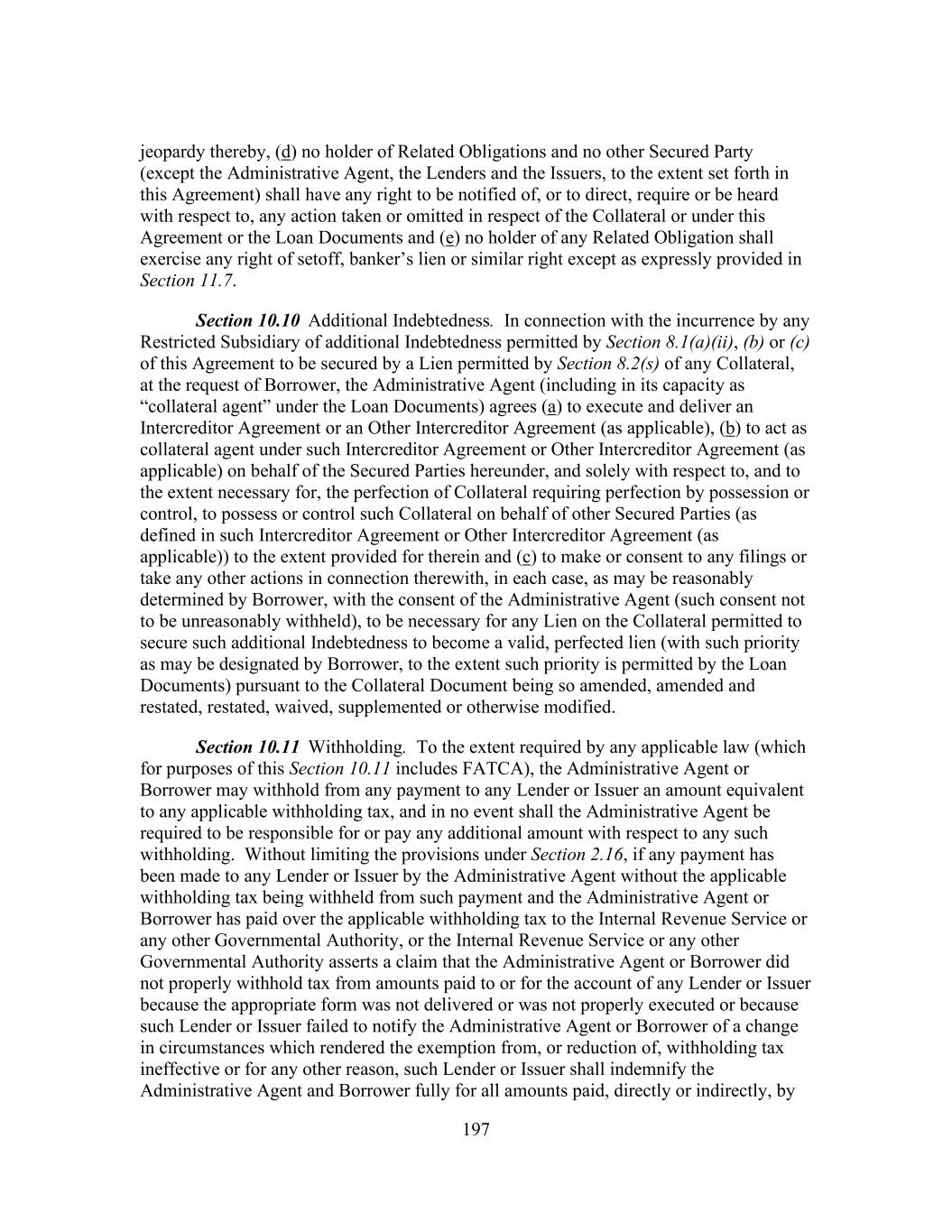 197 jeopardy thereby, (d) no holder of Related Obligations and no other Secured Party (except the Administrative Agent, the Lenders and the Issuers, to the extent set forth in this Agreement) shall have any right to be notified of, or to direct, require or be heard with respect to, any action taken or omitted in respect of the Collateral or under this Agreement or the Loan Documents and (e) no holder of any Related Obligation shall exercise any right of setoff, banker’s lien or similar right except as expressly provided in Section 11.7. Section 10.10 Additional Indebtedness. In connection with the incurrence by any Restricted Subsidiary of additional Indebtedness permitted by Section 8.1(a)(ii), (b) or (c) of this Agreement to be secured by a Lien permitted by Section 8.2(s) of any Collateral, at the request of Borrower, the Administrative Agent (including in its capacity as “collateral agent” under the Loan Documents) agrees (a) to execute and deliver an Intercreditor Agreement or an Other Intercreditor Agreement (as applicable), (b) to act as collateral agent under such Intercreditor Agreement or Other Intercreditor Agreement (as applicable) on behalf of the Secured Parties hereunder, and solely with respect to, and to the extent necessary for, the perfection of Collateral requiring perfection by possession or control, to possess or control such Collateral on behalf of other Secured Parties (as defined in such Intercreditor Agreement or Other Intercreditor Agreement (as applicable)) to the extent provided for therein and (c) to make or consent to any filings or take any other actions in connection therewith, in each case, as may be reasonably determined by Borrower, with the consent of the Administrative Agent (such consent not to be unreasonably withheld), to be necessary for any Lien on the Collateral permitted to secure such additional Indebtedness to become a valid, perfected lien (with such priority as may be designated by Borrower, to the extent such priority is permitted by the Loan Documents) pursuant to the Collateral Document being so amended, amended and restated, restated, waived, supplemented or otherwise modified. Section 10.11 Withholding. To the extent required by any applicable law (which for purposes of this Section 10.11 includes FATCA), the Administrative Agent or Borrower may withhold from any payment to any Lender or Issuer an amount equivalent to any applicable withholding tax, and in no event shall the Administrative Agent be required to be responsible for or pay any additional amount with respect to any such withholding. Without limiting the provisions under Section 2.16, if any payment has been made to any Lender or Issuer by the Administrative Agent without the applicable withholding tax being withheld from such payment and the Administrative Agent or Borrower has paid over the applicable withholding tax to the Internal Revenue Service or any other Governmental Authority, or the Internal Revenue Service or any other Governmental Authority asserts a claim that the Administrative Agent or Borrower did not properly withhold tax from amounts paid to or for the account of any Lender or Issuer because the appropriate form was not delivered or was not properly executed or because such Lender or Issuer failed to notify the Administrative Agent or Borrower of a change in circumstances which rendered the exemption from, or reduction of, withholding tax ineffective or for any other reason, such Lender or Issuer shall indemnify the Administrative Agent and Borrower fully for all amounts paid, directly or indirectly, by