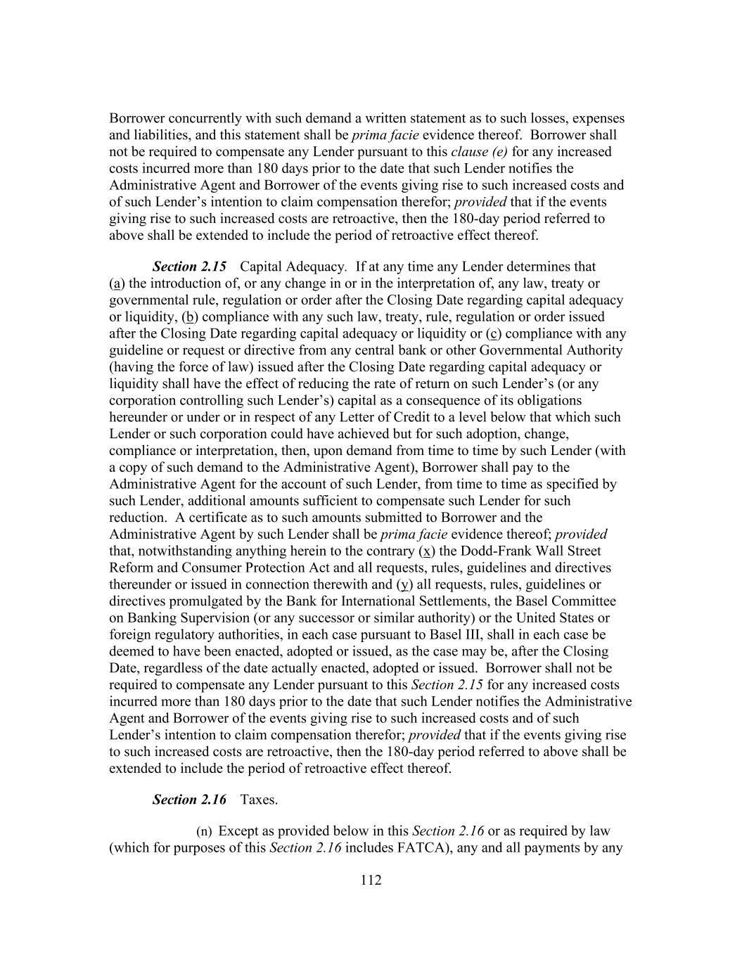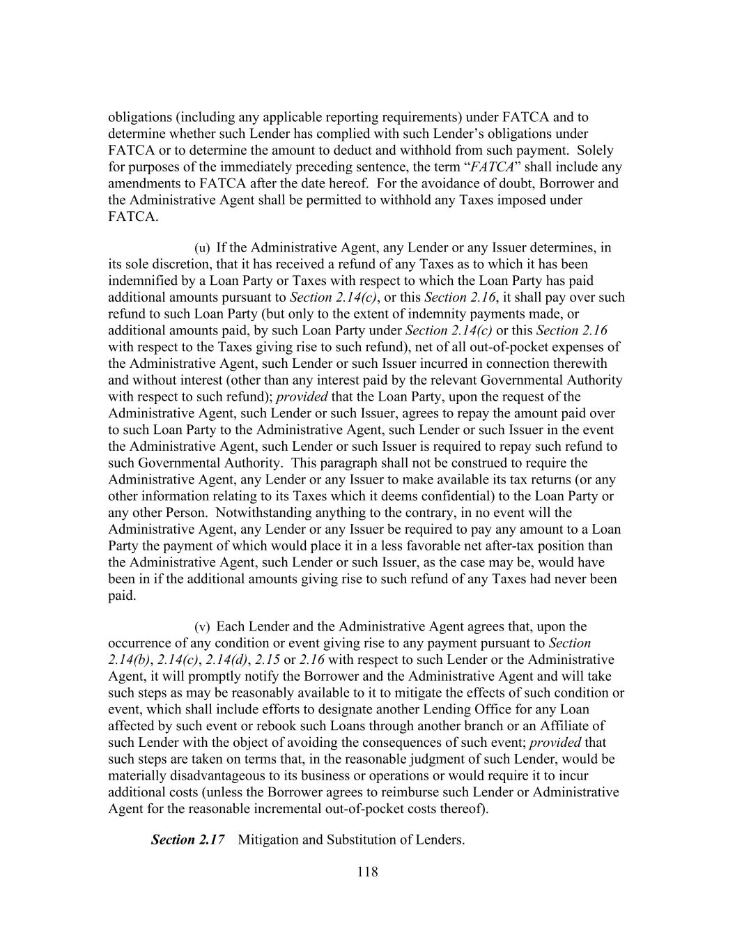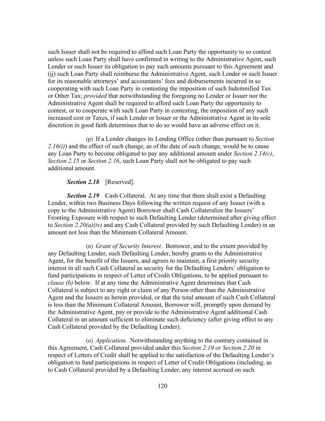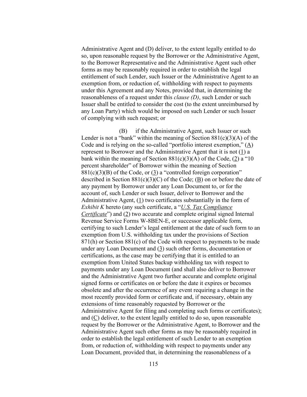 197 jeopardy thereby, (d) no holder of Related Obligations and no other Secured Party (except the Administrative Agent, the Lenders and the Issuers, to the extent set forth in this Agreement) shall have any right to be notified of, or to direct, require or be heard with respect to, any action taken or omitted in respect of the Collateral or under this Agreement or the Loan Documents and (e) no holder of any Related Obligation shall exercise any right of setoff, banker’s lien or similar right except as expressly provided in Section 11.7. Section 10.10 Additional Indebtedness. In connection with the incurrence by any Restricted Subsidiary of additional Indebtedness permitted by Section 8.1(a)(ii), (b) or (c) of this Agreement to be secured by a Lien permitted by Section 8.2(s) of any Collateral, at the request of Borrower, the Administrative Agent (including in its capacity as “collateral agent” under the Loan Documents) agrees (a) to execute and deliver an Intercreditor Agreement or an Other Intercreditor Agreement (as applicable), (b) to act as collateral agent under such Intercreditor Agreement or Other Intercreditor Agreement (as applicable) on behalf of the Secured Parties hereunder, and solely with respect to, and to the extent necessary for, the perfection of Collateral requiring perfection by possession or control, to possess or control such Collateral on behalf of other Secured Parties (as defined in such Intercreditor Agreement or Other Intercreditor Agreement (as applicable)) to the extent provided for therein and (c) to make or consent to any filings or take any other actions in connection therewith, in each case, as may be reasonably determined by Borrower, with the consent of the Administrative Agent (such consent not to be unreasonably withheld), to be necessary for any Lien on the Collateral permitted to secure such additional Indebtedness to become a valid, perfected lien (with such priority as may be designated by Borrower, to the extent such priority is permitted by the Loan Documents) pursuant to the Collateral Document being so amended, amended and restated, restated, waived, supplemented or otherwise modified. Section 10.11 Withholding. To the extent required by any applicable law (which for purposes of this Section 10.11 includes FATCA), the Administrative Agent or Borrower may withhold from any payment to any Lender or Issuer an amount equivalent to any applicable withholding tax, and in no event shall the Administrative Agent be required to be responsible for or pay any additional amount with respect to any such withholding. Without limiting the provisions under Section 2.16, if any payment has been made to any Lender or Issuer by the Administrative Agent without the applicable withholding tax being withheld from such payment and the Administrative Agent or Borrower has paid over the applicable withholding tax to the Internal Revenue Service or any other Governmental Authority, or the Internal Revenue Service or any other Governmental Authority asserts a claim that the Administrative Agent or Borrower did not properly withhold tax from amounts paid to or for the account of any Lender or Issuer because the appropriate form was not delivered or was not properly executed or because such Lender or Issuer failed to notify the Administrative Agent or Borrower of a change in circumstances which rendered the exemption from, or reduction of, withholding tax ineffective or for any other reason, such Lender or Issuer shall indemnify the Administrative Agent and Borrower fully for all amounts paid, directly or indirectly, by