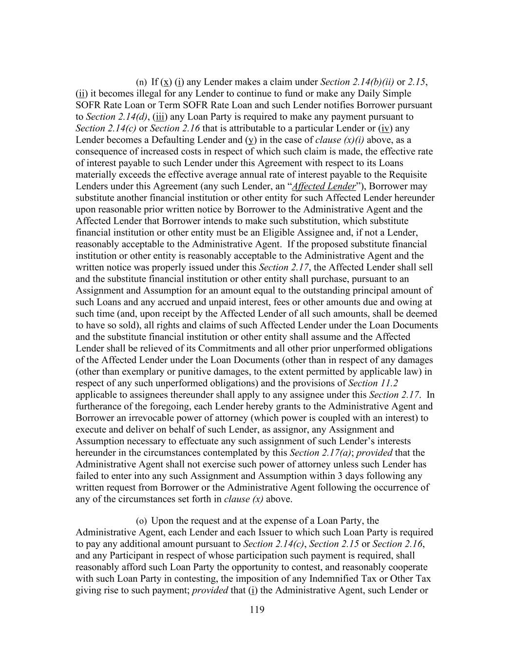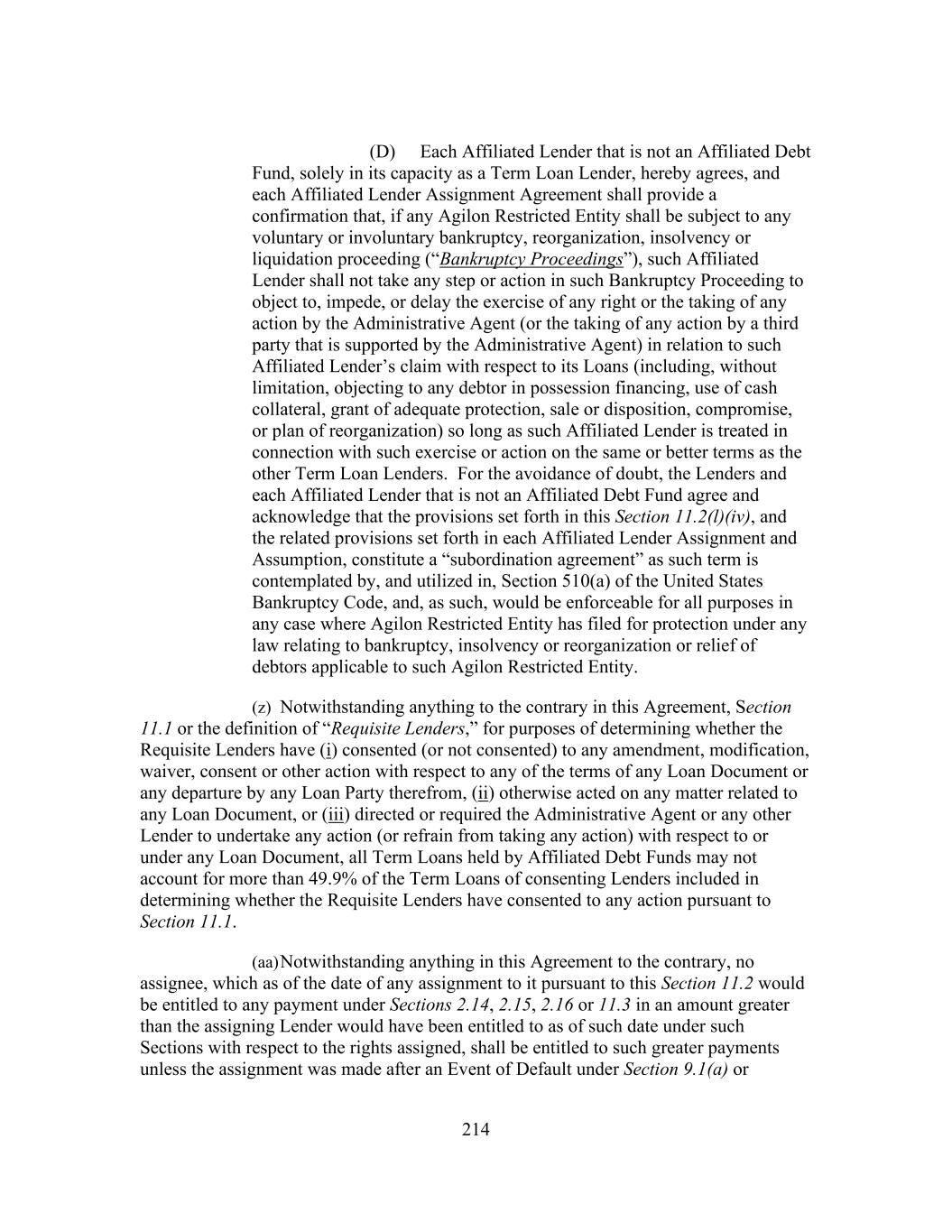 214 (D) Each Affiliated Lender that is not an Affiliated Debt Fund, solely in its capacity as a Term Loan Lender, hereby agrees, and each Affiliated Lender Assignment Agreement shall provide a confirmation that, if any Agilon Restricted Entity shall be subject to any voluntary or involuntary bankruptcy, reorganization, insolvency or liquidation proceeding (“Bankruptcy Proceedings”), such Affiliated Lender shall not take any step or action in such Bankruptcy Proceeding to object to, impede, or delay the exercise of any right or the taking of any action by the Administrative Agent (or the taking of any action by a third party that is supported by the Administrative Agent) in relation to such Affiliated Lender’s claim with respect to its Loans (including, without limitation, objecting to any debtor in possession financing, use of cash collateral, grant of adequate protection, sale or disposition, compromise, or plan of reorganization) so long as such Affiliated Lender is treated in connection with such exercise or action on the same or better terms as the other Term Loan Lenders. For the avoidance of doubt, the Lenders and each Affiliated Lender that is not an Affiliated Debt Fund agree and acknowledge that the provisions set forth in this Section 11.2(l)(iv), and the related provisions set forth in each Affiliated Lender Assignment and Assumption, constitute a “subordination agreement” as such term is contemplated by, and utilized in, Section 510(a) of the United States Bankruptcy Code, and, as such, would be enforceable for all purposes in any case where Agilon Restricted Entity has filed for protection under any law relating to bankruptcy, insolvency or reorganization or relief of debtors applicable to such Agilon Restricted Entity. (z) Notwithstanding anything to the contrary in this Agreement, Section 11.1 or the definition of “Requisite Lenders,” for purposes of determining whether the Requisite Lenders have (i) consented (or not consented) to any amendment, modification, waiver, consent or other action with respect to any of the terms of any Loan Document or any departure by any Loan Party therefrom, (ii) otherwise acted on any matter related to any Loan Document, or (iii) directed or required the Administrative Agent or any other Lender to undertake any action (or refrain from taking any action) with respect to or under any Loan Document, all Term Loans held by Affiliated Debt Funds may not account for more than 49.9% of the Term Loans of consenting Lenders included in determining whether the Requisite Lenders have consented to any action pursuant to Section 11.1. (aa) Notwithstanding anything in this Agreement to the contrary, no assignee, which as of the date of any assignment to it pursuant to this Section 11.2 would be entitled to any payment under Sections 2.14, 2.15, 2.16 or 11.3 in an amount greater than the assigning Lender would have been entitled to as of such date under such Sections with respect to the rights assigned, shall be entitled to such greater payments unless the assignment was made after an Event of Default under Section 9.1(a) or