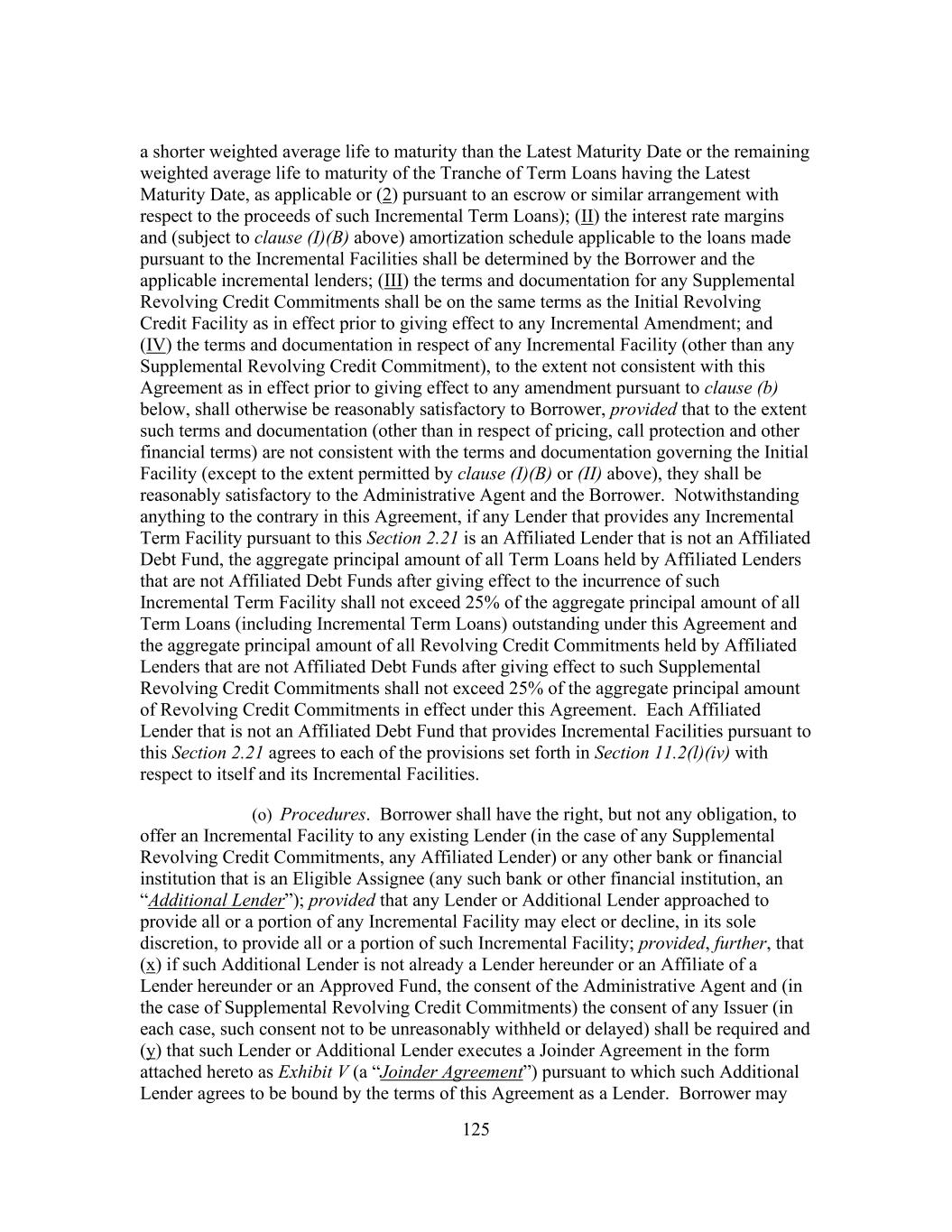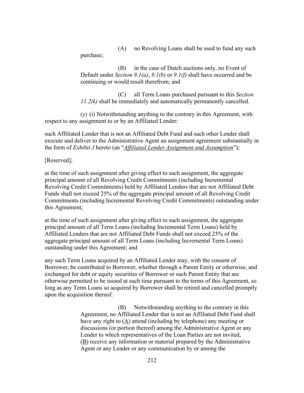 212 (A) no Revolving Loans shall be used to fund any such purchase; (B) in the case of Dutch auctions only, no Event of Default under Section 9.1(a), 9.1(b) or 9.1(f) shall have occurred and be continuing or would result therefrom; and (C) all Term Loans purchased pursuant to this Section 11.2(k) shall be immediately and automatically permanently cancelled. (y) (i) Notwithstanding anything to the contrary in this Agreement, with respect to any assignment to or by an Affiliated Lender: such Affiliated Lender that is not an Affiliated Debt Fund and such other Lender shall execute and deliver to the Administrative Agent an assignment agreement substantially in the form of Exhibit J hereto (an “Affiliated Lender Assignment and Assumption”); [Reserved]; at the time of such assignment after giving effect to such assignment, the aggregate principal amount of all Revolving Credit Commitments (including Incremental Revolving Credit Commitments) held by Affiliated Lenders that are not Affiliated Debt Funds shall not exceed 25% of the aggregate principal amount of all Revolving Credit Commitments (including Incremental Revolving Credit Commitments) outstanding under this Agreement; at the time of such assignment after giving effect to such assignment, the aggregate principal amount of all Term Loans (including Incremental Term Loans) held by Affiliated Lenders that are not Affiliated Debt Funds shall not exceed 25% of the aggregate principal amount of all Term Loans (including Incremental Term Loans) outstanding under this Agreement; and any such Term Loans acquired by an Affiliated Lender may, with the consent of Borrower, be contributed to Borrower, whether through a Parent Entity or otherwise, and exchanged for debt or equity securities of Borrower or such Parent Entity that are otherwise permitted to be issued at such time pursuant to the terms of this Agreement, so long as any Term Loans so acquired by Borrower shall be retired and cancelled promptly upon the acquisition thereof. (B) Notwithstanding anything to the contrary in this Agreement, no Affiliated Lender that is not an Affiliated Debt Fund shall have any right to (A) attend (including by telephone) any meeting or discussions (or portion thereof) among the Administrative Agent or any Lender to which representatives of the Loan Parties are not invited, (B) receive any information or material prepared by the Administrative Agent or any Lender or any communication by or among the