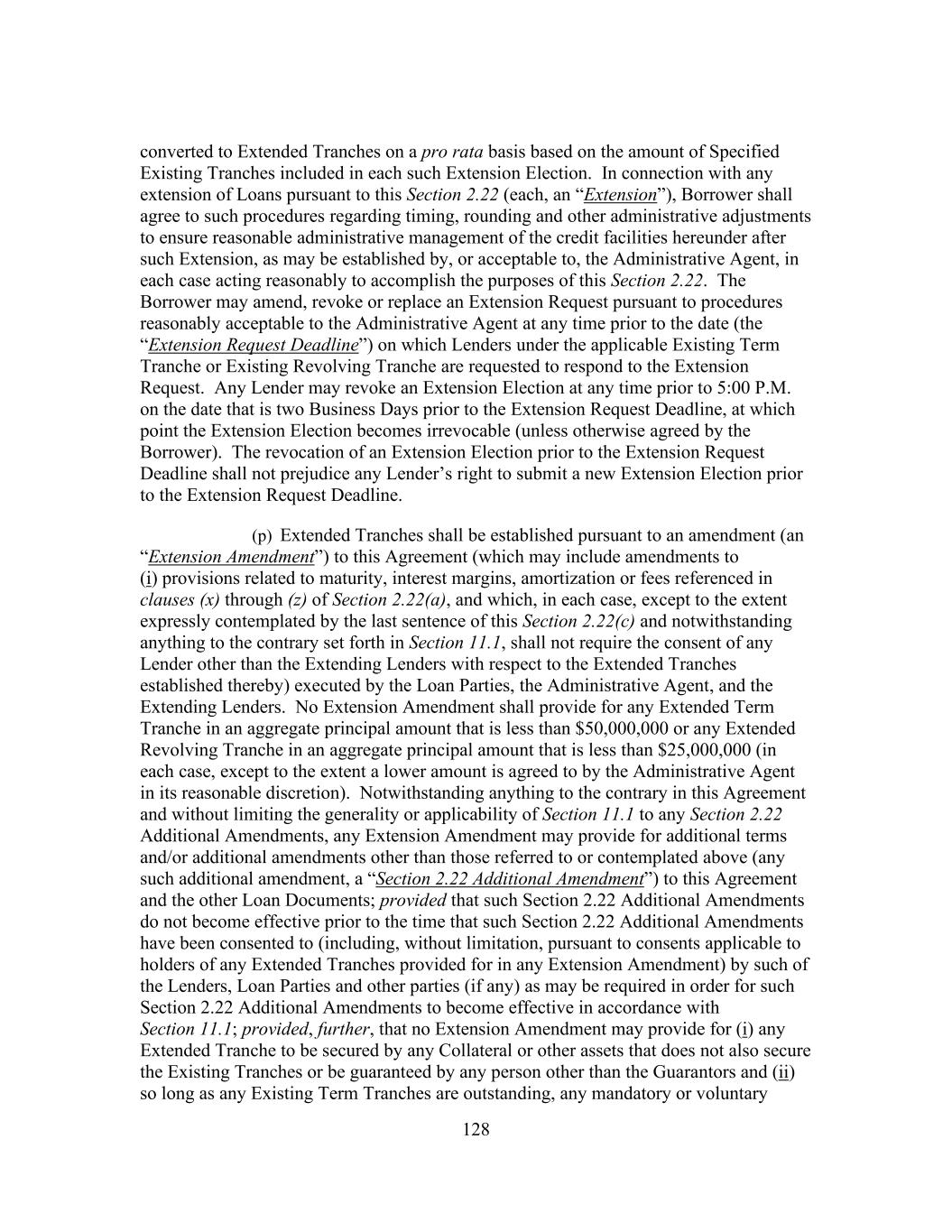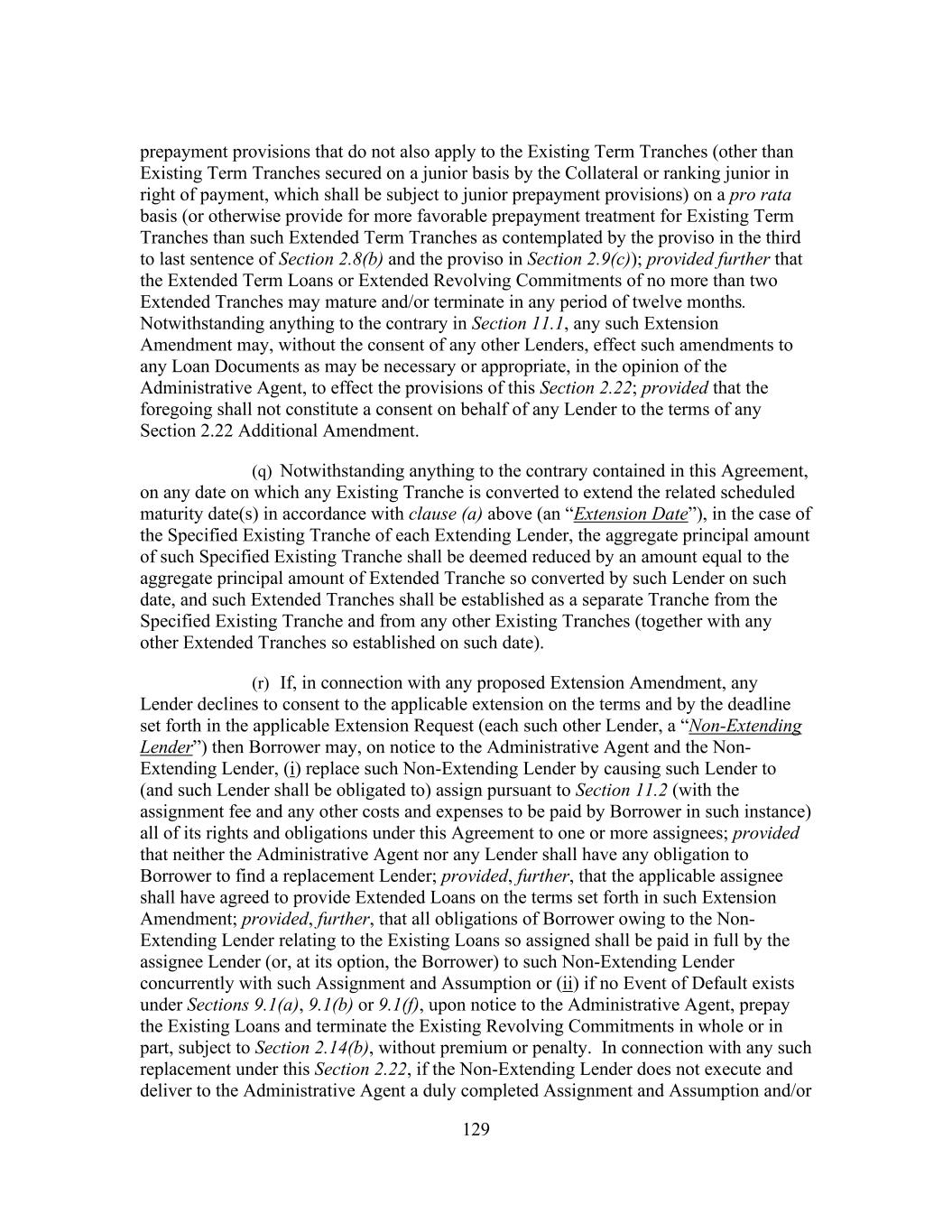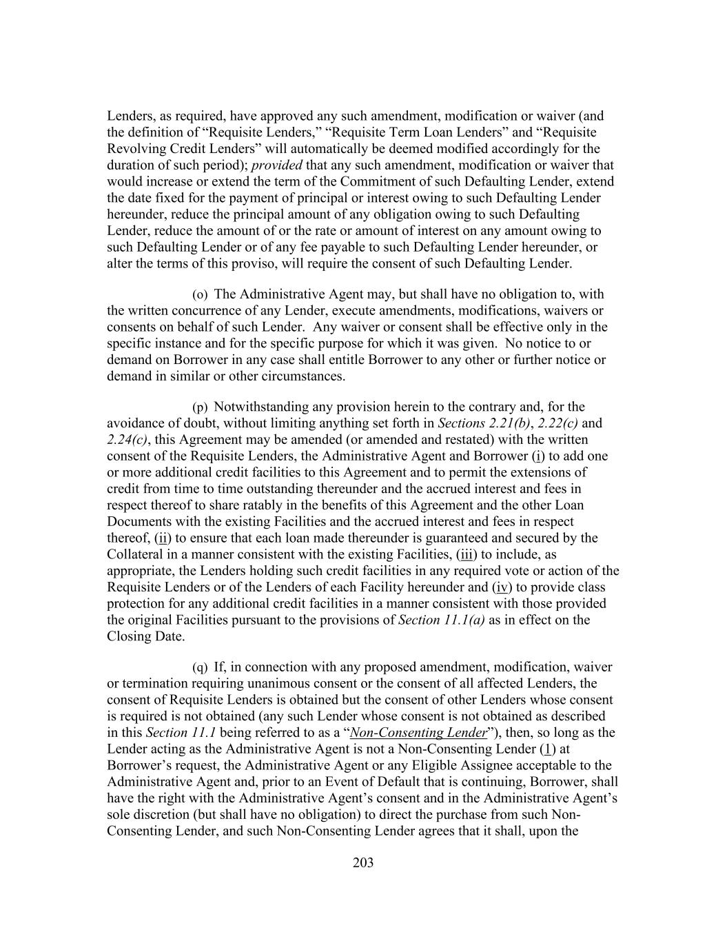 203 Lenders, as required, have approved any such amendment, modification or waiver (and the definition of “Requisite Lenders,” “Requisite Term Loan Lenders” and “Requisite Revolving Credit Lenders” will automatically be deemed modified accordingly for the duration of such period); provided that any such amendment, modification or waiver that would increase or extend the term of the Commitment of such Defaulting Lender, extend the date fixed for the payment of principal or interest owing to such Defaulting Lender hereunder, reduce the principal amount of any obligation owing to such Defaulting Lender, reduce the amount of or the rate or amount of interest on any amount owing to such Defaulting Lender or of any fee payable to such Defaulting Lender hereunder, or alter the terms of this proviso, will require the consent of such Defaulting Lender. (o) The Administrative Agent may, but shall have no obligation to, with the written concurrence of any Lender, execute amendments, modifications, waivers or consents on behalf of such Lender. Any waiver or consent shall be effective only in the specific instance and for the specific purpose for which it was given. No notice to or demand on Borrower in any case shall entitle Borrower to any other or further notice or demand in similar or other circumstances. (p) Notwithstanding any provision herein to the contrary and, for the avoidance of doubt, without limiting anything set forth in Sections 2.21(b), 2.22(c) and 2.24(c), this Agreement may be amended (or amended and restated) with the written consent of the Requisite Lenders, the Administrative Agent and Borrower (i) to add one or more additional credit facilities to this Agreement and to permit the extensions of credit from time to time outstanding thereunder and the accrued interest and fees in respect thereof to share ratably in the benefits of this Agreement and the other Loan Documents with the existing Facilities and the accrued interest and fees in respect thereof, (ii) to ensure that each loan made thereunder is guaranteed and secured by the Collateral in a manner consistent with the existing Facilities, (iii) to include, as appropriate, the Lenders holding such credit facilities in any required vote or action of the Requisite Lenders or of the Lenders of each Facility hereunder and (iv) to provide class protection for any additional credit facilities in a manner consistent with those provided the original Facilities pursuant to the provisions of Section 11.1(a) as in effect on the Closing Date. (q) If, in connection with any proposed amendment, modification, waiver or termination requiring unanimous consent or the consent of all affected Lenders, the consent of Requisite Lenders is obtained but the consent of other Lenders whose consent is required is not obtained (any such Lender whose consent is not obtained as described in this Section 11.1 being referred to as a “Non-Consenting Lender”), then, so long as the Lender acting as the Administrative Agent is not a Non-Consenting Lender (1) at Borrower’s request, the Administrative Agent or any Eligible Assignee acceptable to the Administrative Agent and, prior to an Event of Default that is continuing, Borrower, shall have the right with the Administrative Agent’s consent and in the Administrative Agent’s sole discretion (but shall have no obligation) to direct the purchase from such Non- Consenting Lender, and such Non-Consenting Lender agrees that it shall, upon the