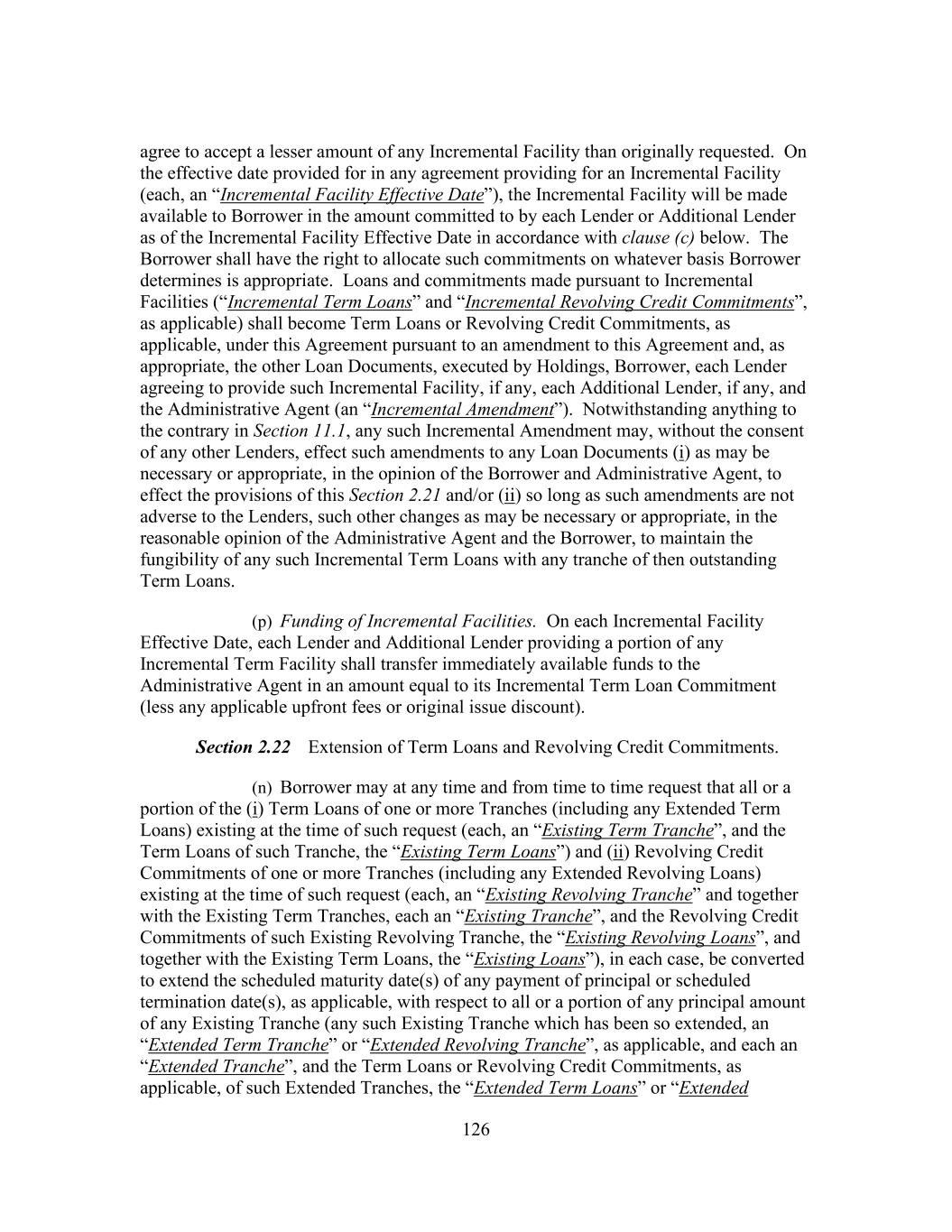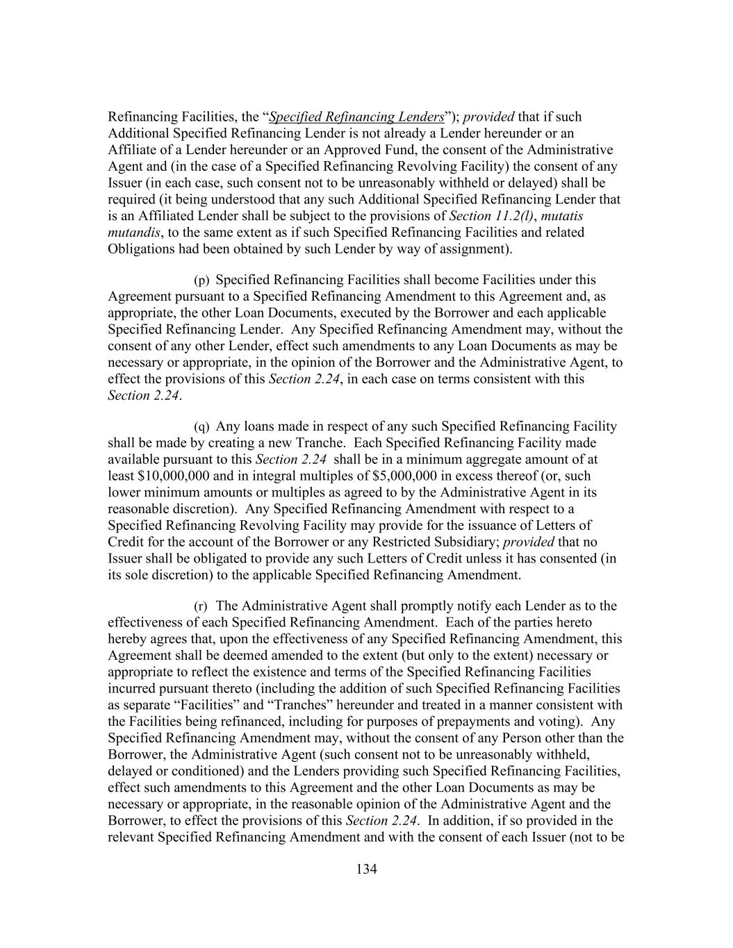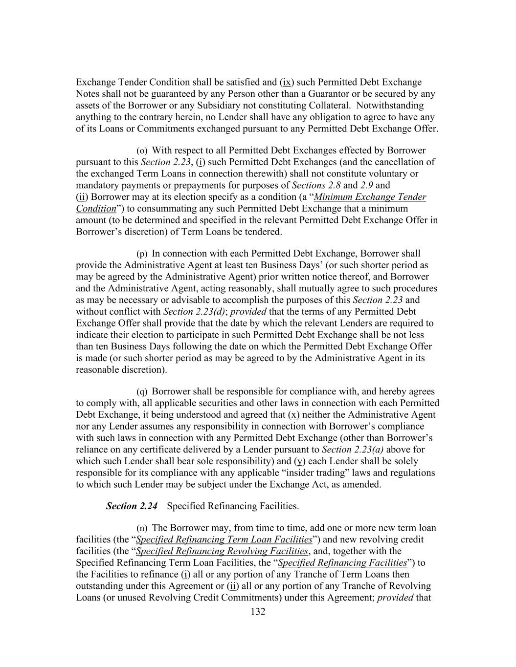 203 Lenders, as required, have approved any such amendment, modification or waiver (and the definition of “Requisite Lenders,” “Requisite Term Loan Lenders” and “Requisite Revolving Credit Lenders” will automatically be deemed modified accordingly for the duration of such period); provided that any such amendment, modification or waiver that would increase or extend the term of the Commitment of such Defaulting Lender, extend the date fixed for the payment of principal or interest owing to such Defaulting Lender hereunder, reduce the principal amount of any obligation owing to such Defaulting Lender, reduce the amount of or the rate or amount of interest on any amount owing to such Defaulting Lender or of any fee payable to such Defaulting Lender hereunder, or alter the terms of this proviso, will require the consent of such Defaulting Lender. (o) The Administrative Agent may, but shall have no obligation to, with the written concurrence of any Lender, execute amendments, modifications, waivers or consents on behalf of such Lender. Any waiver or consent shall be effective only in the specific instance and for the specific purpose for which it was given. No notice to or demand on Borrower in any case shall entitle Borrower to any other or further notice or demand in similar or other circumstances. (p) Notwithstanding any provision herein to the contrary and, for the avoidance of doubt, without limiting anything set forth in Sections 2.21(b), 2.22(c) and 2.24(c), this Agreement may be amended (or amended and restated) with the written consent of the Requisite Lenders, the Administrative Agent and Borrower (i) to add one or more additional credit facilities to this Agreement and to permit the extensions of credit from time to time outstanding thereunder and the accrued interest and fees in respect thereof to share ratably in the benefits of this Agreement and the other Loan Documents with the existing Facilities and the accrued interest and fees in respect thereof, (ii) to ensure that each loan made thereunder is guaranteed and secured by the Collateral in a manner consistent with the existing Facilities, (iii) to include, as appropriate, the Lenders holding such credit facilities in any required vote or action of the Requisite Lenders or of the Lenders of each Facility hereunder and (iv) to provide class protection for any additional credit facilities in a manner consistent with those provided the original Facilities pursuant to the provisions of Section 11.1(a) as in effect on the Closing Date. (q) If, in connection with any proposed amendment, modification, waiver or termination requiring unanimous consent or the consent of all affected Lenders, the consent of Requisite Lenders is obtained but the consent of other Lenders whose consent is required is not obtained (any such Lender whose consent is not obtained as described in this Section 11.1 being referred to as a “Non-Consenting Lender”), then, so long as the Lender acting as the Administrative Agent is not a Non-Consenting Lender (1) at Borrower’s request, the Administrative Agent or any Eligible Assignee acceptable to the Administrative Agent and, prior to an Event of Default that is continuing, Borrower, shall have the right with the Administrative Agent’s consent and in the Administrative Agent’s sole discretion (but shall have no obligation) to direct the purchase from such Non- Consenting Lender, and such Non-Consenting Lender agrees that it shall, upon the