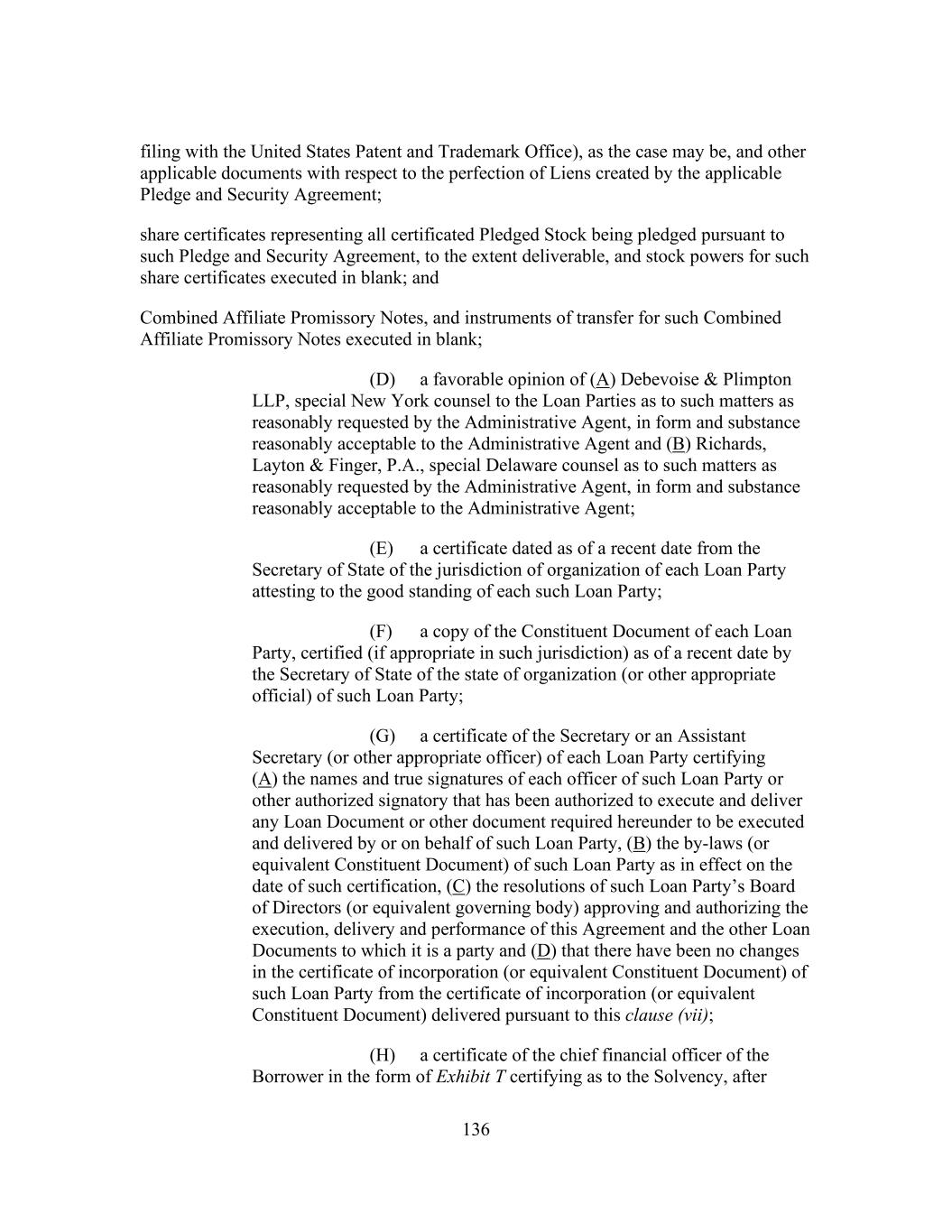 136 filing with the United States Patent and Trademark Office), as the case may be, and other applicable documents with respect to the perfection of Liens created by the applicable Pledge and Security Agreement; share certificates representing all certificated Pledged Stock being pledged pursuant to such Pledge and Security Agreement, to the extent deliverable, and stock powers for such share certificates executed in blank; and Combined Affiliate Promissory Notes, and instruments of transfer for such Combined Affiliate Promissory Notes executed in blank; (D) a favorable opinion of (A) Debevoise & Plimpton LLP, special New York counsel to the Loan Parties as to such matters as reasonably requested by the Administrative Agent, in form and substance reasonably acceptable to the Administrative Agent and (B) Richards, Layton & Finger, P.A., special Delaware counsel as to such matters as reasonably requested by the Administrative Agent, in form and substance reasonably acceptable to the Administrative Agent; (E) a certificate dated as of a recent date from the Secretary of State of the jurisdiction of organization of each Loan Party attesting to the good standing of each such Loan Party; (F) a copy of the Constituent Document of each Loan Party, certified (if appropriate in such jurisdiction) as of a recent date by the Secretary of State of the state of organization (or other appropriate official) of such Loan Party; (G) a certificate of the Secretary or an Assistant Secretary (or other appropriate officer) of each Loan Party certifying (A) the names and true signatures of each officer of such Loan Party or other authorized signatory that has been authorized to execute and deliver any Loan Document or other document required hereunder to be executed and delivered by or on behalf of such Loan Party, (B) the by-laws (or equivalent Constituent Document) of such Loan Party as in effect on the date of such certification, (C) the resolutions of such Loan Party’s Board of Directors (or equivalent governing body) approving and authorizing the execution, delivery and performance of this Agreement and the other Loan Documents to which it is a party and (D) that there have been no changes in the certificate of incorporation (or equivalent Constituent Document) of such Loan Party from the certificate of incorporation (or equivalent Constituent Document) delivered pursuant to this clause (vii); (H) a certificate of the chief financial officer of the Borrower in the form of Exhibit T certifying as to the Solvency, after