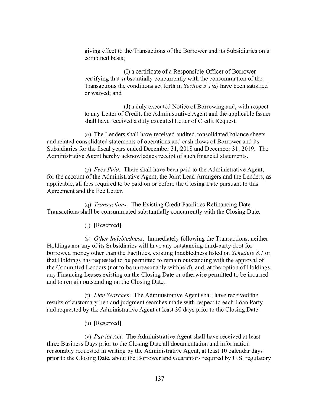 137 giving effect to the Transactions of the Borrower and its Subsidiaries on a combined basis; (I) a certificate of a Responsible Officer of Borrower certifying that substantially concurrently with the consummation of the Transactions the conditions set forth in Section 3.1(d) have been satisfied or waived; and (J) a duly executed Notice of Borrowing and, with respect to any Letter of Credit, the Administrative Agent and the applicable Issuer shall have received a duly executed Letter of Credit Request. (o) The Lenders shall have received audited consolidated balance sheets and related consolidated statements of operations and cash flows of Borrower and its Subsidiaries for the fiscal years ended December 31, 2018 and December 31, 2019. The Administrative Agent hereby acknowledges receipt of such financial statements. (p) Fees Paid. There shall have been paid to the Administrative Agent, for the account of the Administrative Agent, the Joint Lead Arrangers and the Lenders, as applicable, all fees required to be paid on or before the Closing Date pursuant to this Agreement and the Fee Letter. (q) Transactions. The Existing Credit Facilities Refinancing Date Transactions shall be consummated substantially concurrently with the Closing Date. (r) [Reserved]. (s) Other Indebtedness. Immediately following the Transactions, neither Holdings nor any of its Subsidiaries will have any outstanding third-party debt for borrowed money other than the Facilities, existing Indebtedness listed on Schedule 8.1 or that Holdings has requested to be permitted to remain outstanding with the approval of the Committed Lenders (not to be unreasonably withheld), and, at the option of Holdings, any Financing Leases existing on the Closing Date or otherwise permitted to be incurred and to remain outstanding on the Closing Date. (t) Lien Searches. The Administrative Agent shall have received the results of customary lien and judgment searches made with respect to each Loan Party and requested by the Administrative Agent at least 30 days prior to the Closing Date. (u) [Reserved]. (v) Patriot Act. The Administrative Agent shall have received at least three Business Days prior to the Closing Date all documentation and information reasonably requested in writing by the Administrative Agent, at least 10 calendar days prior to the Closing Date, about the Borrower and Guarantors required by U.S. regulatory