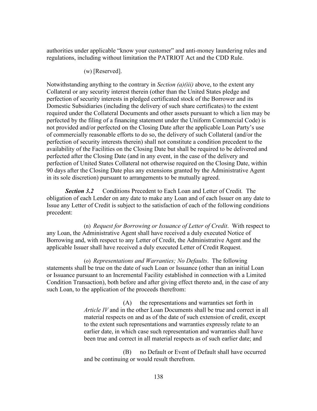 138 authorities under applicable “know your customer” and anti-money laundering rules and regulations, including without limitation the PATRIOT Act and the CDD Rule. (w) [Reserved]. Notwithstanding anything to the contrary in Section (a)(iii) above, to the extent any Collateral or any security interest therein (other than the United States pledge and perfection of security interests in pledged certificated stock of the Borrower and its Domestic Subsidiaries (including the delivery of such share certificates) to the extent required under the Collateral Documents and other assets pursuant to which a lien may be perfected by the filing of a financing statement under the Uniform Commercial Code) is not provided and/or perfected on the Closing Date after the applicable Loan Party’s use of commercially reasonable efforts to do so, the delivery of such Collateral (and/or the perfection of security interests therein) shall not constitute a condition precedent to the availability of the Facilities on the Closing Date but shall be required to be delivered and perfected after the Closing Date (and in any event, in the case of the delivery and perfection of United States Collateral not otherwise required on the Closing Date, within 90 days after the Closing Date plus any extensions granted by the Administrative Agent in its sole discretion) pursuant to arrangements to be mutually agreed. Section 3.2 Conditions Precedent to Each Loan and Letter of Credit. The obligation of each Lender on any date to make any Loan and of each Issuer on any date to Issue any Letter of Credit is subject to the satisfaction of each of the following conditions precedent: (n) Request for Borrowing or Issuance of Letter of Credit. With respect to any Loan, the Administrative Agent shall have received a duly executed Notice of Borrowing and, with respect to any Letter of Credit, the Administrative Agent and the applicable Issuer shall have received a duly executed Letter of Credit Request. (o) Representations and Warranties; No Defaults. The following statements shall be true on the date of such Loan or Issuance (other than an initial Loan or Issuance pursuant to an Incremental Facility established in connection with a Limited Condition Transaction), both before and after giving effect thereto and, in the case of any such Loan, to the application of the proceeds therefrom: (A) the representations and warranties set forth in Article IV and in the other Loan Documents shall be true and correct in all material respects on and as of the date of such extension of credit, except to the extent such representations and warranties expressly relate to an earlier date, in which case such representation and warranties shall have been true and correct in all material respects as of such earlier date; and (B) no Default or Event of Default shall have occurred and be continuing or would result therefrom.