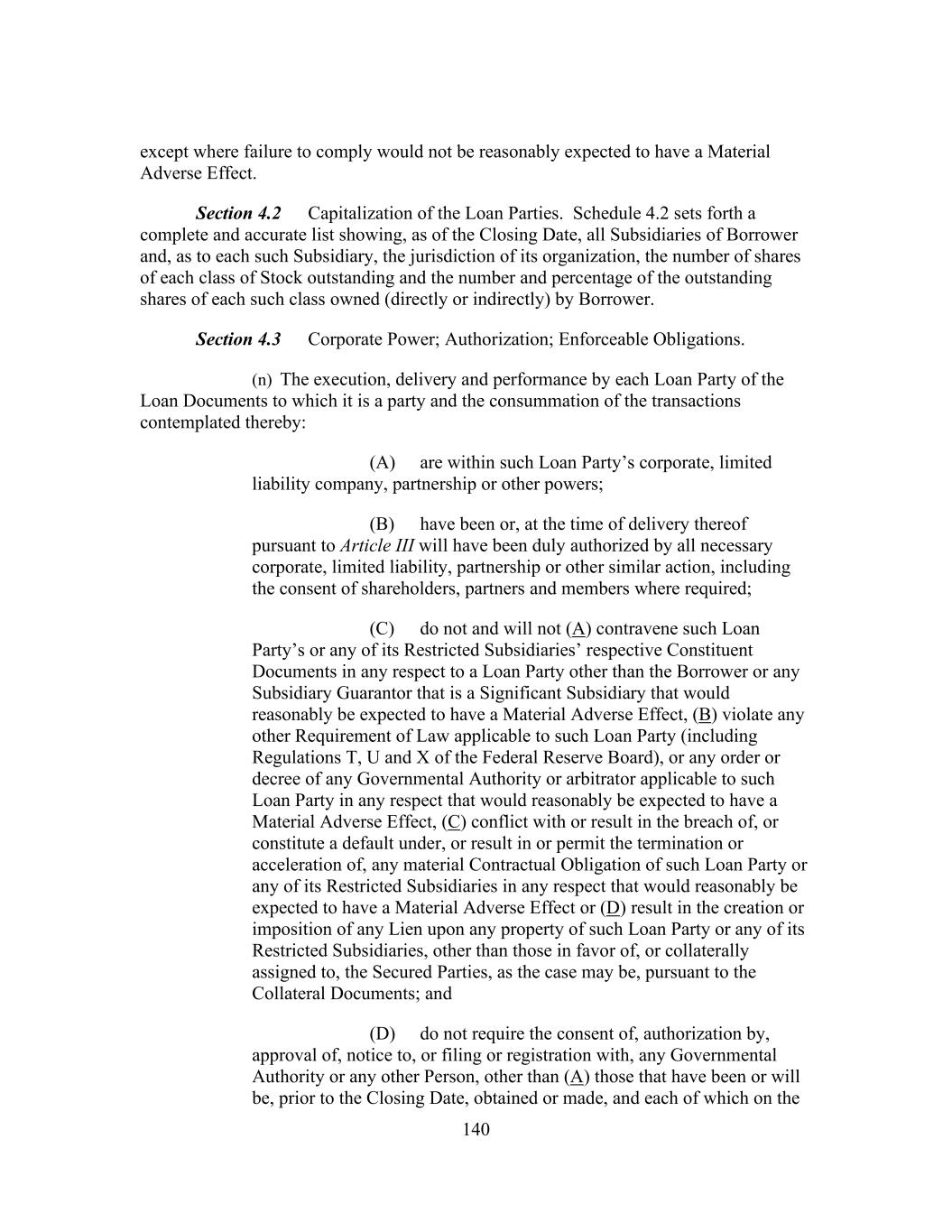 140 except where failure to comply would not be reasonably expected to have a Material Adverse Effect. Section 4.2 Capitalization of the Loan Parties. Schedule 4.2 sets forth a complete and accurate list showing, as of the Closing Date, all Subsidiaries of Borrower and, as to each such Subsidiary, the jurisdiction of its organization, the number of shares of each class of Stock outstanding and the number and percentage of the outstanding shares of each such class owned (directly or indirectly) by Borrower. Section 4.3 Corporate Power; Authorization; Enforceable Obligations. (n) The execution, delivery and performance by each Loan Party of the Loan Documents to which it is a party and the consummation of the transactions contemplated thereby: (A) are within such Loan Party’s corporate, limited liability company, partnership or other powers; (B) have been or, at the time of delivery thereof pursuant to Article III will have been duly authorized by all necessary corporate, limited liability, partnership or other similar action, including the consent of shareholders, partners and members where required; (C) do not and will not (A) contravene such Loan Party’s or any of its Restricted Subsidiaries’ respective Constituent Documents in any respect to a Loan Party other than the Borrower or any Subsidiary Guarantor that is a Significant Subsidiary that would reasonably be expected to have a Material Adverse Effect, (B) violate any other Requirement of Law applicable to such Loan Party (including Regulations T, U and X of the Federal Reserve Board), or any order or decree of any Governmental Authority or arbitrator applicable to such Loan Party in any respect that would reasonably be expected to have a Material Adverse Effect, (C) conflict with or result in the breach of, or constitute a default under, or result in or permit the termination or acceleration of, any material Contractual Obligation of such Loan Party or any of its Restricted Subsidiaries in any respect that would reasonably be expected to have a Material Adverse Effect or (D) result in the creation or imposition of any Lien upon any property of such Loan Party or any of its Restricted Subsidiaries, other than those in favor of, or collaterally assigned to, the Secured Parties, as the case may be, pursuant to the Collateral Documents; and (D) do not require the consent of, authorization by, approval of, notice to, or filing or registration with, any Governmental Authority or any other Person, other than (A) those that have been or will be, prior to the Closing Date, obtained or made, and each of which on the