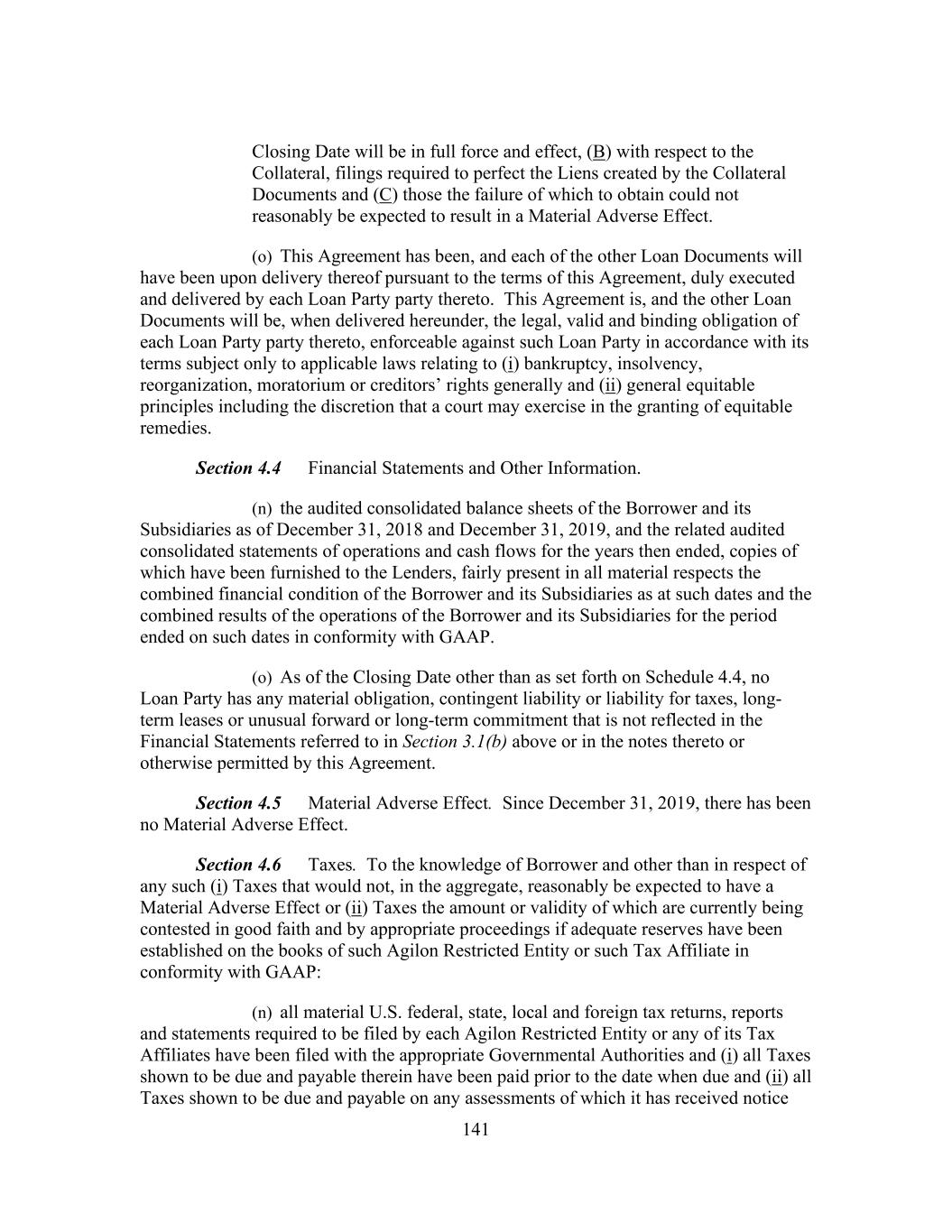 141 Closing Date will be in full force and effect, (B) with respect to the Collateral, filings required to perfect the Liens created by the Collateral Documents and (C) those the failure of which to obtain could not reasonably be expected to result in a Material Adverse Effect. (o) This Agreement has been, and each of the other Loan Documents will have been upon delivery thereof pursuant to the terms of this Agreement, duly executed and delivered by each Loan Party party thereto. This Agreement is, and the other Loan Documents will be, when delivered hereunder, the legal, valid and binding obligation of each Loan Party party thereto, enforceable against such Loan Party in accordance with its terms subject only to applicable laws relating to (i) bankruptcy, insolvency, reorganization, moratorium or creditors’ rights generally and (ii) general equitable principles including the discretion that a court may exercise in the granting of equitable remedies. Section 4.4 Financial Statements and Other Information. (n) the audited consolidated balance sheets of the Borrower and its Subsidiaries as of December 31, 2018 and December 31, 2019, and the related audited consolidated statements of operations and cash flows for the years then ended, copies of which have been furnished to the Lenders, fairly present in all material respects the combined financial condition of the Borrower and its Subsidiaries as at such dates and the combined results of the operations of the Borrower and its Subsidiaries for the period ended on such dates in conformity with GAAP. (o) As of the Closing Date other than as set forth on Schedule 4.4, no Loan Party has any material obligation, contingent liability or liability for taxes, long- term leases or unusual forward or long-term commitment that is not reflected in the Financial Statements referred to in Section 3.1(b) above or in the notes thereto or otherwise permitted by this Agreement. Section 4.5 Material Adverse Effect. Since December 31, 2019, there has been no Material Adverse Effect. Section 4.6 Taxes. To the knowledge of Borrower and other than in respect of any such (i) Taxes that would not, in the aggregate, reasonably be expected to have a Material Adverse Effect or (ii) Taxes the amount or validity of which are currently being contested in good faith and by appropriate proceedings if adequate reserves have been established on the books of such Agilon Restricted Entity or such Tax Affiliate in conformity with GAAP: (n) all material U.S. federal, state, local and foreign tax returns, reports and statements required to be filed by each Agilon Restricted Entity or any of its Tax Affiliates have been filed with the appropriate Governmental Authorities and (i) all Taxes shown to be due and payable therein have been paid prior to the date when due and (ii) all Taxes shown to be due and payable on any assessments of which it has received notice