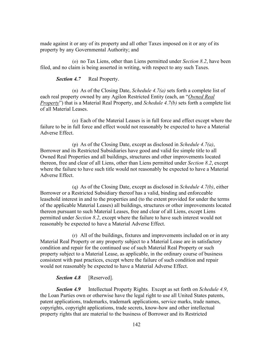 142 made against it or any of its property and all other Taxes imposed on it or any of its property by any Governmental Authority; and (o) no Tax Liens, other than Liens permitted under Section 8.2, have been filed, and no claim is being asserted in writing, with respect to any such Taxes. Section 4.7 Real Property. (n) As of the Closing Date, Schedule 4.7(a) sets forth a complete list of each real property owned by any Agilon Restricted Entity (each, an “Owned Real Property”) that is a Material Real Property, and Schedule 4.7(b) sets forth a complete list of all Material Leases. (o) Each of the Material Leases is in full force and effect except where the failure to be in full force and effect would not reasonably be expected to have a Material Adverse Effect. (p) As of the Closing Date, except as disclosed in Schedule 4.7(a), Borrower and its Restricted Subsidiaries have good and valid fee simple title to all Owned Real Properties and all buildings, structures and other improvements located thereon, free and clear of all Liens, other than Liens permitted under Section 8.2, except where the failure to have such title would not reasonably be expected to have a Material Adverse Effect. (q) As of the Closing Date, except as disclosed in Schedule 4.7(b), either Borrower or a Restricted Subsidiary thereof has a valid, binding and enforceable leasehold interest in and to the properties and (to the extent provided for under the terms of the applicable Material Leases) all buildings, structures or other improvements located thereon pursuant to such Material Leases, free and clear of all Liens, except Liens permitted under Section 8.2, except where the failure to have such interest would not reasonably be expected to have a Material Adverse Effect. (r) All of the buildings, fixtures and improvements included on or in any Material Real Property or any property subject to a Material Lease are in satisfactory condition and repair for the continued use of such Material Real Property or such property subject to a Material Lease, as applicable, in the ordinary course of business consistent with past practices, except where the failure of such condition and repair would not reasonably be expected to have a Material Adverse Effect. Section 4.8 [Reserved]. Section 4.9 Intellectual Property Rights. Except as set forth on Schedule 4.9, the Loan Parties own or otherwise have the legal right to use all United States patents, patent applications, trademarks, trademark applications, service marks, trade names, copyrights, copyright applications, trade secrets, know-how and other intellectual property rights that are material to the business of Borrower and its Restricted