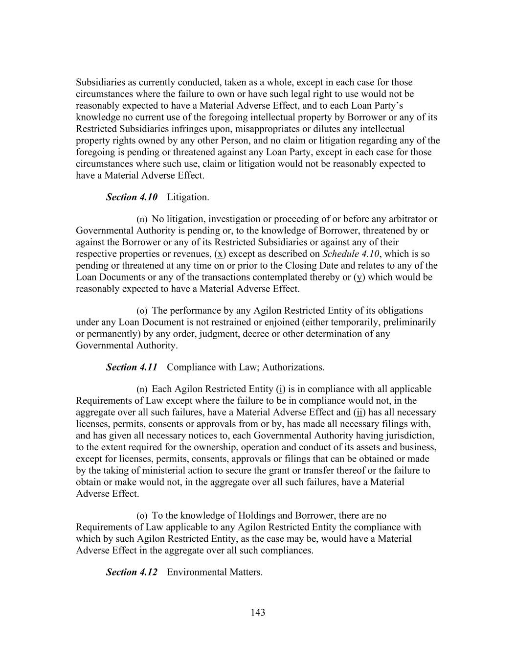 143 Subsidiaries as currently conducted, taken as a whole, except in each case for those circumstances where the failure to own or have such legal right to use would not be reasonably expected to have a Material Adverse Effect, and to each Loan Party’s knowledge no current use of the foregoing intellectual property by Borrower or any of its Restricted Subsidiaries infringes upon, misappropriates or dilutes any intellectual property rights owned by any other Person, and no claim or litigation regarding any of the foregoing is pending or threatened against any Loan Party, except in each case for those circumstances where such use, claim or litigation would not be reasonably expected to have a Material Adverse Effect. Section 4.10 Litigation. (n) No litigation, investigation or proceeding of or before any arbitrator or Governmental Authority is pending or, to the knowledge of Borrower, threatened by or against the Borrower or any of its Restricted Subsidiaries or against any of their respective properties or revenues, (x) except as described on Schedule 4.10, which is so pending or threatened at any time on or prior to the Closing Date and relates to any of the Loan Documents or any of the transactions contemplated thereby or (y) which would be reasonably expected to have a Material Adverse Effect. (o) The performance by any Agilon Restricted Entity of its obligations under any Loan Document is not restrained or enjoined (either temporarily, preliminarily or permanently) by any order, judgment, decree or other determination of any Governmental Authority. Section 4.11 Compliance with Law; Authorizations. (n) Each Agilon Restricted Entity (i) is in compliance with all applicable Requirements of Law except where the failure to be in compliance would not, in the aggregate over all such failures, have a Material Adverse Effect and (ii) has all necessary licenses, permits, consents or approvals from or by, has made all necessary filings with, and has given all necessary notices to, each Governmental Authority having jurisdiction, to the extent required for the ownership, operation and conduct of its assets and business, except for licenses, permits, consents, approvals or filings that can be obtained or made by the taking of ministerial action to secure the grant or transfer thereof or the failure to obtain or make would not, in the aggregate over all such failures, have a Material Adverse Effect. (o) To the knowledge of Holdings and Borrower, there are no Requirements of Law applicable to any Agilon Restricted Entity the compliance with which by such Agilon Restricted Entity, as the case may be, would have a Material Adverse Effect in the aggregate over all such compliances. Section 4.12 Environmental Matters.