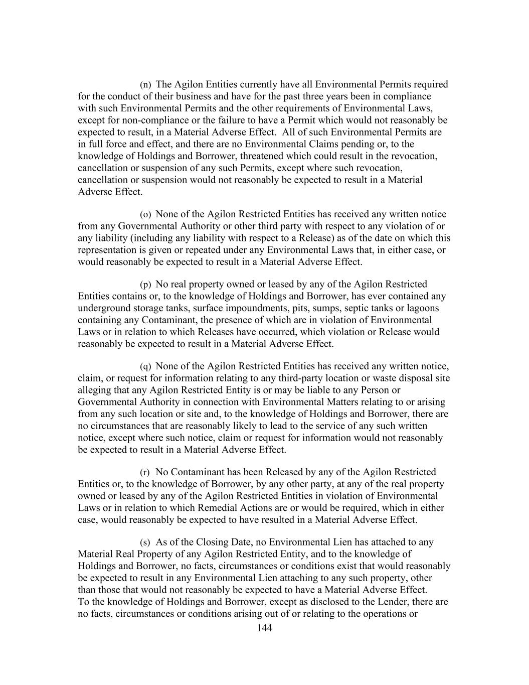 144 (n) The Agilon Entities currently have all Environmental Permits required for the conduct of their business and have for the past three years been in compliance with such Environmental Permits and the other requirements of Environmental Laws, except for non-compliance or the failure to have a Permit which would not reasonably be expected to result, in a Material Adverse Effect. All of such Environmental Permits are in full force and effect, and there are no Environmental Claims pending or, to the knowledge of Holdings and Borrower, threatened which could result in the revocation, cancellation or suspension of any such Permits, except where such revocation, cancellation or suspension would not reasonably be expected to result in a Material Adverse Effect. (o) None of the Agilon Restricted Entities has received any written notice from any Governmental Authority or other third party with respect to any violation of or any liability (including any liability with respect to a Release) as of the date on which this representation is given or repeated under any Environmental Laws that, in either case, or would reasonably be expected to result in a Material Adverse Effect. (p) No real property owned or leased by any of the Agilon Restricted Entities contains or, to the knowledge of Holdings and Borrower, has ever contained any underground storage tanks, surface impoundments, pits, sumps, septic tanks or lagoons containing any Contaminant, the presence of which are in violation of Environmental Laws or in relation to which Releases have occurred, which violation or Release would reasonably be expected to result in a Material Adverse Effect. (q) None of the Agilon Restricted Entities has received any written notice, claim, or request for information relating to any third-party location or waste disposal site alleging that any Agilon Restricted Entity is or may be liable to any Person or Governmental Authority in connection with Environmental Matters relating to or arising from any such location or site and, to the knowledge of Holdings and Borrower, there are no circumstances that are reasonably likely to lead to the service of any such written notice, except where such notice, claim or request for information would not reasonably be expected to result in a Material Adverse Effect. (r) No Contaminant has been Released by any of the Agilon Restricted Entities or, to the knowledge of Borrower, by any other party, at any of the real property owned or leased by any of the Agilon Restricted Entities in violation of Environmental Laws or in relation to which Remedial Actions are or would be required, which in either case, would reasonably be expected to have resulted in a Material Adverse Effect. (s) As of the Closing Date, no Environmental Lien has attached to any Material Real Property of any Agilon Restricted Entity, and to the knowledge of Holdings and Borrower, no facts, circumstances or conditions exist that would reasonably be expected to result in any Environmental Lien attaching to any such property, other than those that would not reasonably be expected to have a Material Adverse Effect. To the knowledge of Holdings and Borrower, except as disclosed to the Lender, there are no facts, circumstances or conditions arising out of or relating to the operations or