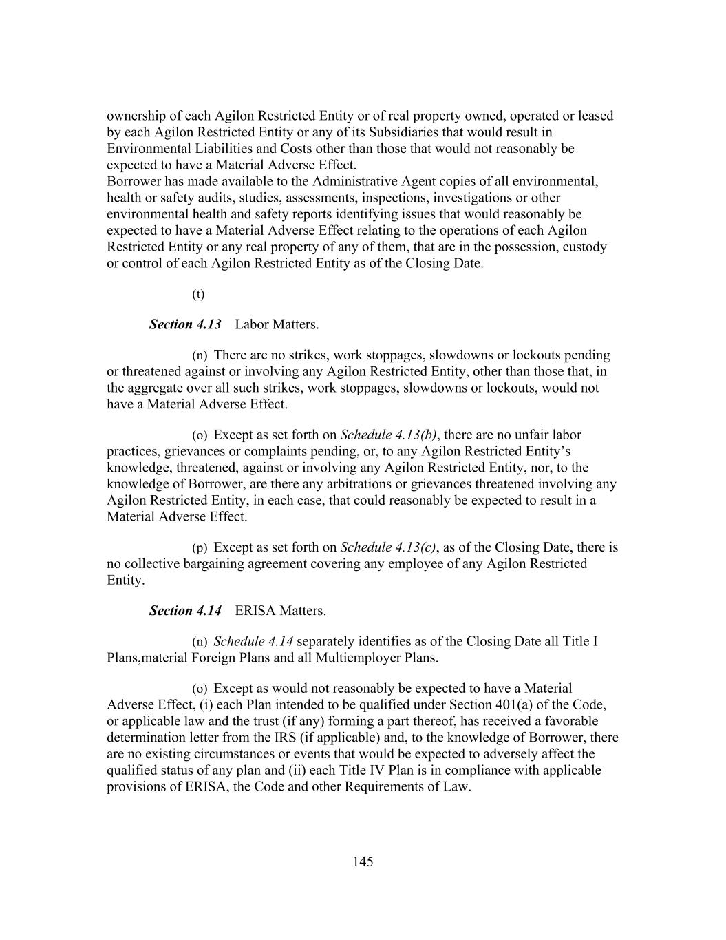 145 ownership of each Agilon Restricted Entity or of real property owned, operated or leased by each Agilon Restricted Entity or any of its Subsidiaries that would result in Environmental Liabilities and Costs other than those that would not reasonably be expected to have a Material Adverse Effect. Borrower has made available to the Administrative Agent copies of all environmental, health or safety audits, studies, assessments, inspections, investigations or other environmental health and safety reports identifying issues that would reasonably be expected to have a Material Adverse Effect relating to the operations of each Agilon Restricted Entity or any real property of any of them, that are in the possession, custody or control of each Agilon Restricted Entity as of the Closing Date. (t) Section 4.13 Labor Matters. (n) There are no strikes, work stoppages, slowdowns or lockouts pending or threatened against or involving any Agilon Restricted Entity, other than those that, in the aggregate over all such strikes, work stoppages, slowdowns or lockouts, would not have a Material Adverse Effect. (o) Except as set forth on Schedule 4.13(b), there are no unfair labor practices, grievances or complaints pending, or, to any Agilon Restricted Entity’s knowledge, threatened, against or involving any Agilon Restricted Entity, nor, to the knowledge of Borrower, are there any arbitrations or grievances threatened involving any Agilon Restricted Entity, in each case, that could reasonably be expected to result in a Material Adverse Effect. (p) Except as set forth on Schedule 4.13(c), as of the Closing Date, there is no collective bargaining agreement covering any employee of any Agilon Restricted Entity. Section 4.14 ERISA Matters. (n) Schedule 4.14 separately identifies as of the Closing Date all Title I Plans,material Foreign Plans and all Multiemployer Plans. (o) Except as would not reasonably be expected to have a Material Adverse Effect, (i) each Plan intended to be qualified under Section 401(a) of the Code, or applicable law and the trust (if any) forming a part thereof, has received a favorable determination letter from the IRS (if applicable) and, to the knowledge of Borrower, there are no existing circumstances or events that would be expected to adversely affect the qualified status of any plan and (ii) each Title IV Plan is in compliance with applicable provisions of ERISA, the Code and other Requirements of Law.