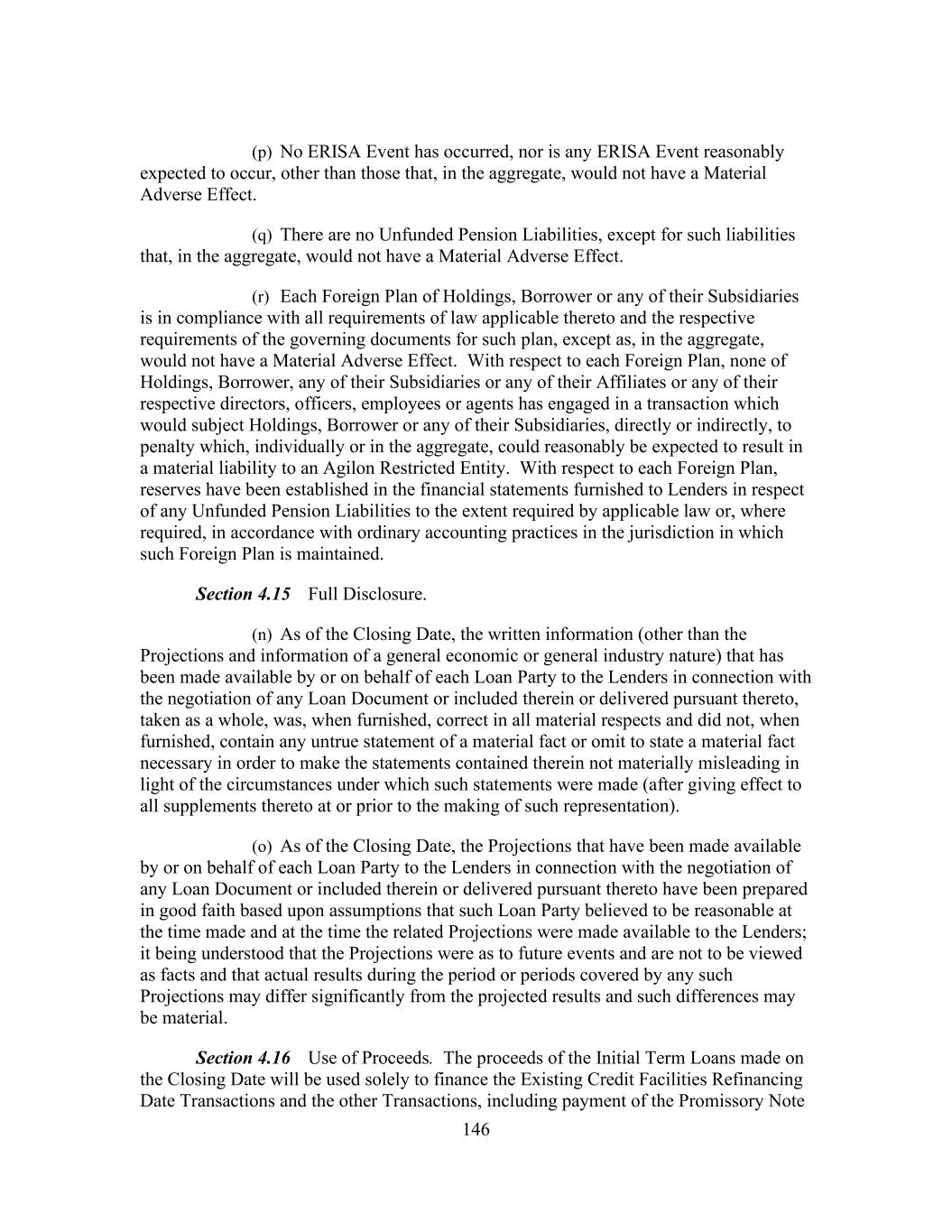 146 (p) No ERISA Event has occurred, nor is any ERISA Event reasonably expected to occur, other than those that, in the aggregate, would not have a Material Adverse Effect. (q) There are no Unfunded Pension Liabilities, except for such liabilities that, in the aggregate, would not have a Material Adverse Effect. (r) Each Foreign Plan of Holdings, Borrower or any of their Subsidiaries is in compliance with all requirements of law applicable thereto and the respective requirements of the governing documents for such plan, except as, in the aggregate, would not have a Material Adverse Effect. With respect to each Foreign Plan, none of Holdings, Borrower, any of their Subsidiaries or any of their Affiliates or any of their respective directors, officers, employees or agents has engaged in a transaction which would subject Holdings, Borrower or any of their Subsidiaries, directly or indirectly, to penalty which, individually or in the aggregate, could reasonably be expected to result in a material liability to an Agilon Restricted Entity. With respect to each Foreign Plan, reserves have been established in the financial statements furnished to Lenders in respect of any Unfunded Pension Liabilities to the extent required by applicable law or, where required, in accordance with ordinary accounting practices in the jurisdiction in which such Foreign Plan is maintained. Section 4.15 Full Disclosure. (n) As of the Closing Date, the written information (other than the Projections and information of a general economic or general industry nature) that has been made available by or on behalf of each Loan Party to the Lenders in connection with the negotiation of any Loan Document or included therein or delivered pursuant thereto, taken as a whole, was, when furnished, correct in all material respects and did not, when furnished, contain any untrue statement of a material fact or omit to state a material fact necessary in order to make the statements contained therein not materially misleading in light of the circumstances under which such statements were made (after giving effect to all supplements thereto at or prior to the making of such representation). (o) As of the Closing Date, the Projections that have been made available by or on behalf of each Loan Party to the Lenders in connection with the negotiation of any Loan Document or included therein or delivered pursuant thereto have been prepared in good faith based upon assumptions that such Loan Party believed to be reasonable at the time made and at the time the related Projections were made available to the Lenders; it being understood that the Projections were as to future events and are not to be viewed as facts and that actual results during the period or periods covered by any such Projections may differ significantly from the projected results and such differences may be material. Section 4.16 Use of Proceeds. The proceeds of the Initial Term Loans made on the Closing Date will be used solely to finance the Existing Credit Facilities Refinancing Date Transactions and the other Transactions, including payment of the Promissory Note