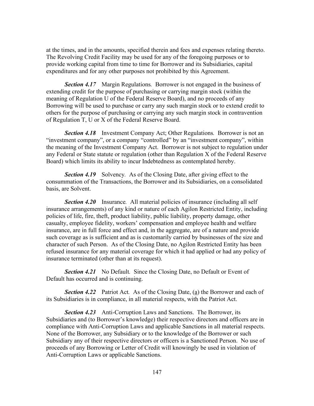 147 at the times, and in the amounts, specified therein and fees and expenses relating thereto. The Revolving Credit Facility may be used for any of the foregoing purposes or to provide working capital from time to time for Borrower and its Subsidiaries, capital expenditures and for any other purposes not prohibited by this Agreement. Section 4.17 Margin Regulations. Borrower is not engaged in the business of extending credit for the purpose of purchasing or carrying margin stock (within the meaning of Regulation U of the Federal Reserve Board), and no proceeds of any Borrowing will be used to purchase or carry any such margin stock or to extend credit to others for the purpose of purchasing or carrying any such margin stock in contravention of Regulation T, U or X of the Federal Reserve Board. Section 4.18 Investment Company Act; Other Regulations. Borrower is not an “investment company”, or a company “controlled” by an “investment company”, within the meaning of the Investment Company Act. Borrower is not subject to regulation under any Federal or State statute or regulation (other than Regulation X of the Federal Reserve Board) which limits its ability to incur Indebtedness as contemplated hereby. Section 4.19 Solvency. As of the Closing Date, after giving effect to the consummation of the Transactions, the Borrower and its Subsidiaries, on a consolidated basis, are Solvent. Section 4.20 Insurance. All material policies of insurance (including all self insurance arrangements) of any kind or nature of each Agilon Restricted Entity, including policies of life, fire, theft, product liability, public liability, property damage, other casualty, employee fidelity, workers’ compensation and employee health and welfare insurance, are in full force and effect and, in the aggregate, are of a nature and provide such coverage as is sufficient and as is customarily carried by businesses of the size and character of such Person. As of the Closing Date, no Agilon Restricted Entity has been refused insurance for any material coverage for which it had applied or had any policy of insurance terminated (other than at its request). Section 4.21 No Default. Since the Closing Date, no Default or Event of Default has occurred and is continuing. Section 4.22 Patriot Act. As of the Closing Date, (a) the Borrower and each of its Subsidiaries is in compliance, in all material respects, with the Patriot Act. Section 4.23 Anti-Corruption Laws and Sanctions. The Borrower, its Subsidiaries and (to Borrower’s knowledge) their respective directors and officers are in compliance with Anti-Corruption Laws and applicable Sanctions in all material respects. None of the Borrower, any Subsidiary or to the knowledge of the Borrower or such Subsidiary any of their respective directors or officers is a Sanctioned Person. No use of proceeds of any Borrowing or Letter of Credit will knowingly be used in violation of Anti-Corruption Laws or applicable Sanctions.